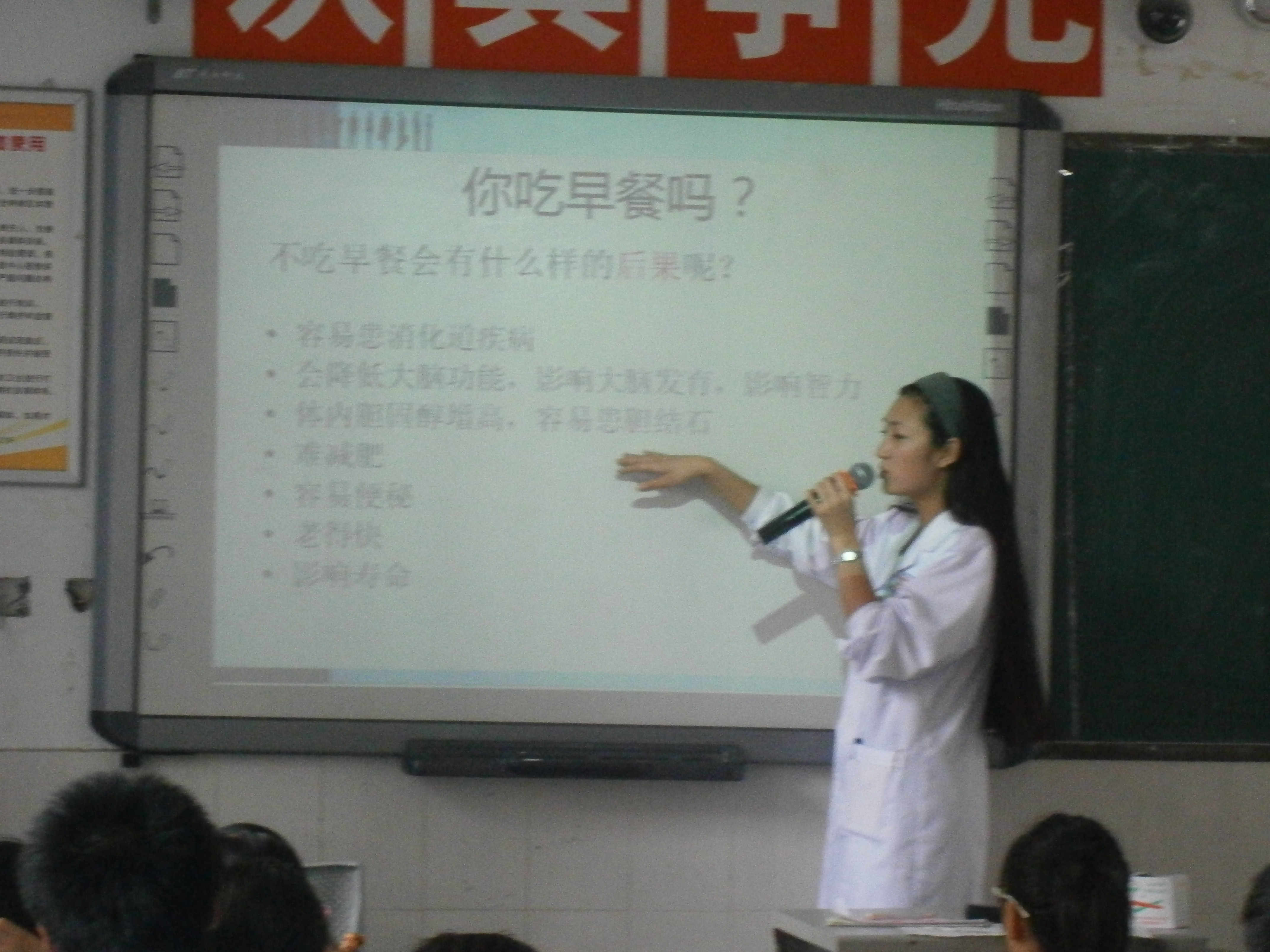 在活動中,同學(xué)們認(rèn)真聽講,積極發(fā)言。志愿者們非常熱情,他們詼諧幽默的講解,活躍了課堂氣氛,增加了同學(xué)們的飲食健康知識,使同學(xué)們認(rèn)識到了合理膳食的重要性。
