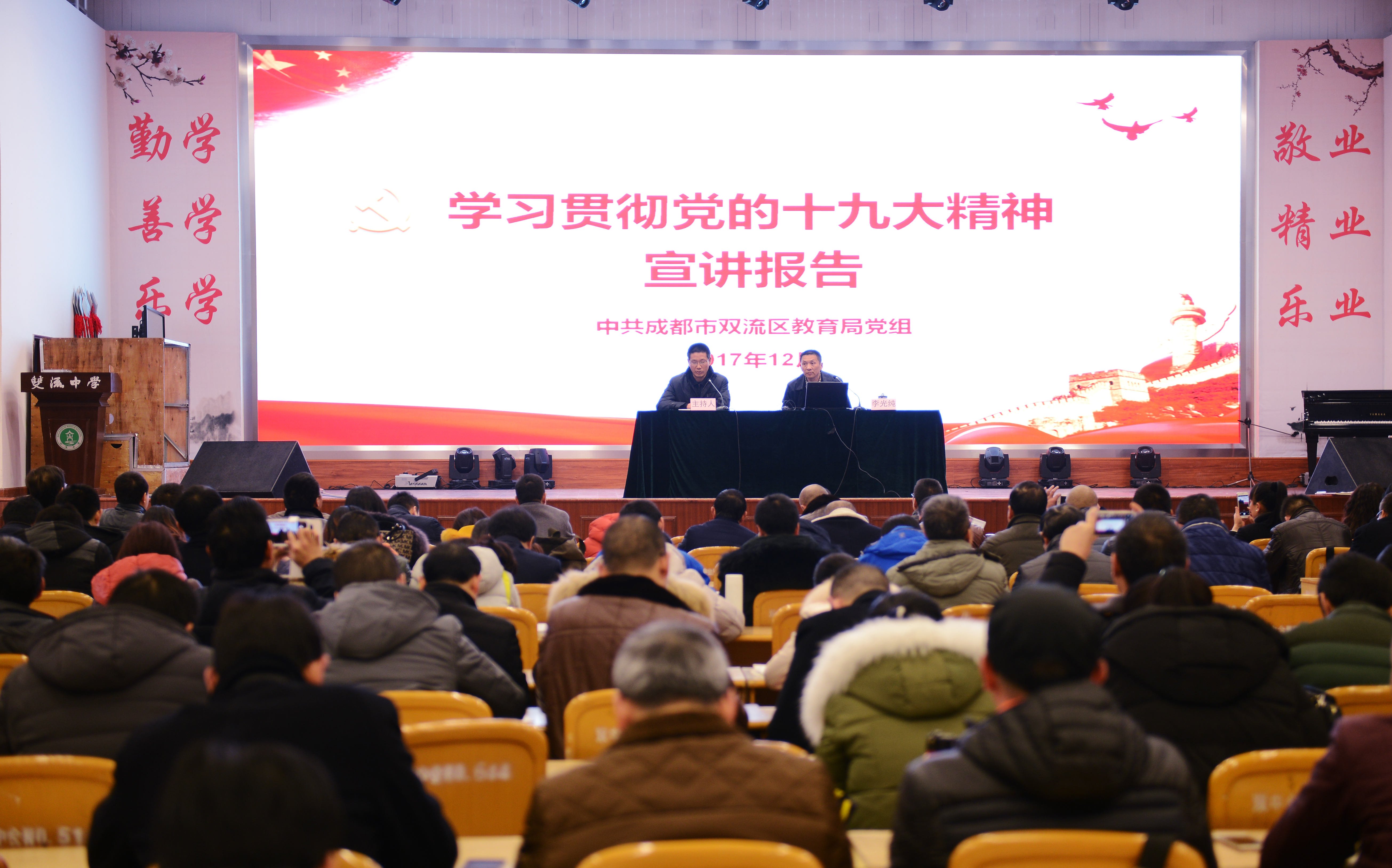 為了貫徹落實黨的方針政策,推進十九大工作順利開展,2017年12月21日,雙流區(qū)教育局黨組書記、局長李光純同志赴雙流中學(xué)作了題為“學(xué)習(xí)貫徹黨的十九大精神”的宣講報告。此次會議由雙流中學(xué)黨總支副書記向發(fā)友同志主持,雙流中學(xué)全體教職員工全程參與。