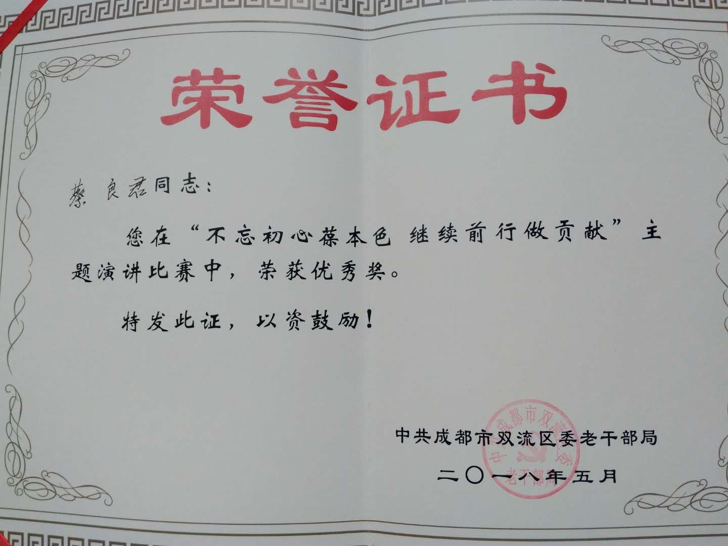在昨日結(jié)束的全區(qū)退休干部演講活動(dòng)中雙流中學(xué)老師蔡良君一路過關(guān)斬將,經(jīng)預(yù)賽、決賽最后榮獲優(yōu)秀獎(jiǎng)。