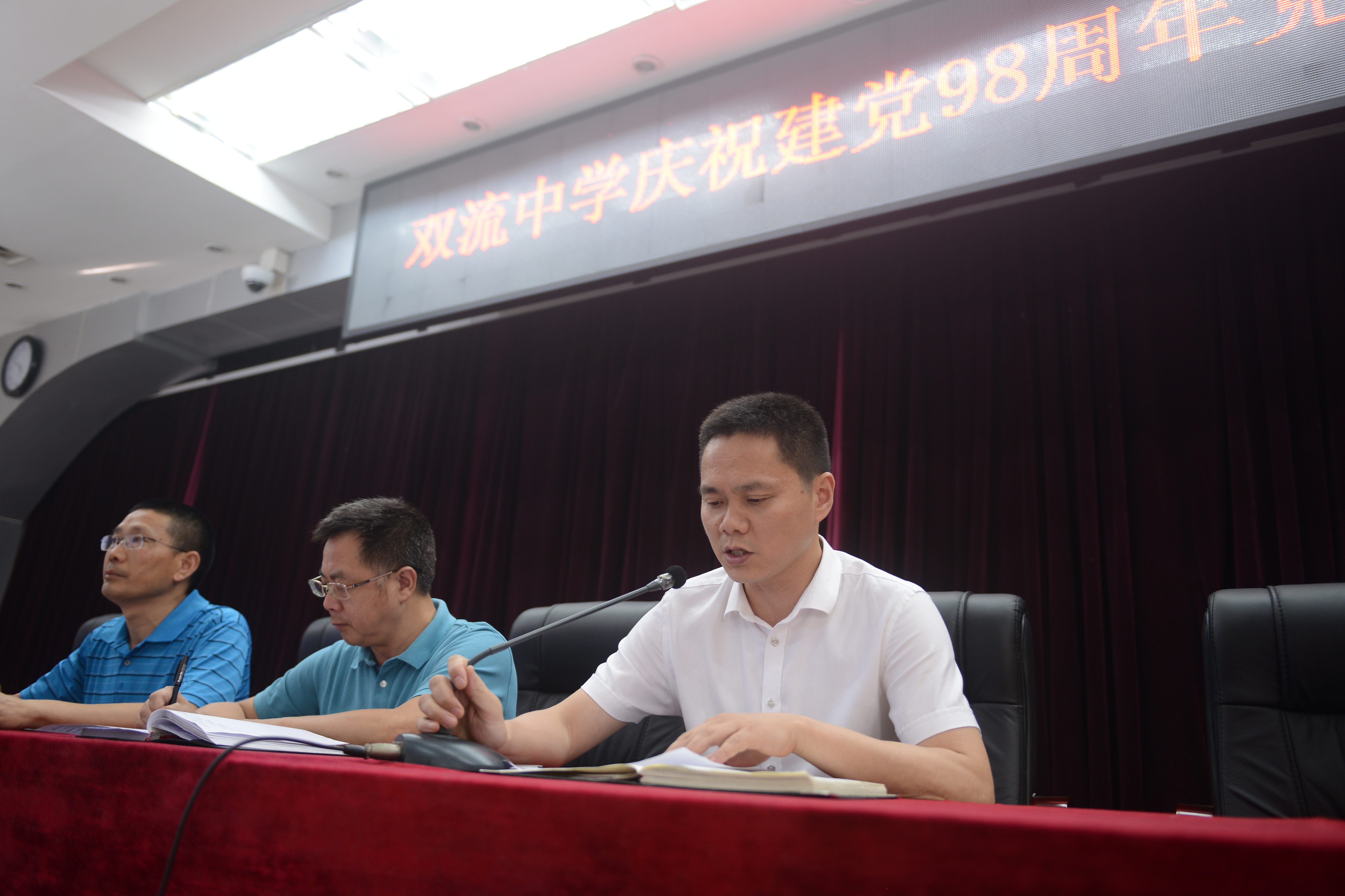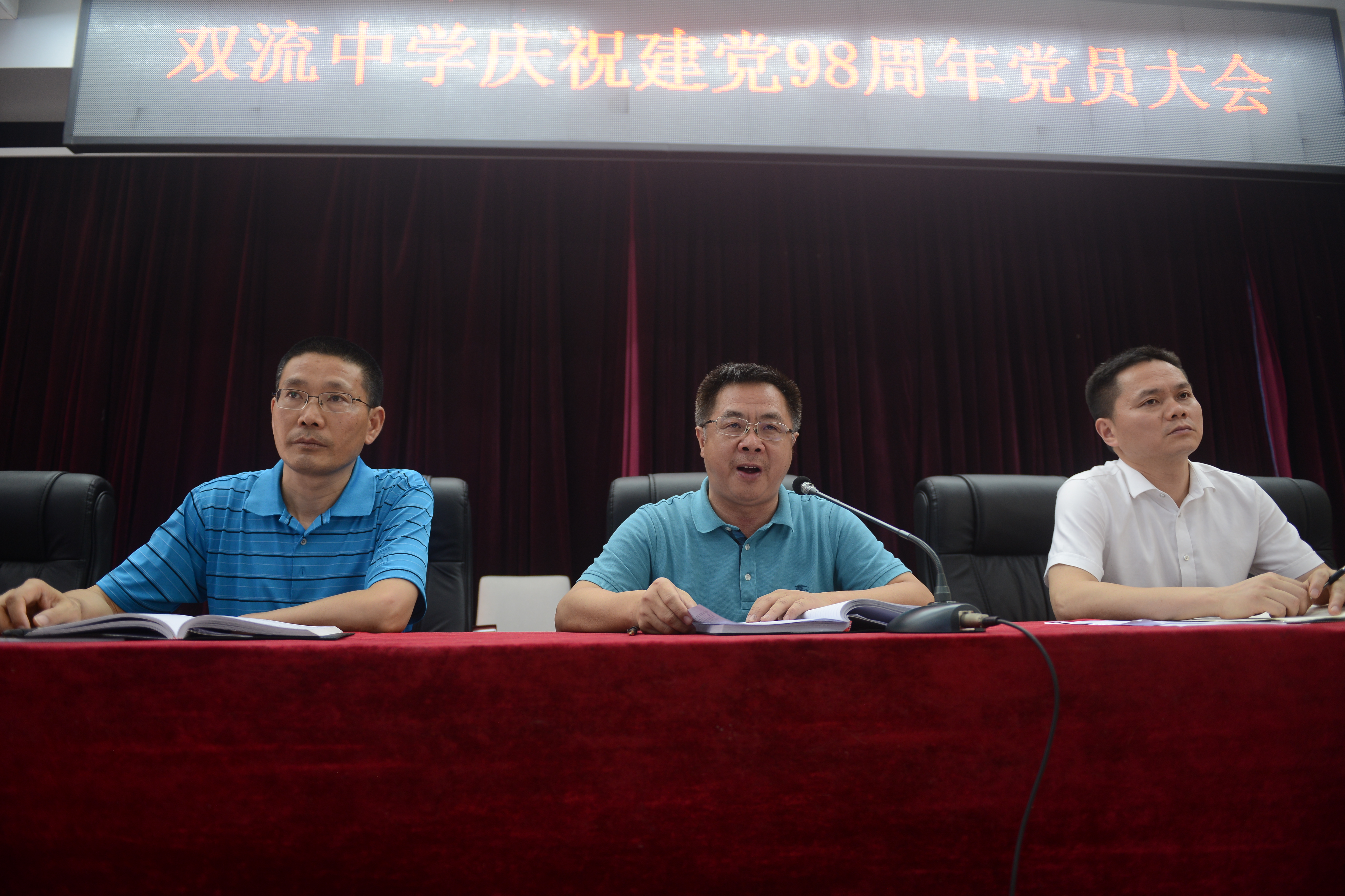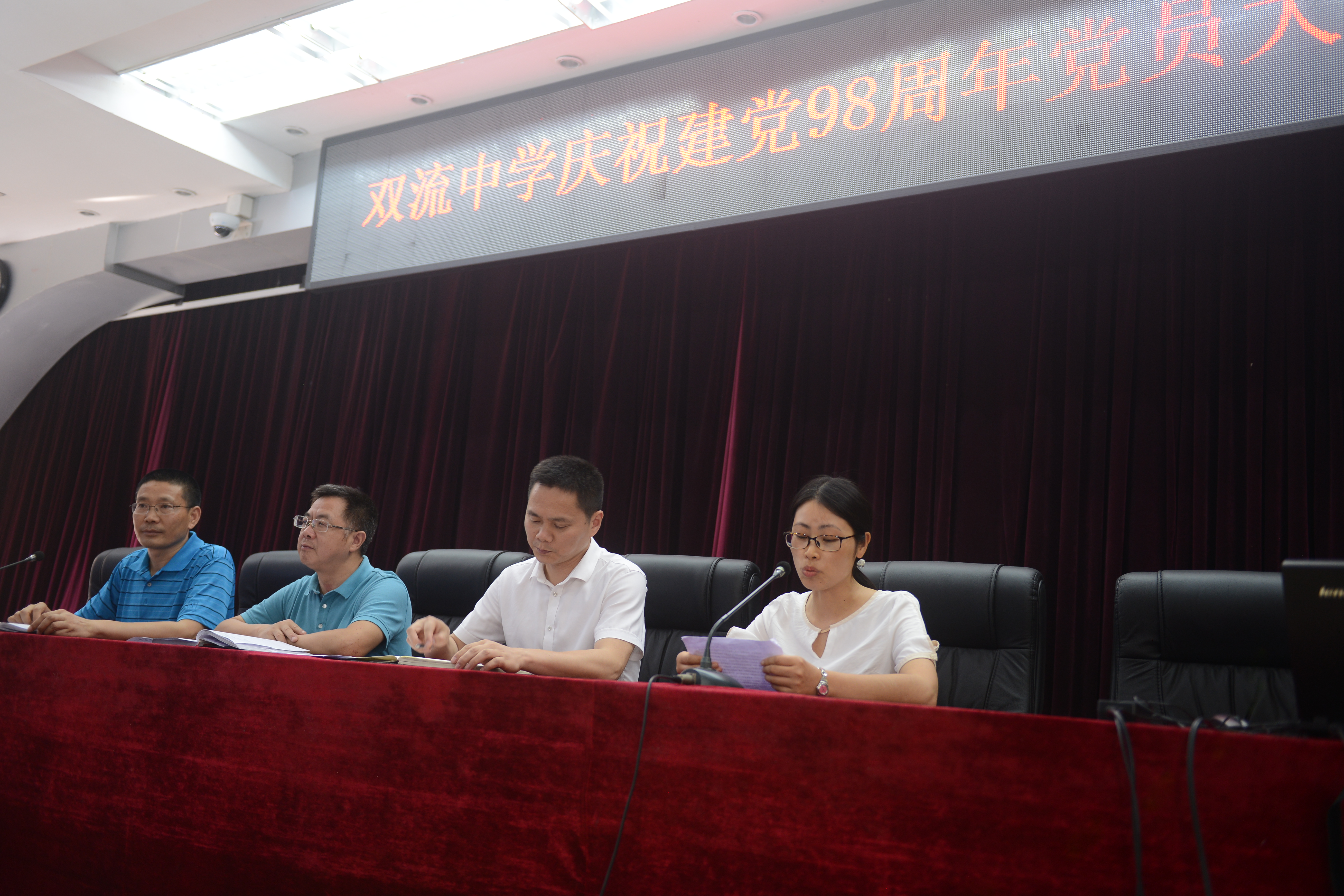 為慶祝建黨98周年,雙流中學于2019年7月1日下午,在學術演講廳召開全校黨員大會,會議由雙流中學黨總支副書記向發(fā)友主持,全體黨員參加了此次會議。