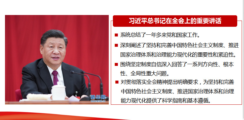 全會重點研究堅持和完善中國特色社會主義制度、推進國家治理體系和治理能力現(xiàn)代化問題并作出決定,是以習(xí)近平同志為核心的黨中央從政治上、全局上、戰(zhàn)略上全面考量,立足當(dāng)前、著眼長遠(yuǎn)作出的重大決策,充分體現(xiàn)了黨中央高瞻遠(yuǎn)矚的戰(zhàn)略眼光和強烈的歷史擔(dān)當(dāng),對于堅定全黨全國各族人民的道路自信、理論自信、制度自信、文化自信,統(tǒng)攬偉大斗爭、偉大工程、偉大事業(yè)、偉大夢想,全面建成小康社會、全面建設(shè)社會主義現(xiàn)代化國家、實現(xiàn)中華民族偉大復(fù)興的中國夢,具有十分重要的意義。
