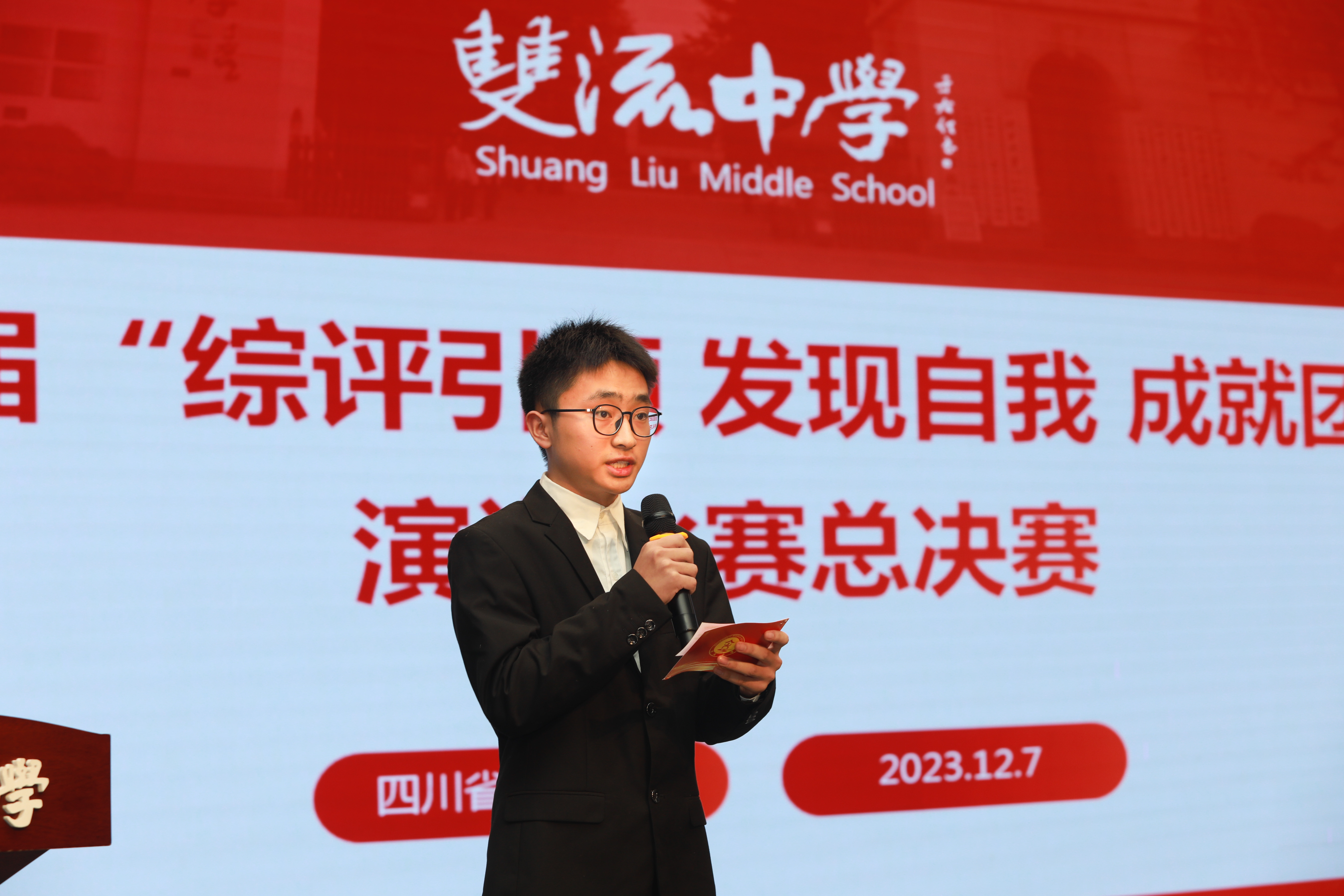 為紀(jì)念“一二·九”運(yùn)動(dòng),弘揚(yáng)愛國(guó)熱情,傳承擔(dān)當(dāng)精神,同時(shí)為豐富校園文化生活,搭建學(xué)生風(fēng)采展示的平臺(tái),雙流中學(xué)于2023年12月7日舉辦了紀(jì)念“一二?九”運(yùn)動(dòng)暨第六屆“綜評(píng)引領(lǐng) 發(fā)現(xiàn)自我 成就團(tuán)隊(duì)”演講比賽高中組總決賽,本場(chǎng)比賽由高二18班的張睿同學(xué)和高一22班的夏雨淳主持。