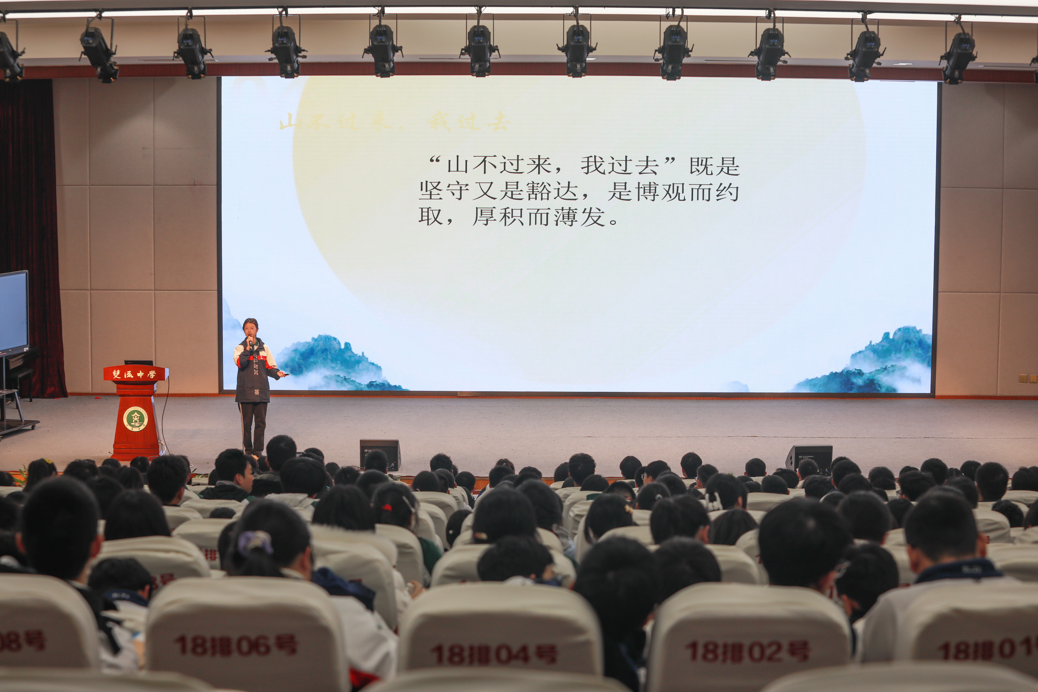 《古蘭經(jīng)》中記載大師表演移山大法,最后大師解惑道:這世上根本沒有什么移山大法,唯一能夠移動(dòng)山的方法就是,山不過來我就過去。高一22班戴琦欣同學(xué)帶來以《山不過來,我過去》的主題演講,啟示我們要把衡量生活的權(quán)利牢牢地攥在自己的手心,以赤子之心和豁達(dá)之姿走向自我世界的遠(yuǎn)山。
