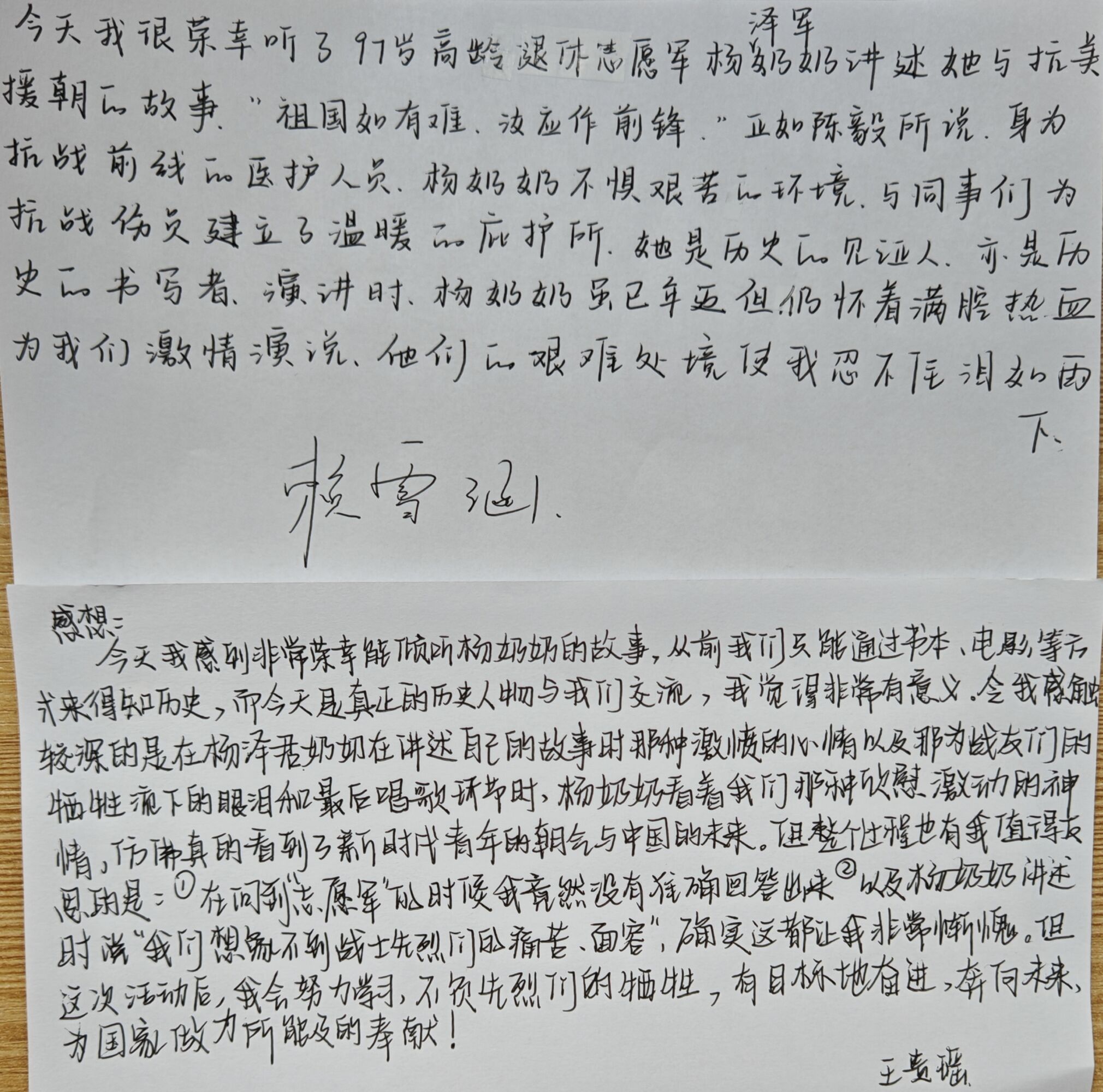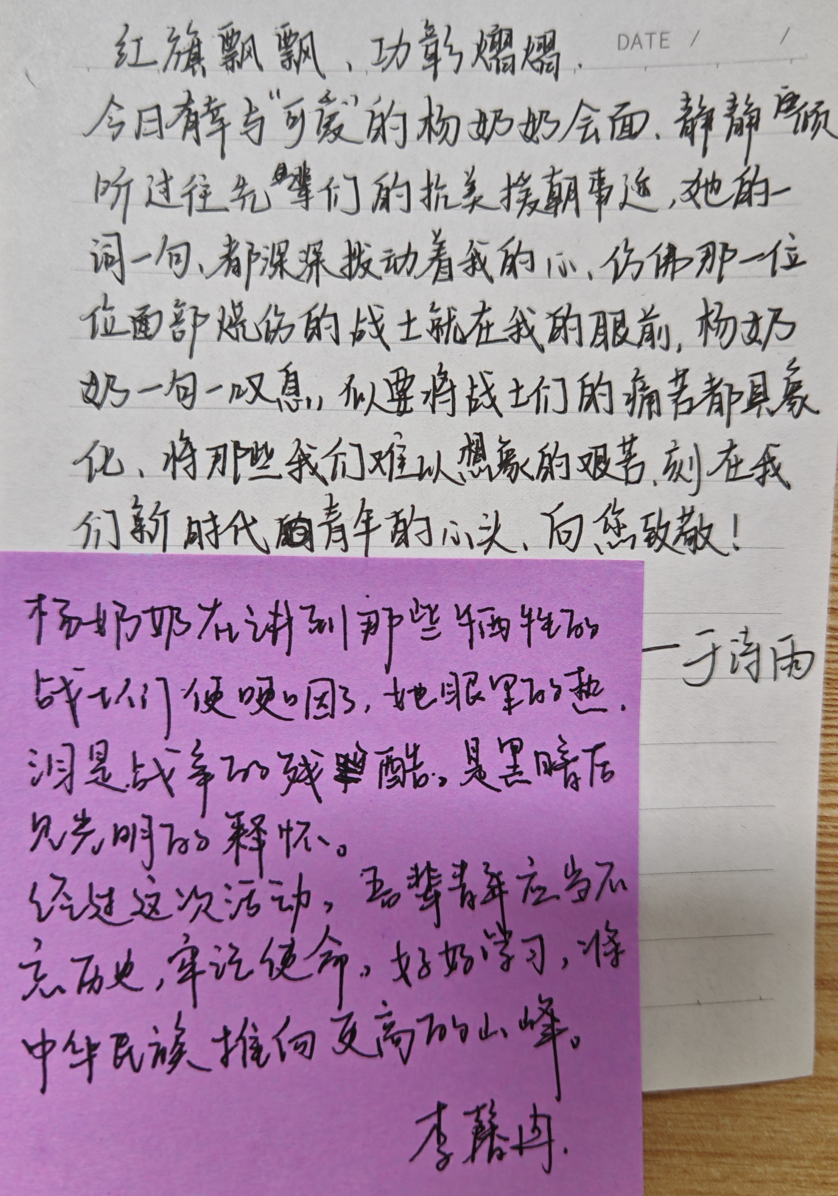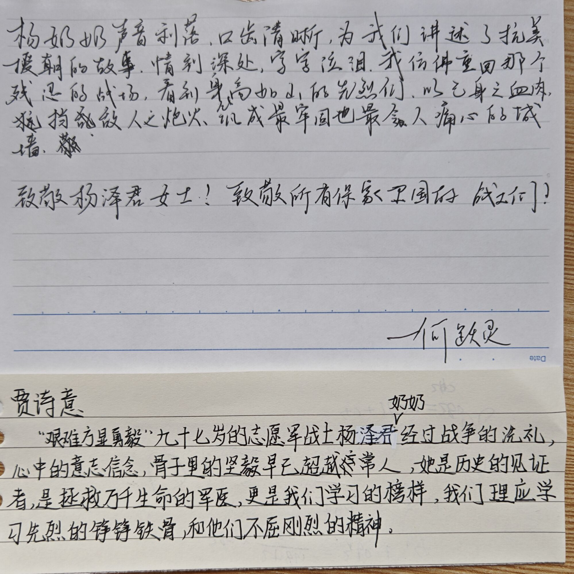 這次愛國主義教育活動,楊奶奶為學(xué)生打開了一扇通往歷史深處的窗口,讓大家得以聆聽那段波瀾壯闊的歷史篇章。學(xué)生們深受震撼,及時書寫了感受,立志傳承紅色基因,銘記歷史,開創(chuàng)未來。