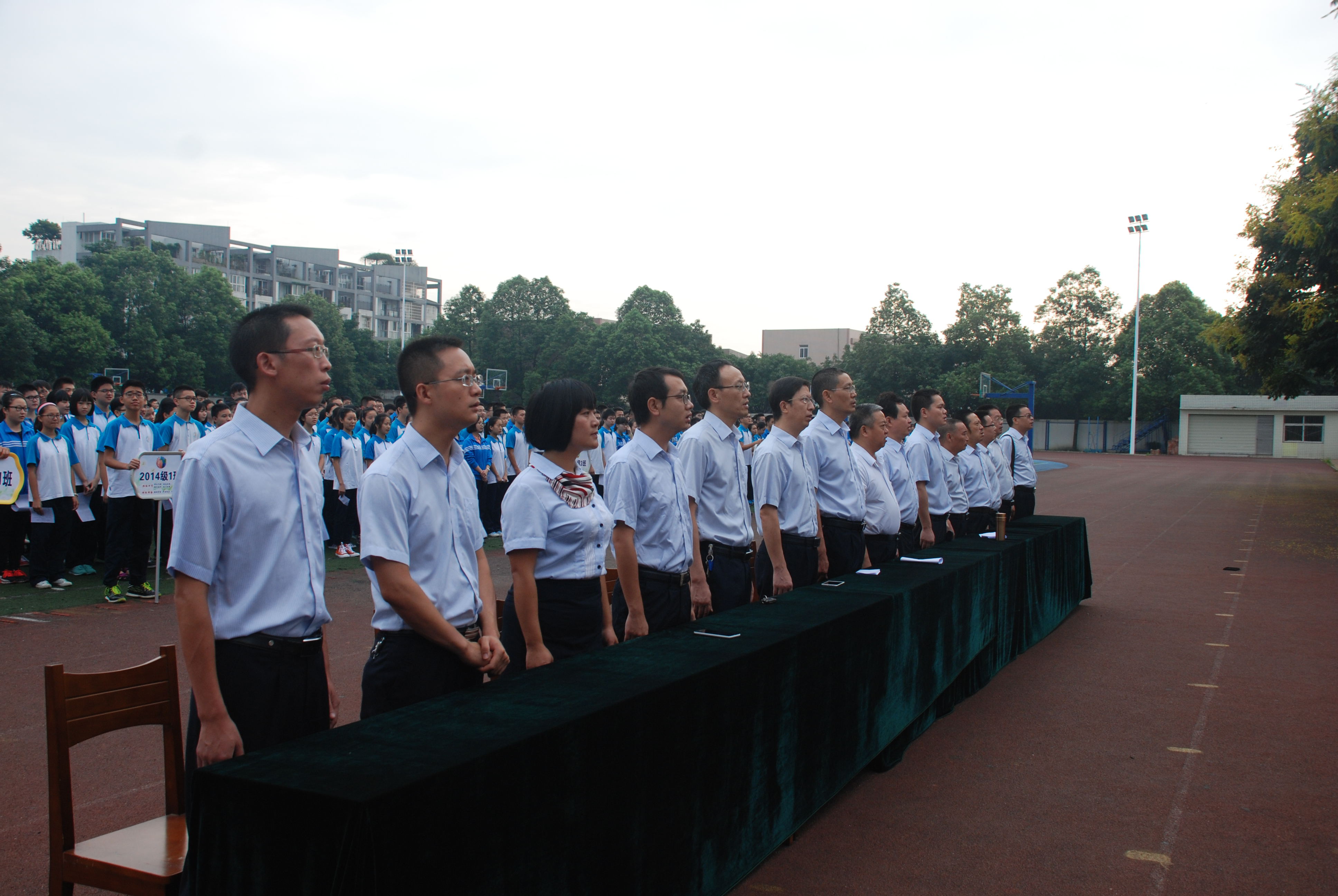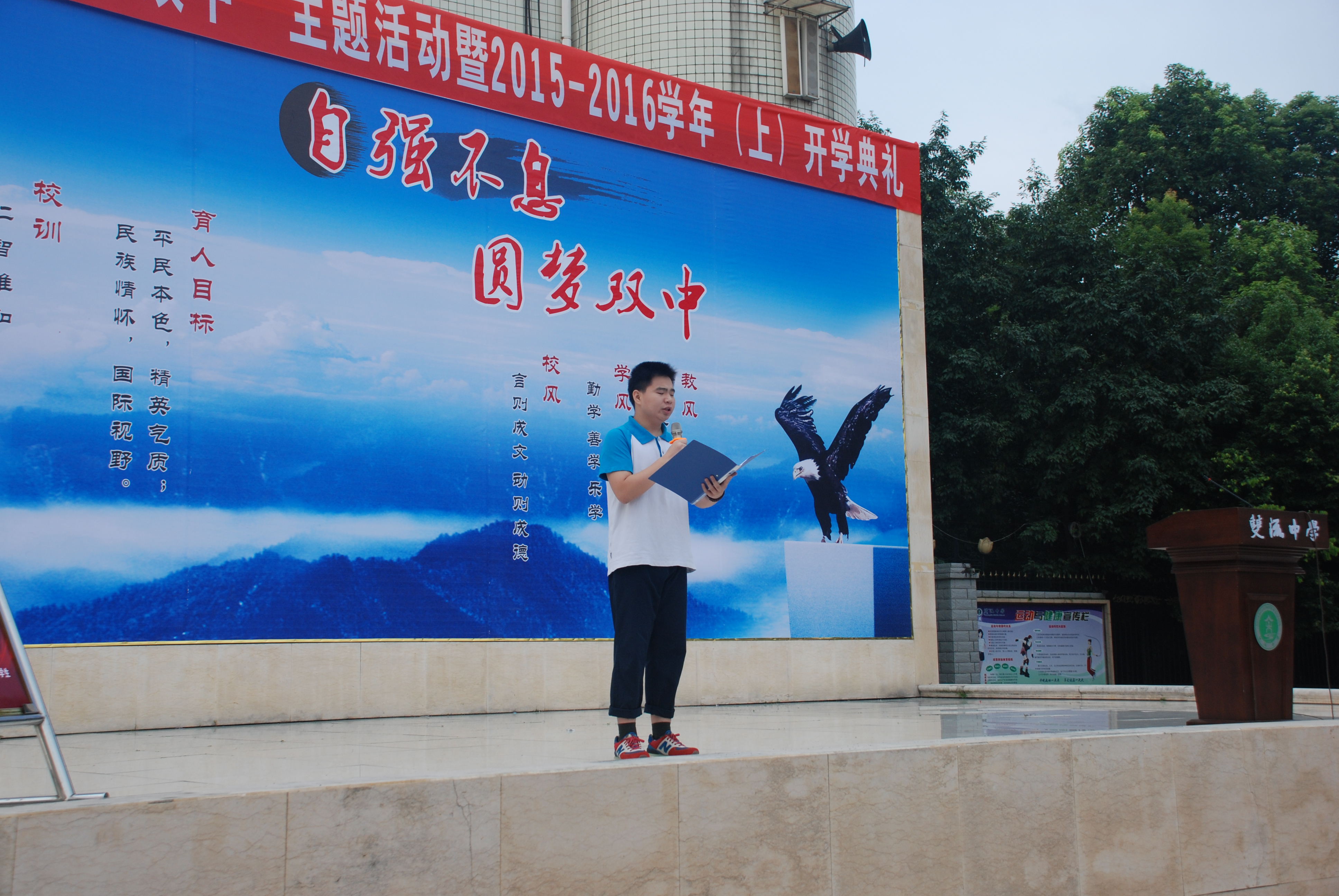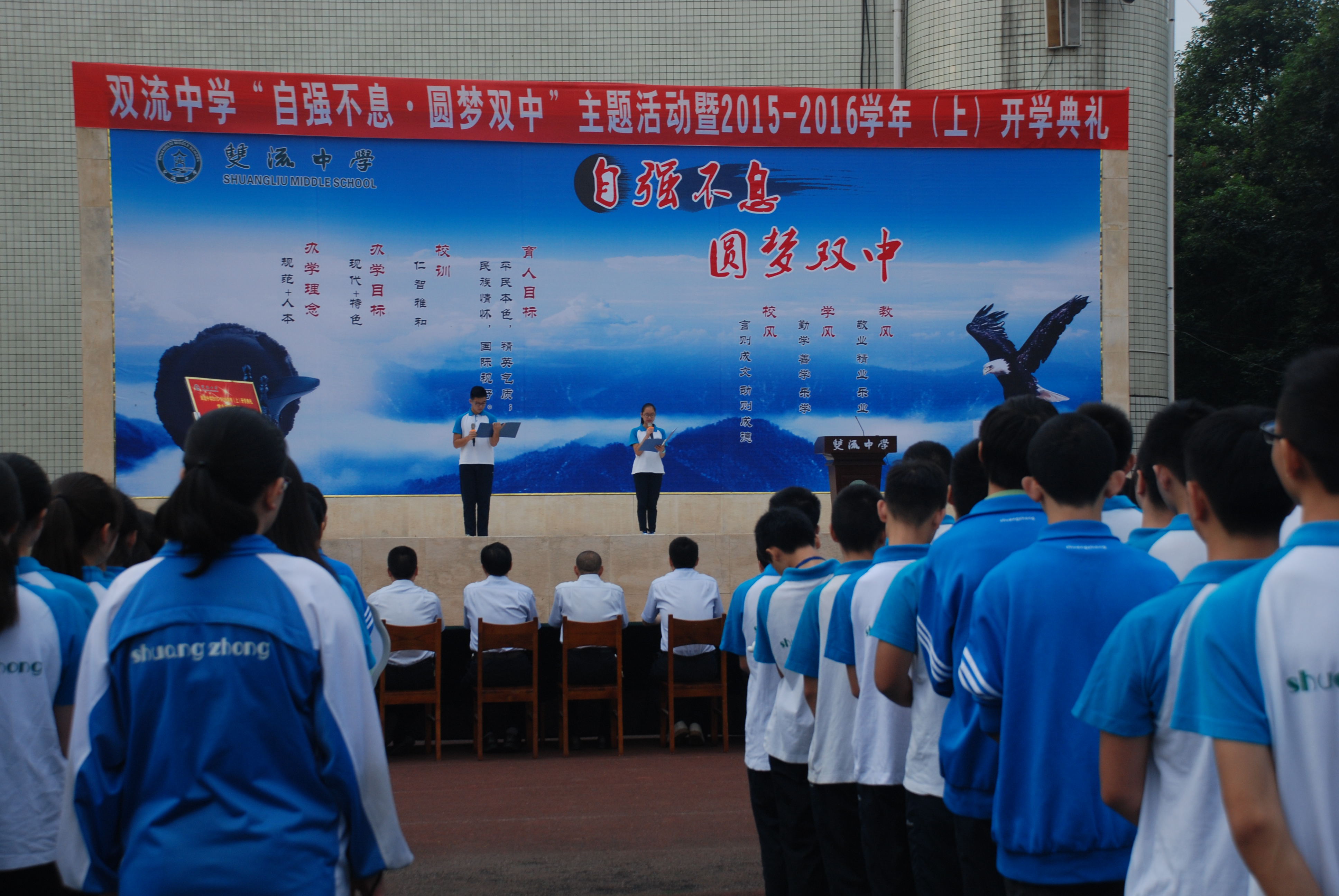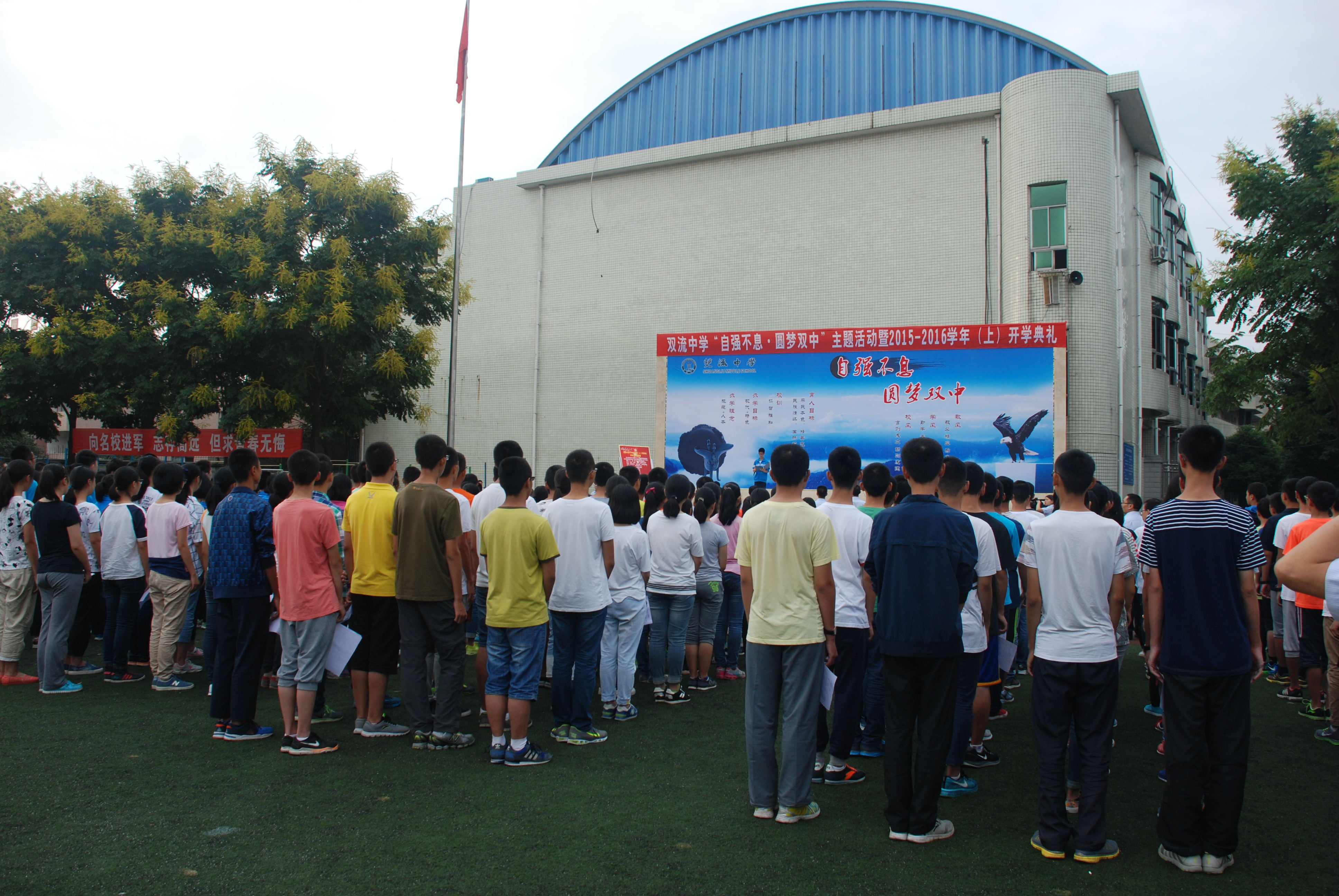 2015年9月7日上午8點(diǎn),在莊嚴(yán)的國歌聲中,雙流中學(xué)2015—2016學(xué)年度(上)開學(xué)典禮拉開了序幕!高一、高二的同學(xué)和教師齊聚操場。操場上彩旗飄揚(yáng),主席臺上的橫幅格外引人注目,新的學(xué)年,孕育著新的希望和憧憬。校團(tuán)委學(xué)生干部主持開學(xué)典禮,并向大家介紹了出席開學(xué)典禮的學(xué)校領(lǐng)導(dǎo)。