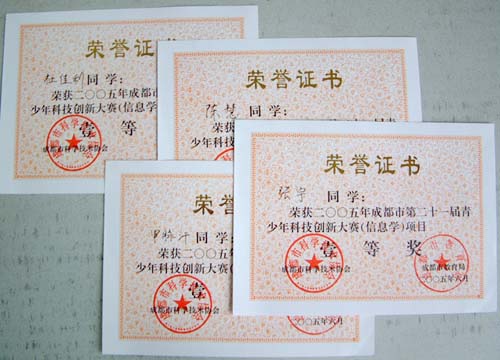 在剛剛結(jié)束的成都市第二十一屆科技創(chuàng)新大賽(信息學(xué)類)中,由我校計(jì)算機(jī)組選拔推薦出10位同學(xué)組成的參賽組中,有8人獲得了優(yōu)異成績(jī)。本次比賽中的部分優(yōu)秀作品將被推薦參加省級(jí)比賽。在此,向全校予以公布表?yè)P(yáng),希望這些同學(xué)再接再厲,爭(zhēng)取在以后的學(xué)習(xí)中獲得更好成績(jī)!