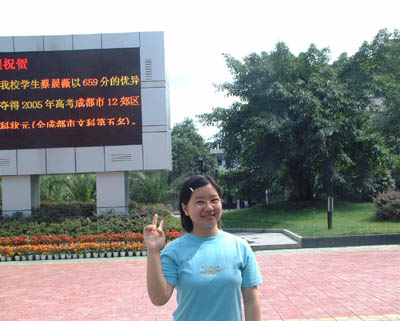 在剛剛揭曉的2005年高考成績榜上,我校學(xué)生蔡晨薇和戴晶分別以659分、706分的優(yōu)異成績成為成都市14郊區(qū)縣的文理科狀元。