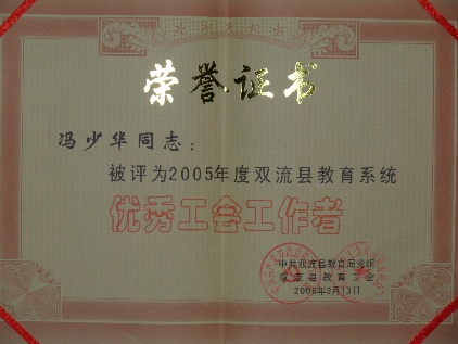2006年3月13日,我校工會(huì)副主席馮少華同志喜獲由中共雙流縣教育黨組織、雙流縣教育局工會(huì)頒發(fā)的“2005年度雙流縣教育系統(tǒng)優(yōu)秀工會(huì)工作者”榮譽(yù)證書。馮少華同志擔(dān)任我校工會(huì)主席以來,圍繞黨組織和上級工會(huì)的要求,集合我校實(shí)際積極開展學(xué)校工會(huì)工作,為營造“團(tuán)結(jié)、民主、和諧、進(jìn)取”的校園氛圍作出了積極的貢獻(xiàn),得到了上級組織和全校教職工的一致好評!