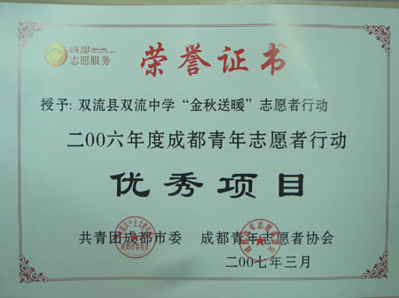 在日前結束的成都市“青年志愿行動”“評優(yōu)選先”活動中,我校憑借“金秋送暖”志愿系列行動奪得2006年度成都青年志愿者行動優(yōu)秀項目獎(雙流縣僅一項)。