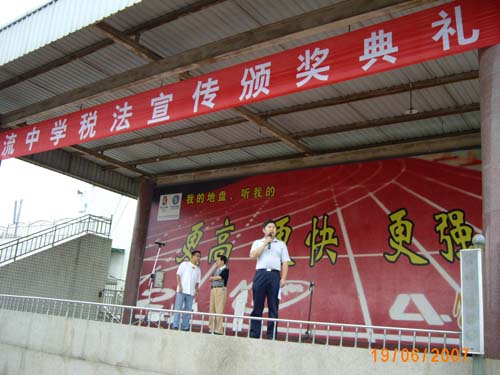 昨日,雙流縣地稅局“依法誠(chéng)信納稅,共建和諧社會(huì)”頒獎(jiǎng)活動(dòng)在雙流中學(xué)操場(chǎng)隆重舉行,雙流中學(xué)學(xué)生在此次活動(dòng)中獲得一等獎(jiǎng)一名,獎(jiǎng)金800元;二等獎(jiǎng)兩名,獎(jiǎng)金600元;三等獎(jiǎng)三名,獎(jiǎng)金400元。稅務(wù)局法制科陳科長(zhǎng)為獲獎(jiǎng)學(xué)生頒獎(jiǎng)并作了重要講話,她對(duì)雙中學(xué)生在此次活動(dòng)的表現(xiàn)給予了很高的評(píng)價(jià),希望同學(xué)們從小樹立納稅的意識(shí),長(zhǎng)大后做一個(gè)誠(chéng)信的納稅人。