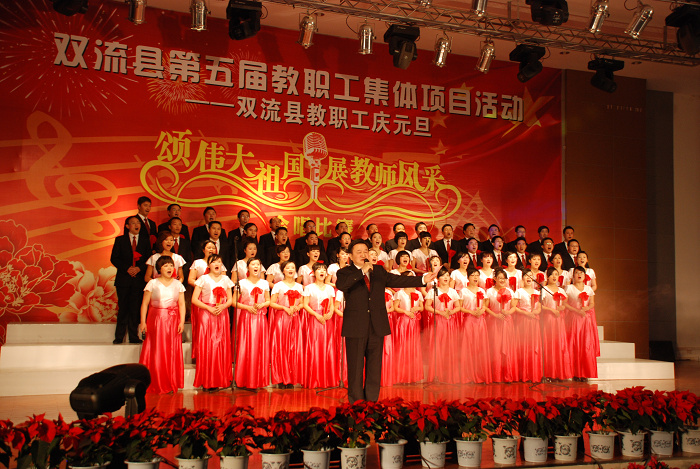 1225,雙流中學(xué)教師合唱團在雙流縣教職工慶元旦“頌偉大祖國,展教師風(fēng)采”合唱比賽中,以良好的形象、飽滿的激情、精湛的技藝力挫群雄,獲得了高中組一等獎!