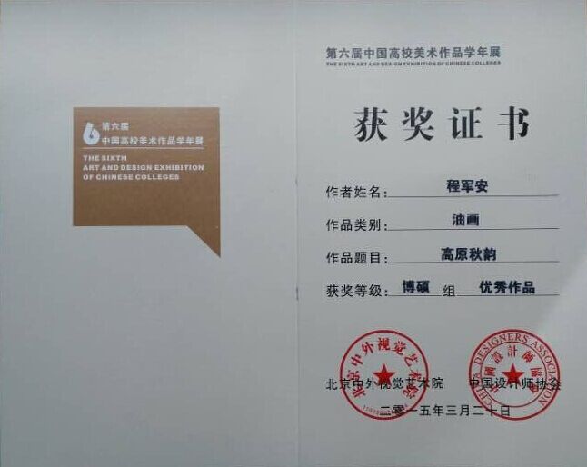 在“第六屆中國(guó)高校美術(shù)作品學(xué)年展”中,我校美術(shù)教師、四川師范大學(xué)在讀教育碩士程軍安的兩幅作品《中國(guó)筑夢(mèng)人》《高原秋韻》被評(píng)選為博碩組優(yōu)秀作品。特此祝賀!