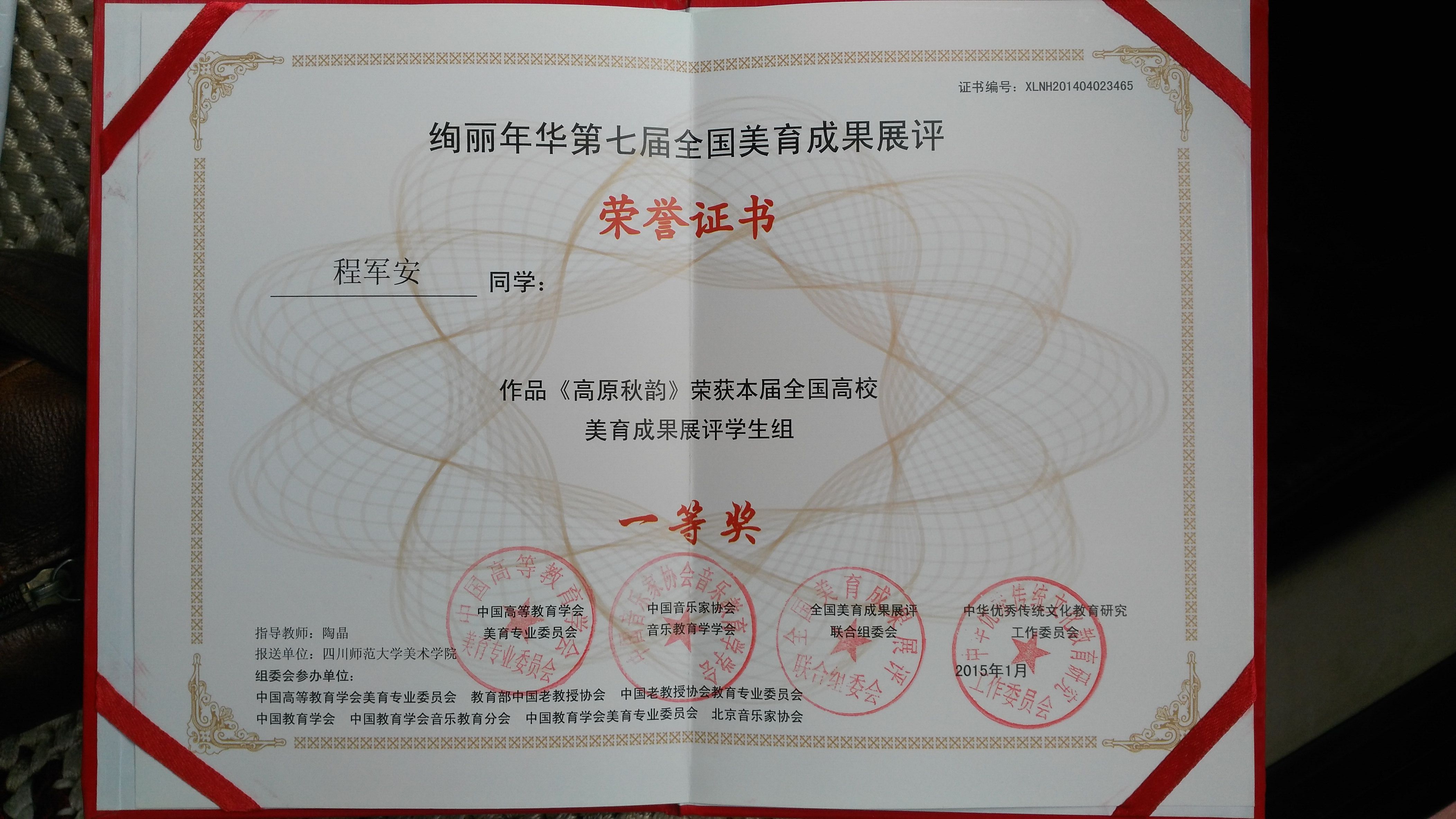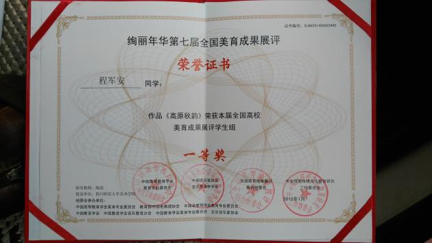 另,由教育部中國(guó)高等教育學(xué)會(huì)、中國(guó)教育學(xué)會(huì)、十二五教育部規(guī)劃課題組等單位主辦的“絢麗年華·第七屆全國(guó)美育成果展評(píng)”系列活動(dòng)評(píng)選結(jié)果揭曉。程軍安老師油畫作品《高原秋韻》喜獲一等獎(jiǎng)。作品入選《全國(guó)高校美育成果展優(yōu)秀作品暨當(dāng)代中國(guó)高校藝術(shù)之星作品集粹》。