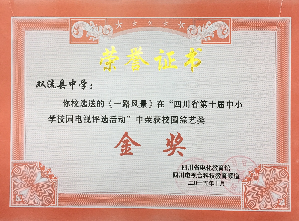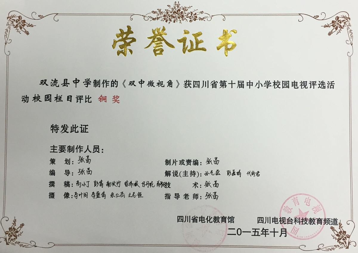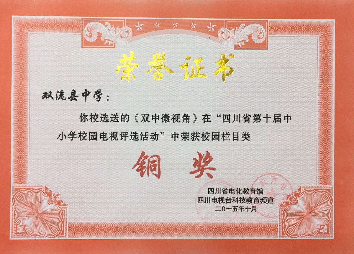 在2015年10月四川省第十屆中小學(xué)校園電視評(píng)選活動(dòng)中,我校學(xué)生電視臺(tái)選送的作品再創(chuàng)佳績(jī)。電視散文《一路風(fēng)景》榮獲校園綜藝類評(píng)比金獎(jiǎng),微電影《那個(gè)男生》榮獲校園微電影類評(píng)比銀獎(jiǎng),系列欄目《雙中微視角》榮獲校園欄目類銅獎(jiǎng),學(xué)生電視臺(tái)主持人代麗君(2014級(jí)13班)榮獲校園主持人銀獎(jiǎng),孫藝瀅(2014級(jí)14班)榮獲校園主持人銅獎(jiǎng),彭嘉婧(2014級(jí)23班)榮獲校園主持人銅獎(jiǎng),學(xué)生電視臺(tái)負(fù)責(zé)老師張茜的論文《中小學(xué)校園微電影劇本創(chuàng)作的實(shí)踐與研究》榮獲論文類二等獎(jiǎng)。