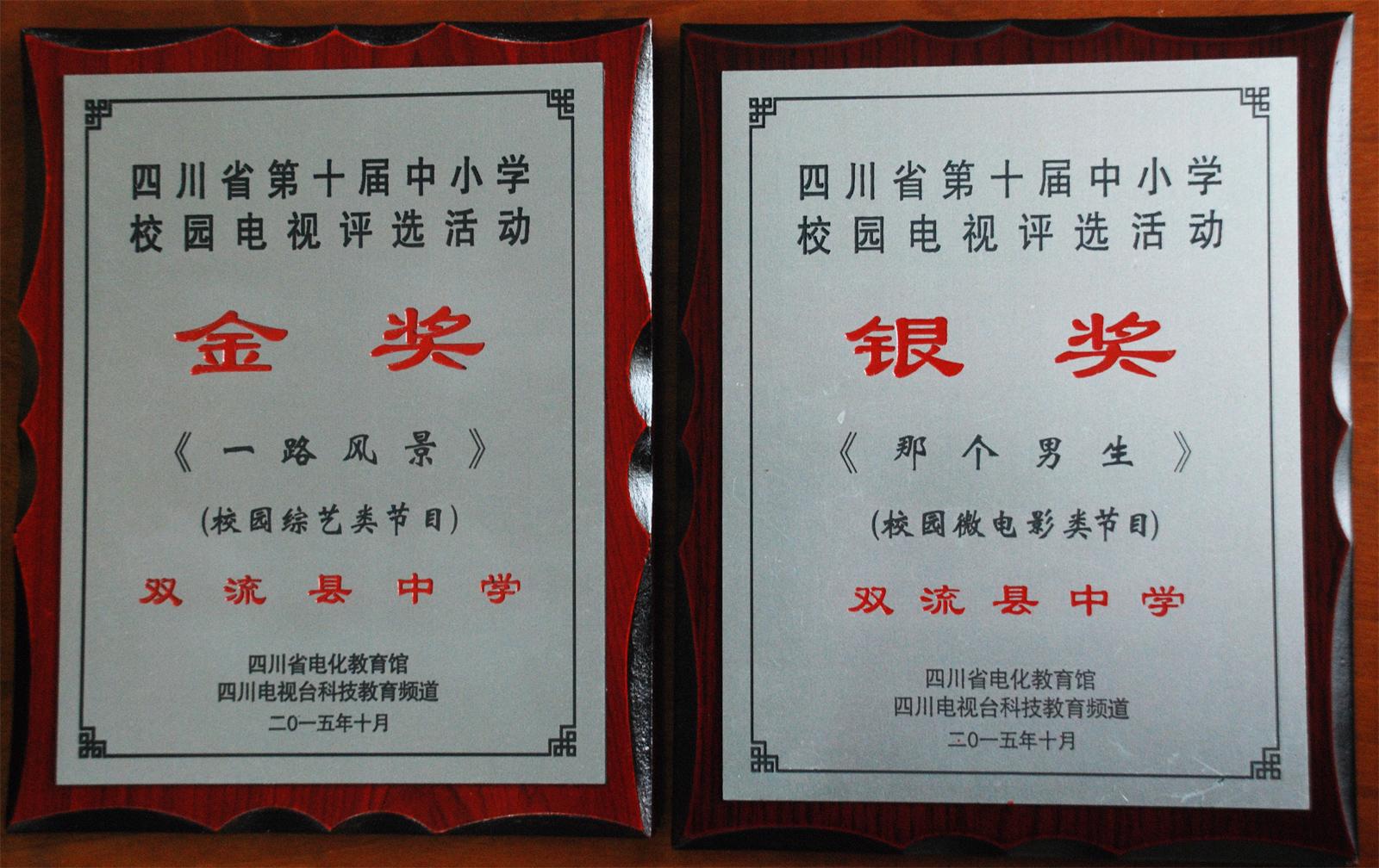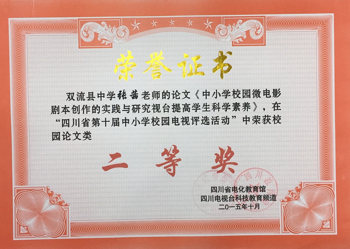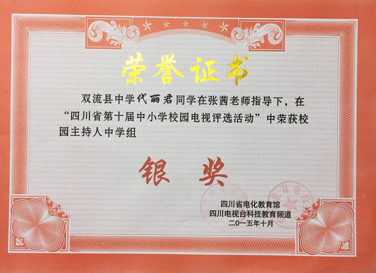 在2015年10月四川省第十屆中小學(xué)校園電視評(píng)選活動(dòng)中,我校學(xué)生電視臺(tái)選送的作品再創(chuàng)佳績(jī)。電視散文《一路風(fēng)景》榮獲校園綜藝類評(píng)比金獎(jiǎng),微電影《那個(gè)男生》榮獲校園微電影類評(píng)比銀獎(jiǎng),系列欄目《雙中微視角》榮獲校園欄目類銅獎(jiǎng),學(xué)生電視臺(tái)主持人代麗君(2014級(jí)13班)榮獲校園主持人銀獎(jiǎng),孫藝瀅(2014級(jí)14班)榮獲校園主持人銅獎(jiǎng),彭嘉婧(2014級(jí)23班)榮獲校園主持人銅獎(jiǎng),學(xué)生電視臺(tái)負(fù)責(zé)老師張茜的論文《中小學(xué)校園微電影劇本創(chuàng)作的實(shí)踐與研究》榮獲論文類二等獎(jiǎng)。