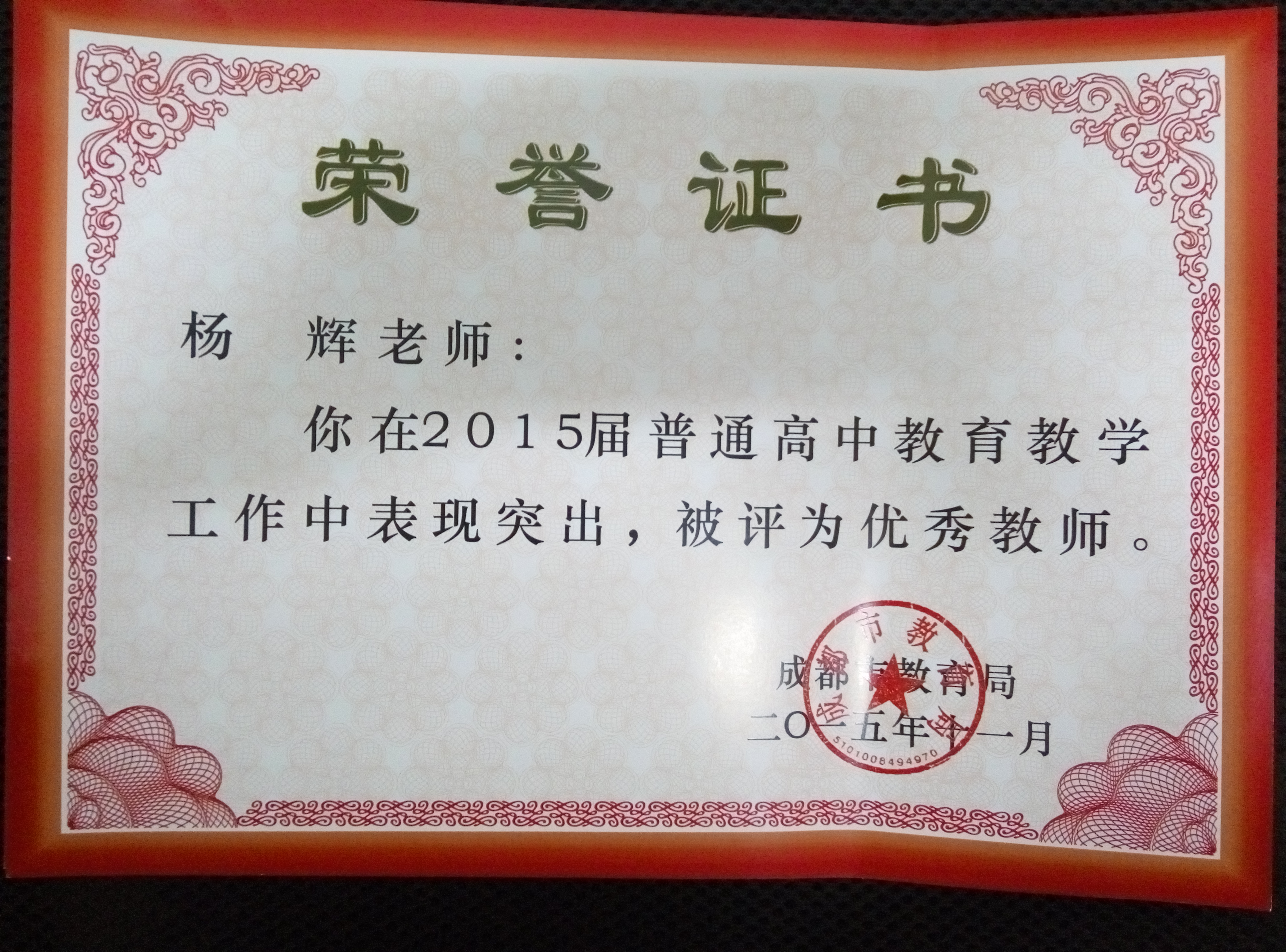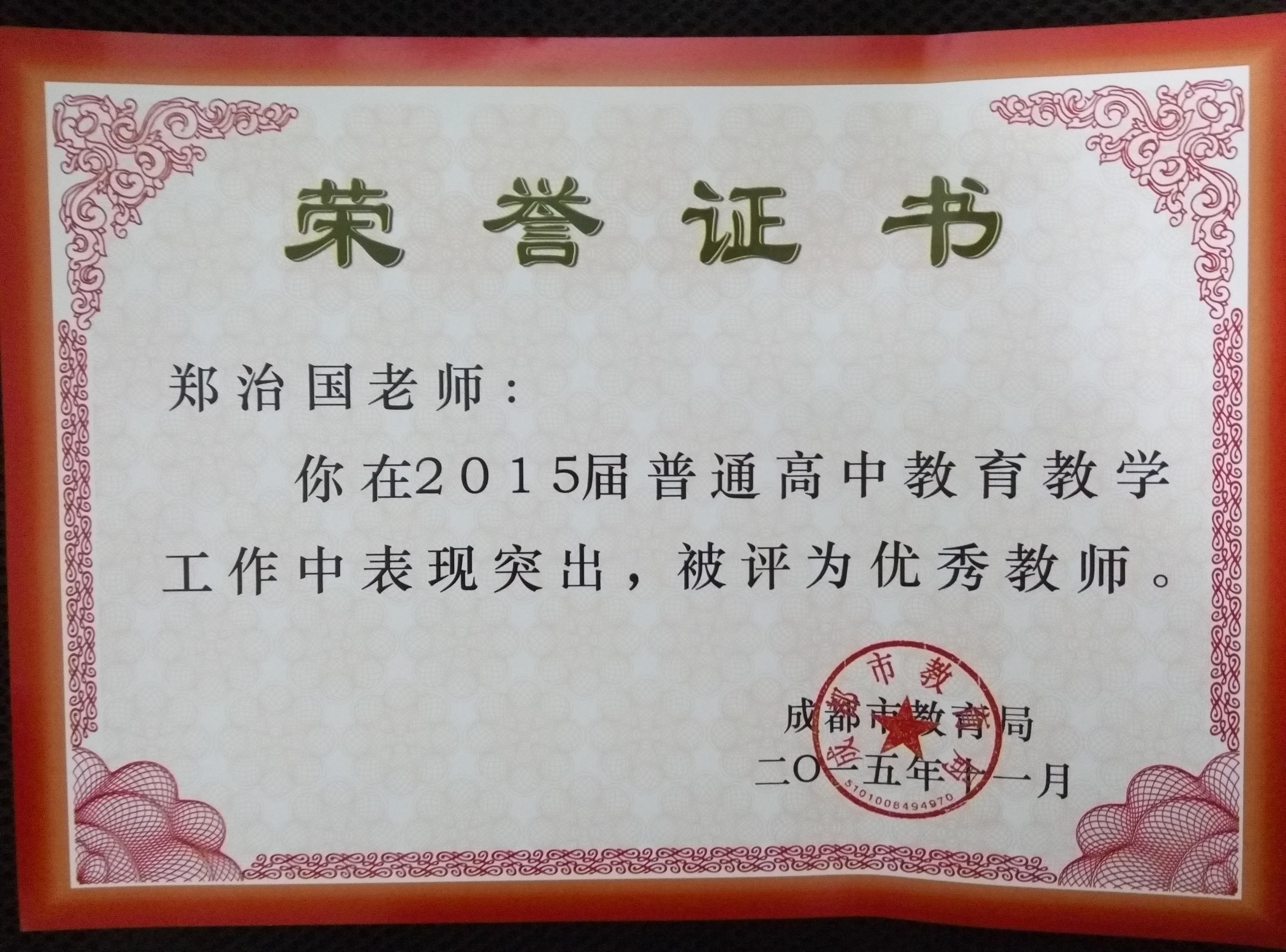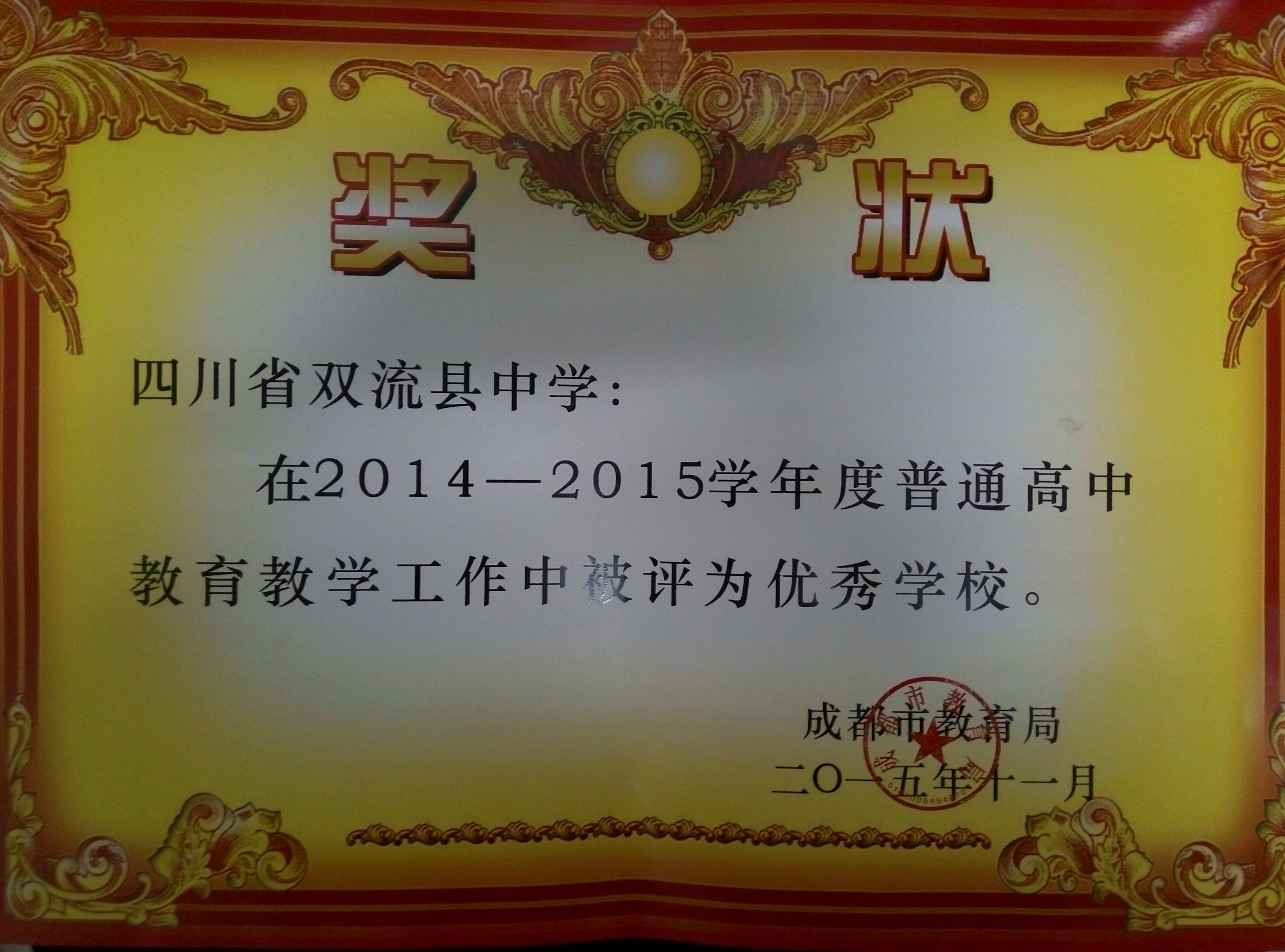 我校在2014-2015學(xué)年度普通高中教育教學(xué)工作評比中被成都市教育局評為“成都市優(yōu)秀學(xué)?!?!