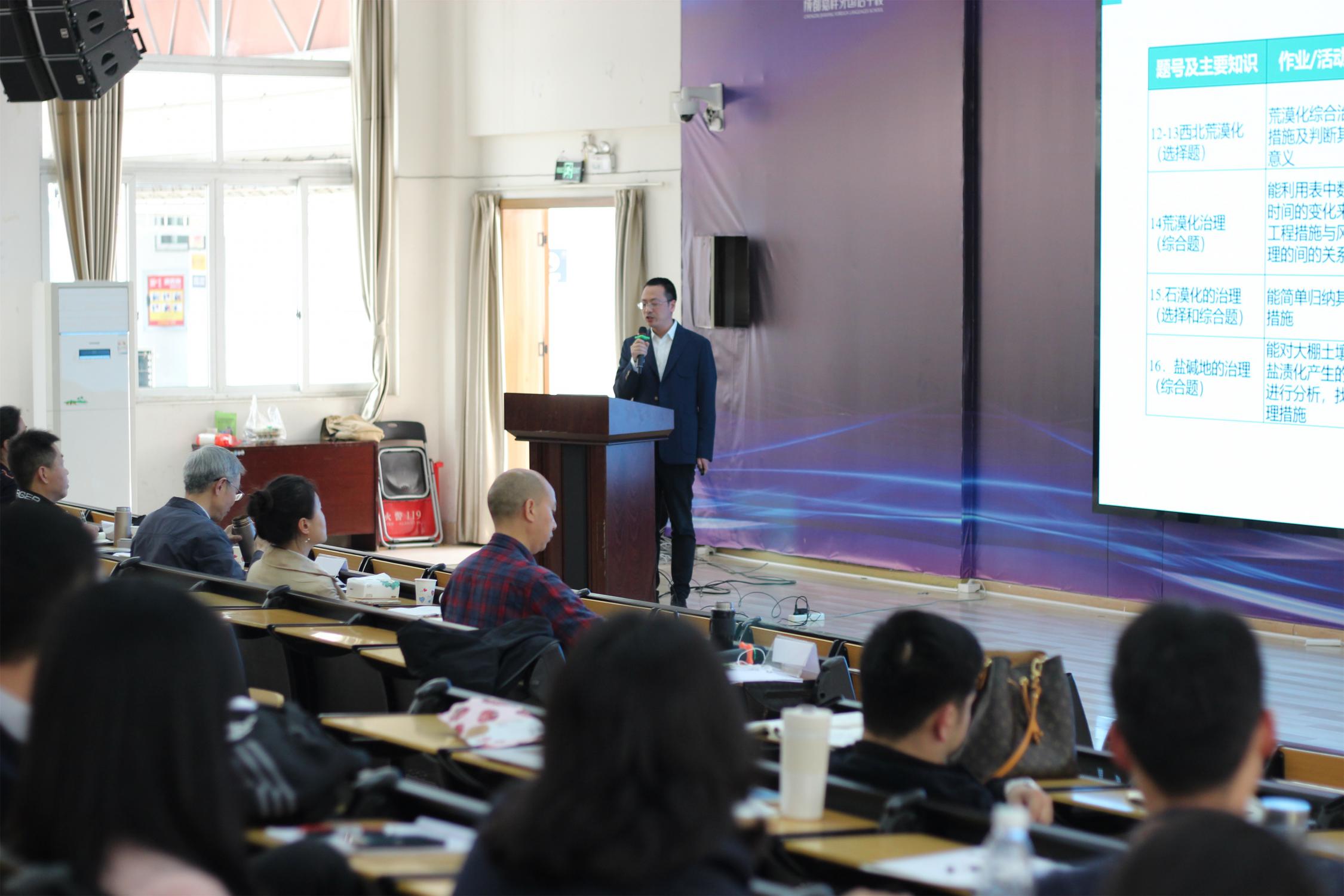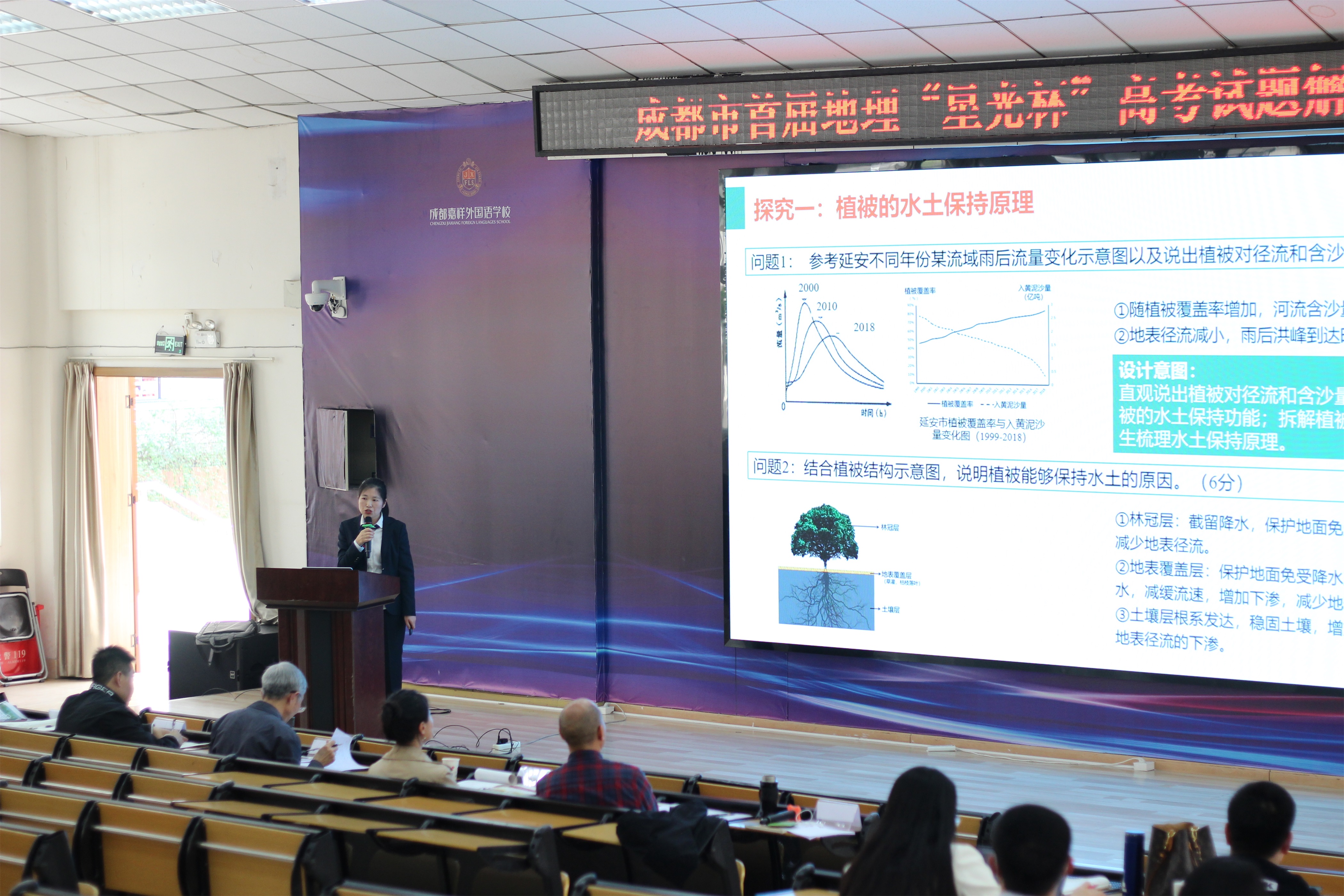 在決賽現(xiàn)場中,雙流中學(xué)以《心有丘壑,知山知水,樹木樹人》為題,圍繞“以某生態(tài)脆弱區(qū)為例,說明該地區(qū)存在的環(huán)境與發(fā)展問題,以及綜合治理措施”這一課程標(biāo)準(zhǔn)進(jìn)行考情分析和單元設(shè)計(jì)展示。雷濤老師從基于《中國高考評價(jià)體系》的角度,對相關(guān)高考試題進(jìn)行了統(tǒng)計(jì)分析,并展示了本組基于考情命制的原創(chuàng)試題。何健老師圍繞本課標(biāo)的大單元教學(xué)設(shè)計(jì)進(jìn)行了展示,并較好地踐行了雙流區(qū)近年來倡導(dǎo)的“教-學(xué)-評”一致性的理念。彭世君老師展示了課例《黃土高原水土流失的綜合治理措施——以生物措施為例》,并情境創(chuàng)設(shè)中融入“因地制宜”“人地協(xié)調(diào)觀”等學(xué)科大概念。