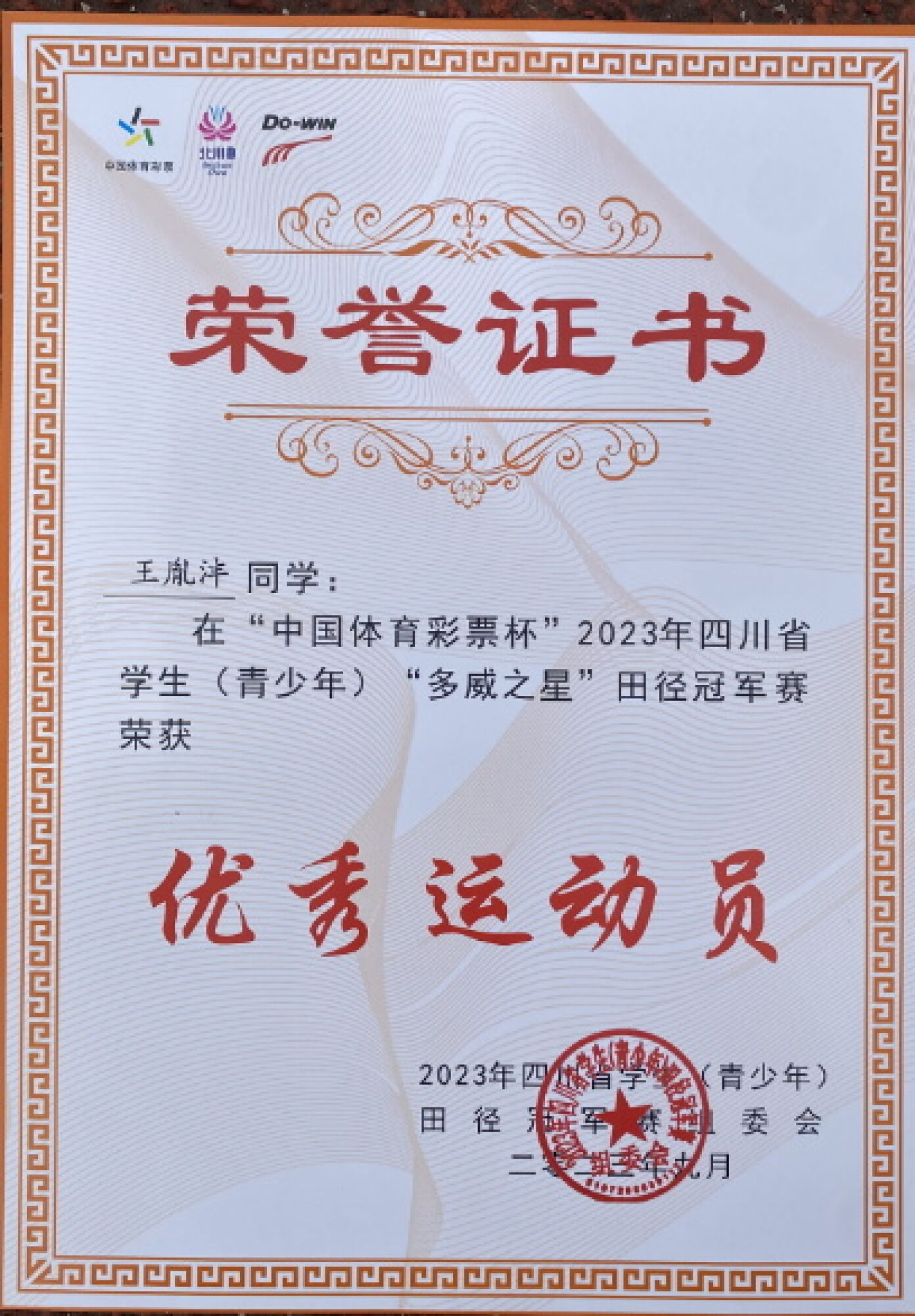 王胤灃榮獲優(yōu)秀運動員