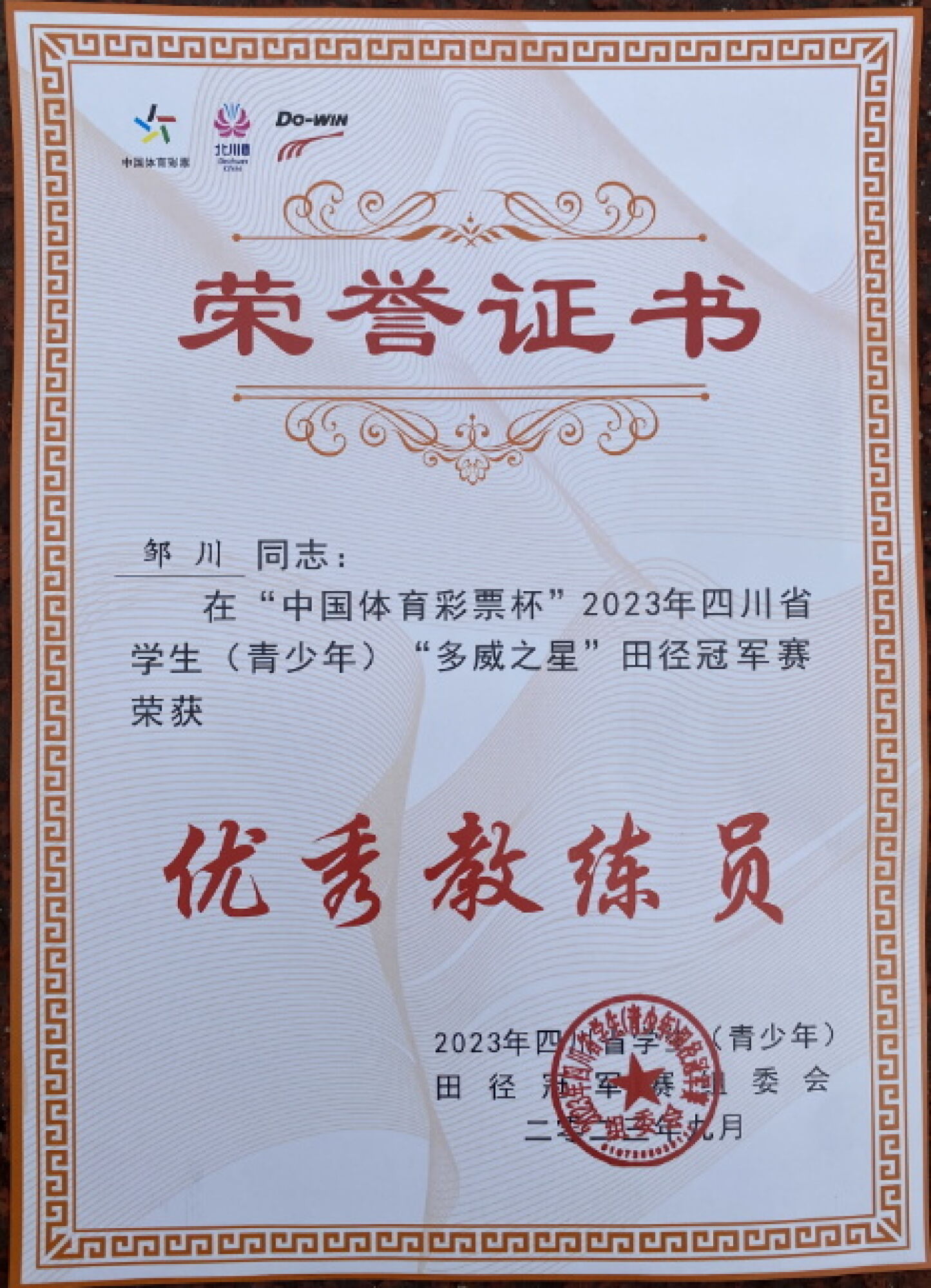 鄒川老師榮獲四川省優(yōu)秀教練員