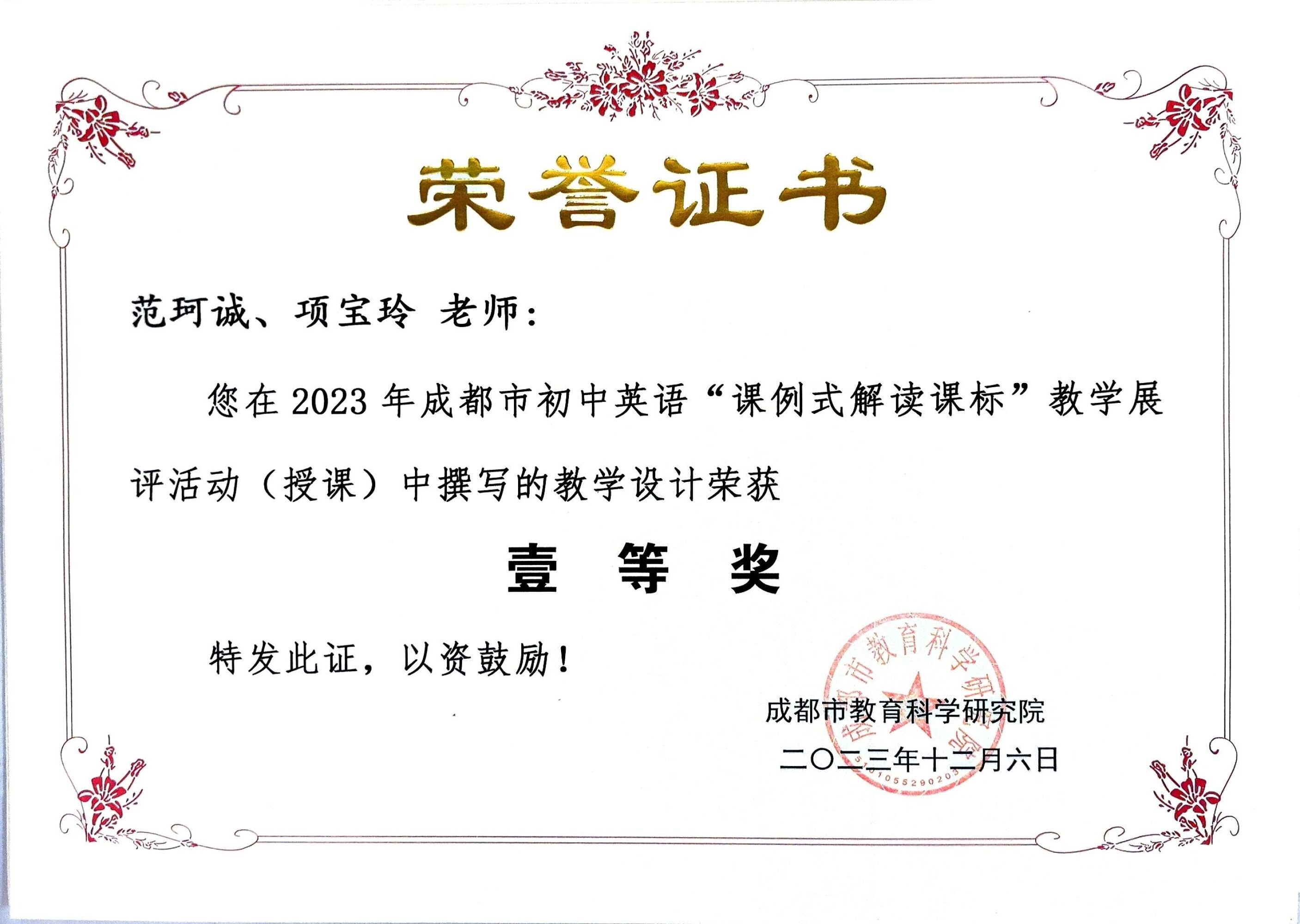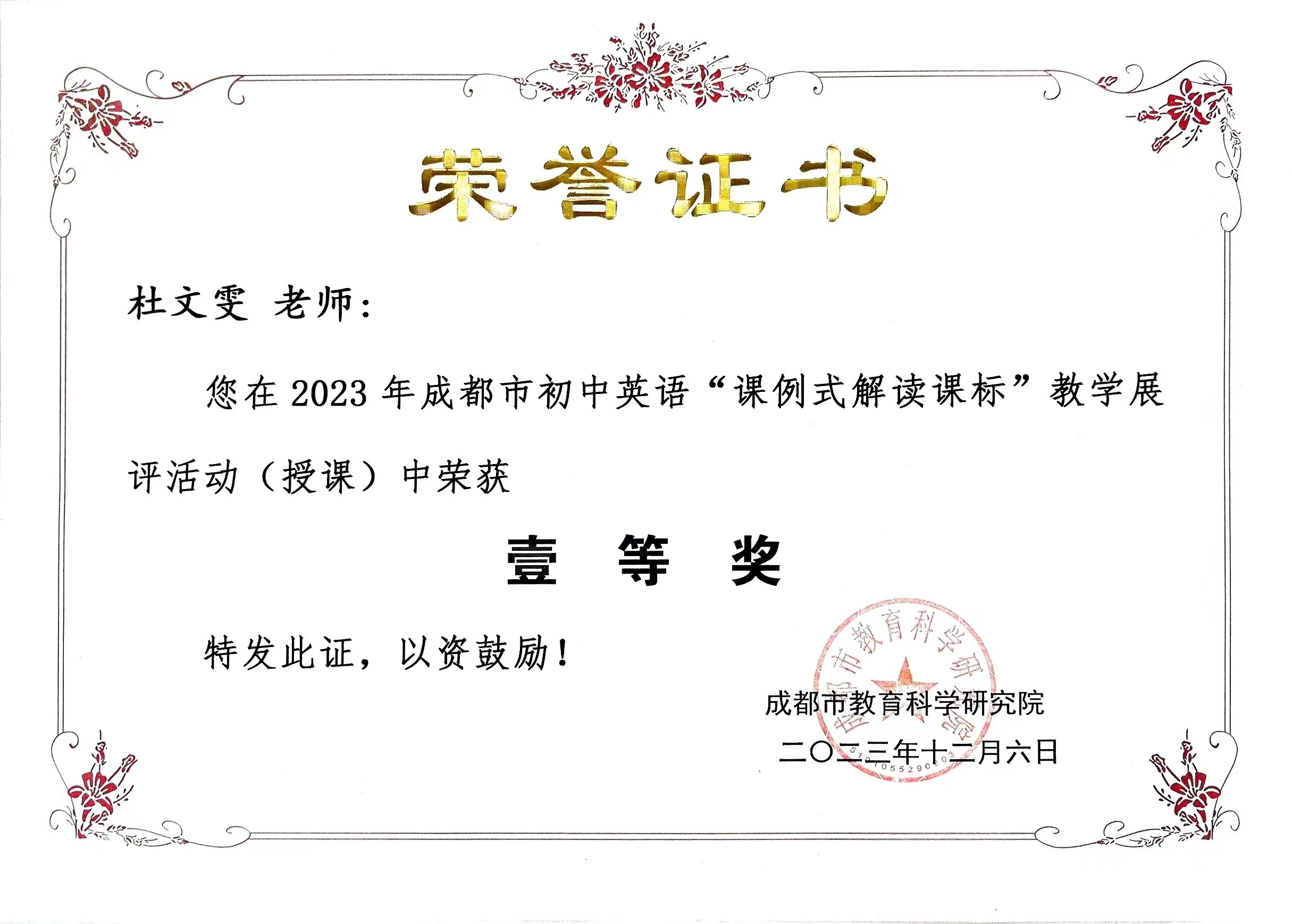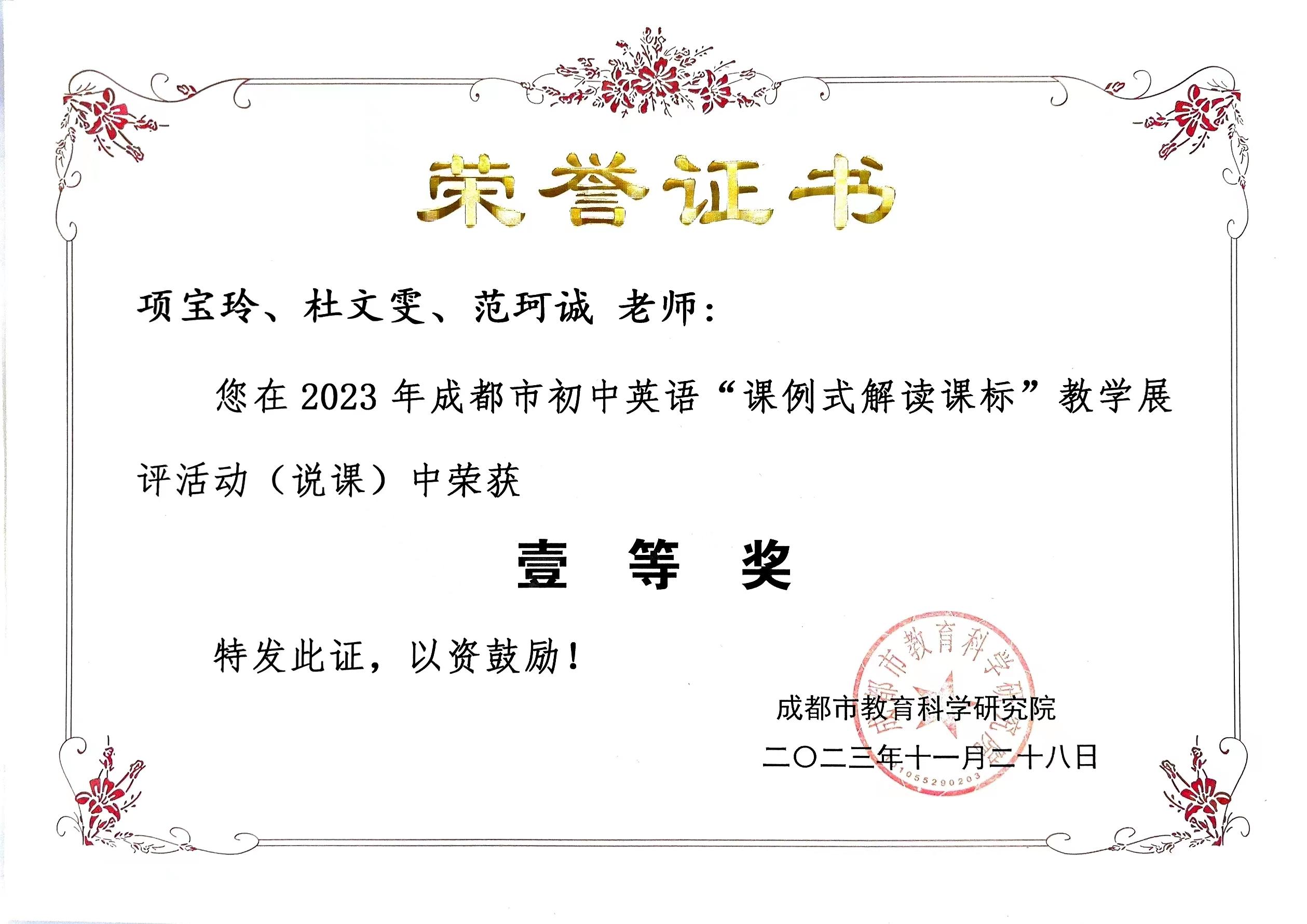 喜報(bào)!熱烈祝賀我校初中英語(yǔ)教研組青年教師項(xiàng)寶玲、杜文雯、范珂誠(chéng)參加成都市2023年初中英語(yǔ)“課例式解讀課標(biāo)”教學(xué)展評(píng)比賽,榮獲成都市說課一等獎(jiǎng)、授課一等獎(jiǎng)的佳績(jī)!