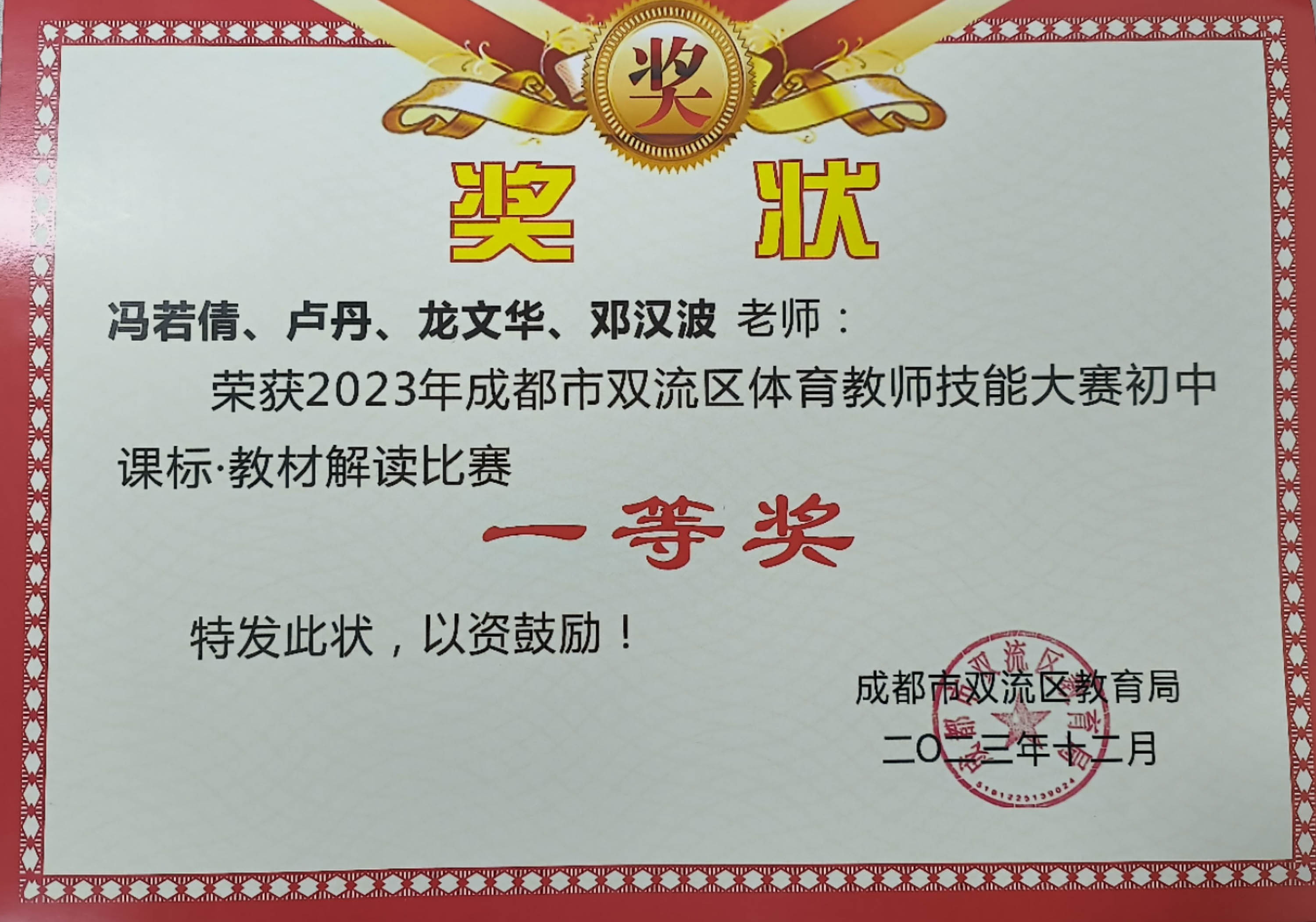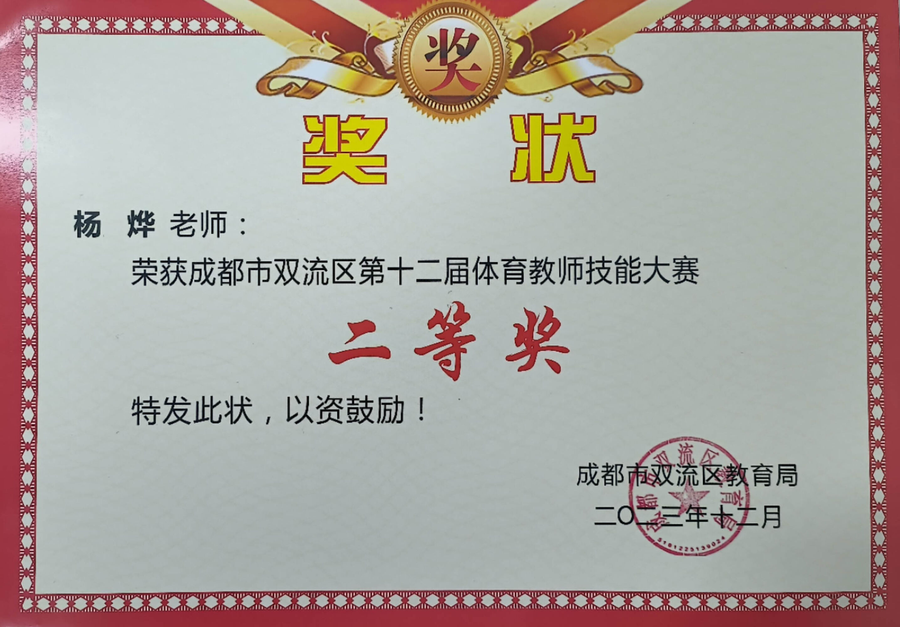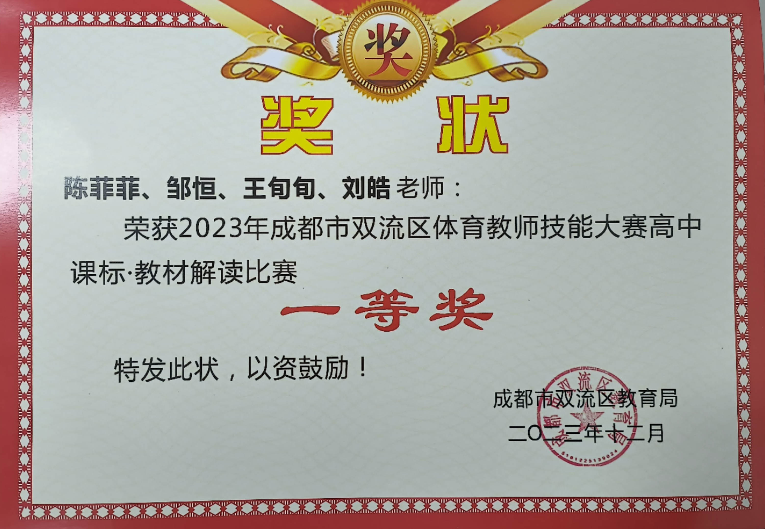 2023年11月9日至10日,雙流區(qū)第十二屆體育教師專業(yè)技能大賽圓滿收官。雙流中學(xué)體育教師代表隊(duì)在全區(qū)近100支參賽隊(duì)中脫穎而出,榮獲成都市雙流區(qū)第十二屆體育教師技能大賽一等獎(jiǎng)的好成績(jī)。