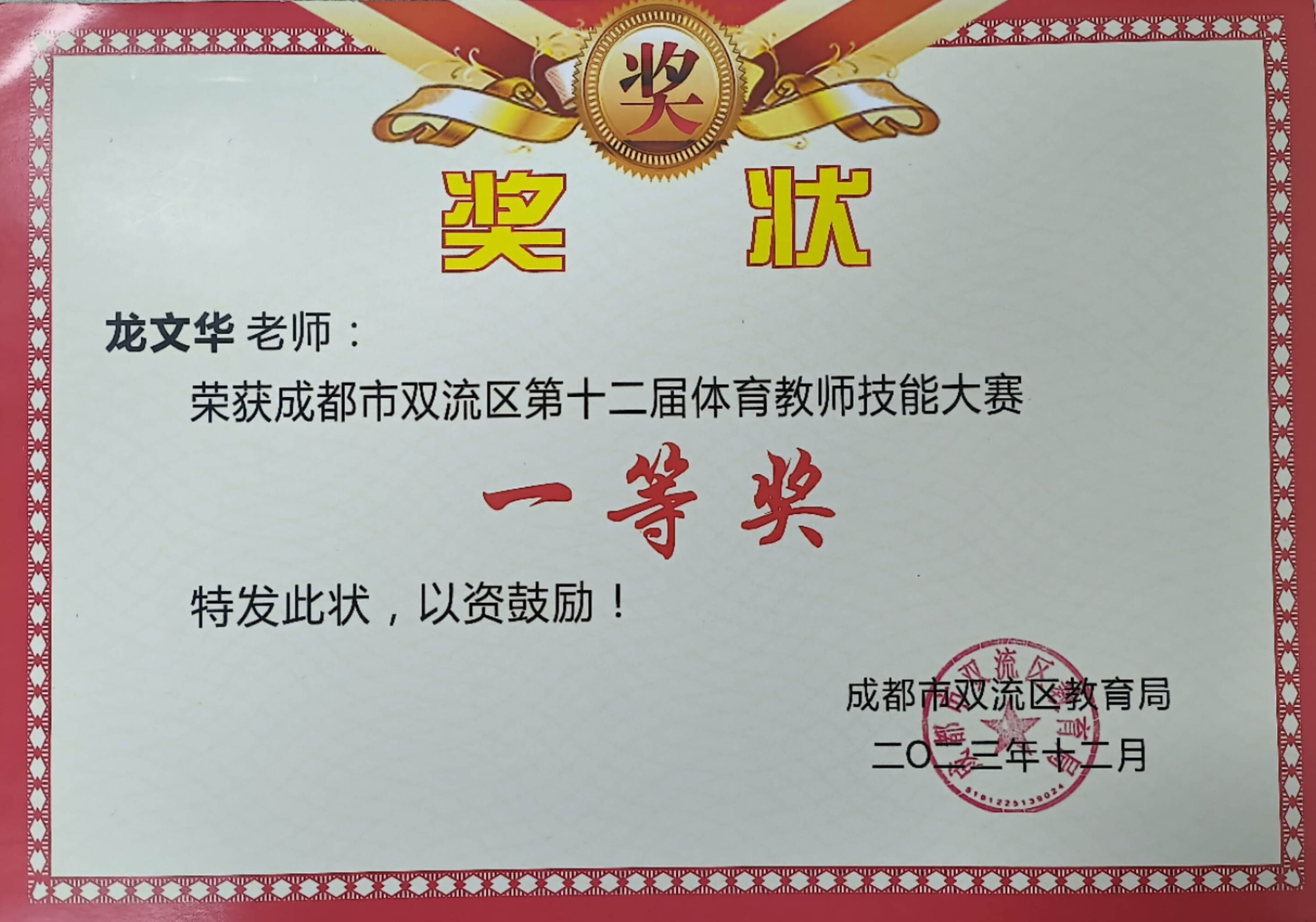 圖7 龍文華老師獲技能大賽一等獎(jiǎng)“一分耕耘,一分收獲”用汗水澆灌出的花朵格外鮮艷,來之不易的成績(jī),必定會(huì)激勵(lì)雙中體育人更加堅(jiān)韌、更加自信。雙流中學(xué)全體體育教師經(jīng)過本次大賽的歷練,積蓄了強(qiáng)勁的動(dòng)力,時(shí)刻準(zhǔn)備迎接新挑戰(zhàn),接下來的教學(xué)工作中,全體雙中人必定會(huì)昂首闊步,攜手前行,共同開創(chuàng)雙流中學(xué)更加輝煌的未來。