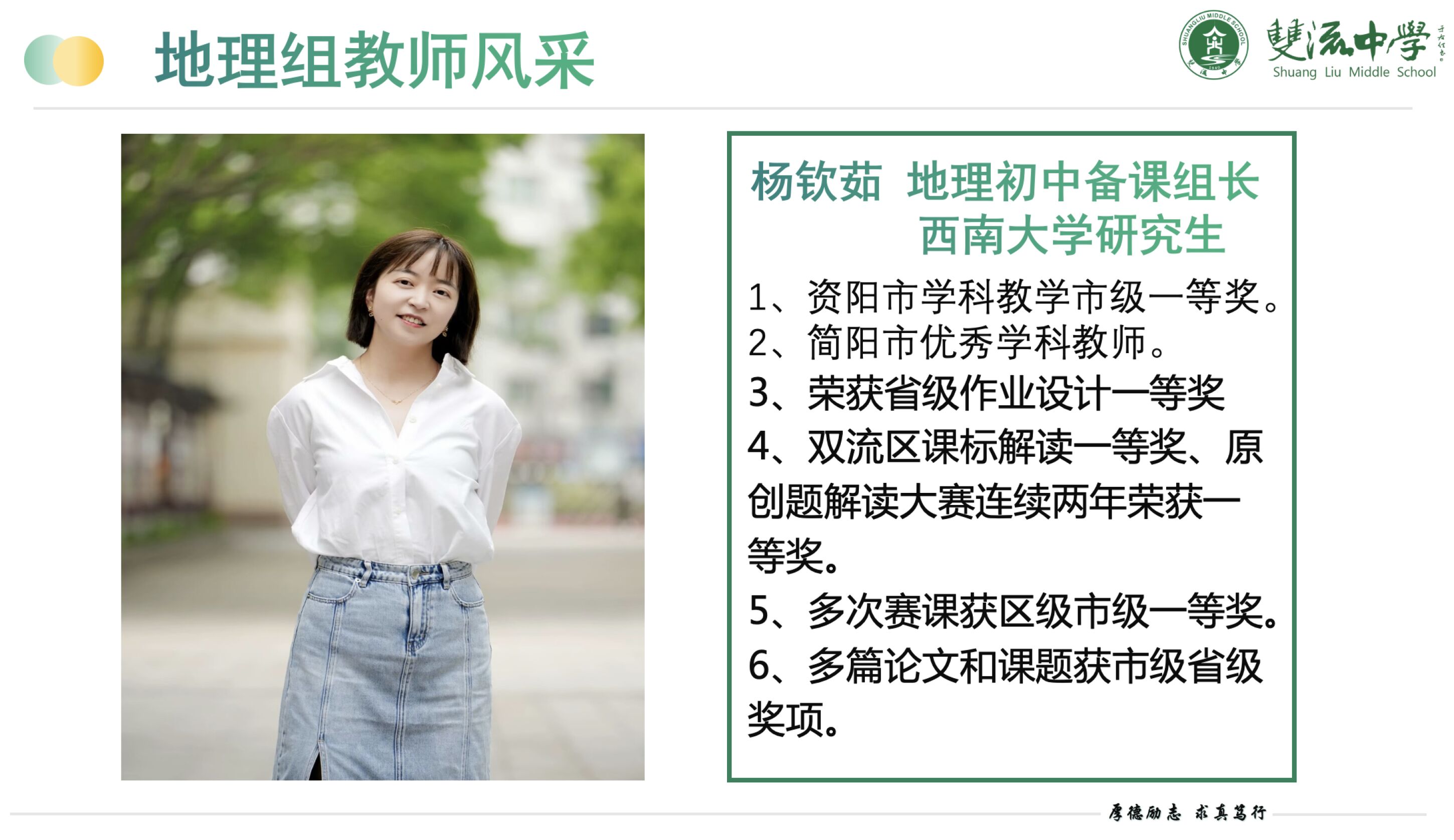 此外,初中地理組自成立以來也取得了可喜的成績:榮獲四川省作業(yè)設(shè)計大賽一等獎、雙流區(qū)課程綱要一等獎、課標(biāo)解讀一等獎、原創(chuàng)題比賽連續(xù)兩年一等獎等等。