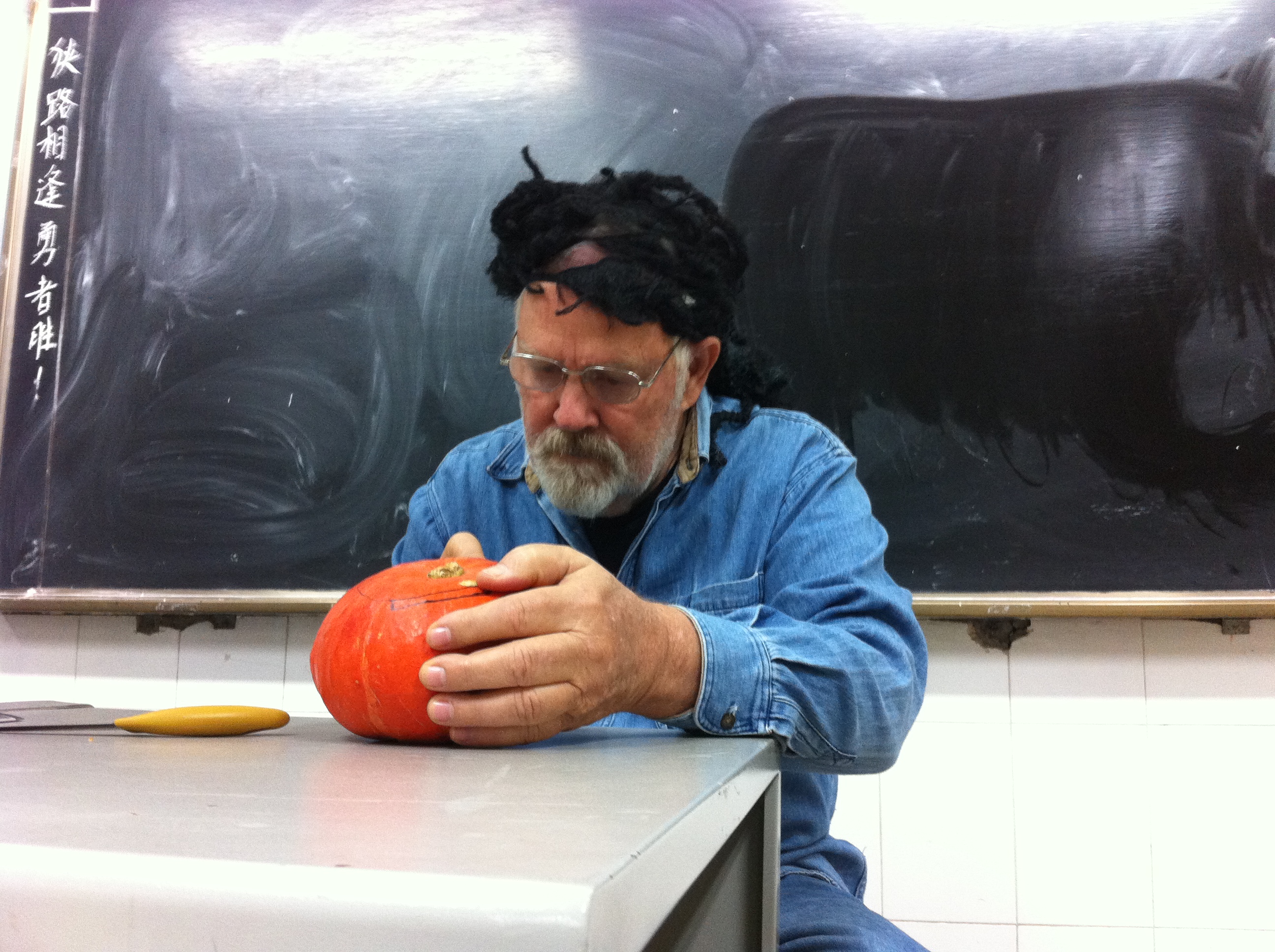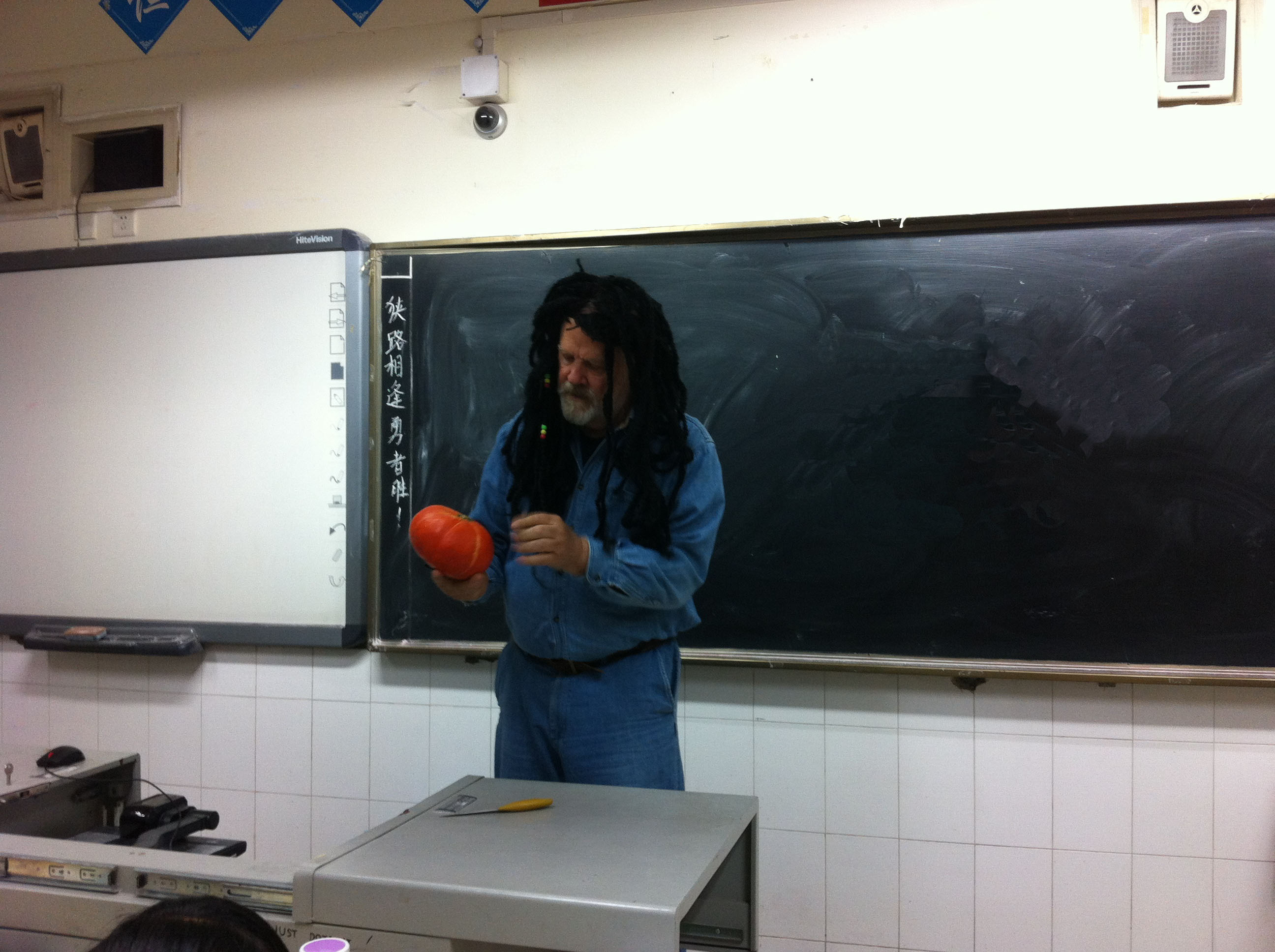 Halloween is coming. On October 28, 2013, Jim gave us the usual gift which every Halloween will use - pumpkins. Jim first for everyone to come to a "Changing Face", all of a sudden ,he came up with a wig from the luggage ,he set the wig on his head, he told us that this is America's children every Halloween game, then he took out the pumpkin and knives . from the luggage .He said today he will teach you how to carve pumpkins. He first draw the outline of the pumpkin, and then began to carve carefully , after about half an hour, a beautiful pumpkin faces came out. Students cheered enthusiastically and praised Jim is amazing!