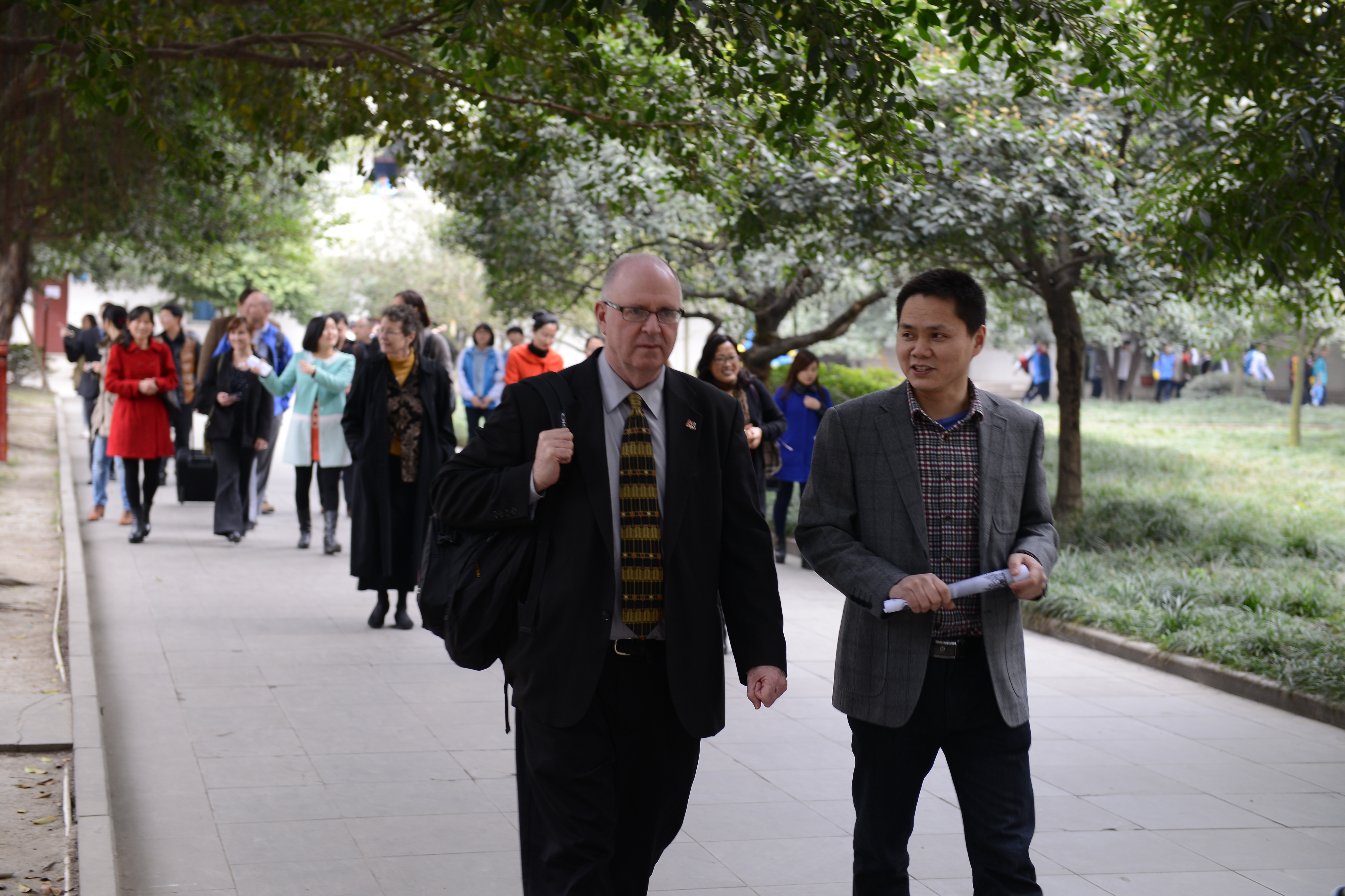 下午2點(diǎn)30分,美國(guó)校長(zhǎng)團(tuán)及教師在翻譯人員的陪同之下,準(zhǔn)時(shí)出現(xiàn)在翹首以待的師生們面前。校長(zhǎng)們首先以略為生澀的中國(guó)話向老師同學(xué)們問好,受到了大家的熱烈歡迎。和煦的陽(yáng)光下,徐主任帶領(lǐng)校長(zhǎng)們參觀了我們美麗的雙中,在學(xué)校的鐘樓下,通過了解雙中的校史,感受到了中國(guó)學(xué)校文化的博大精深,校長(zhǎng)們紛紛和鐘樓下的孔子像合影留念。