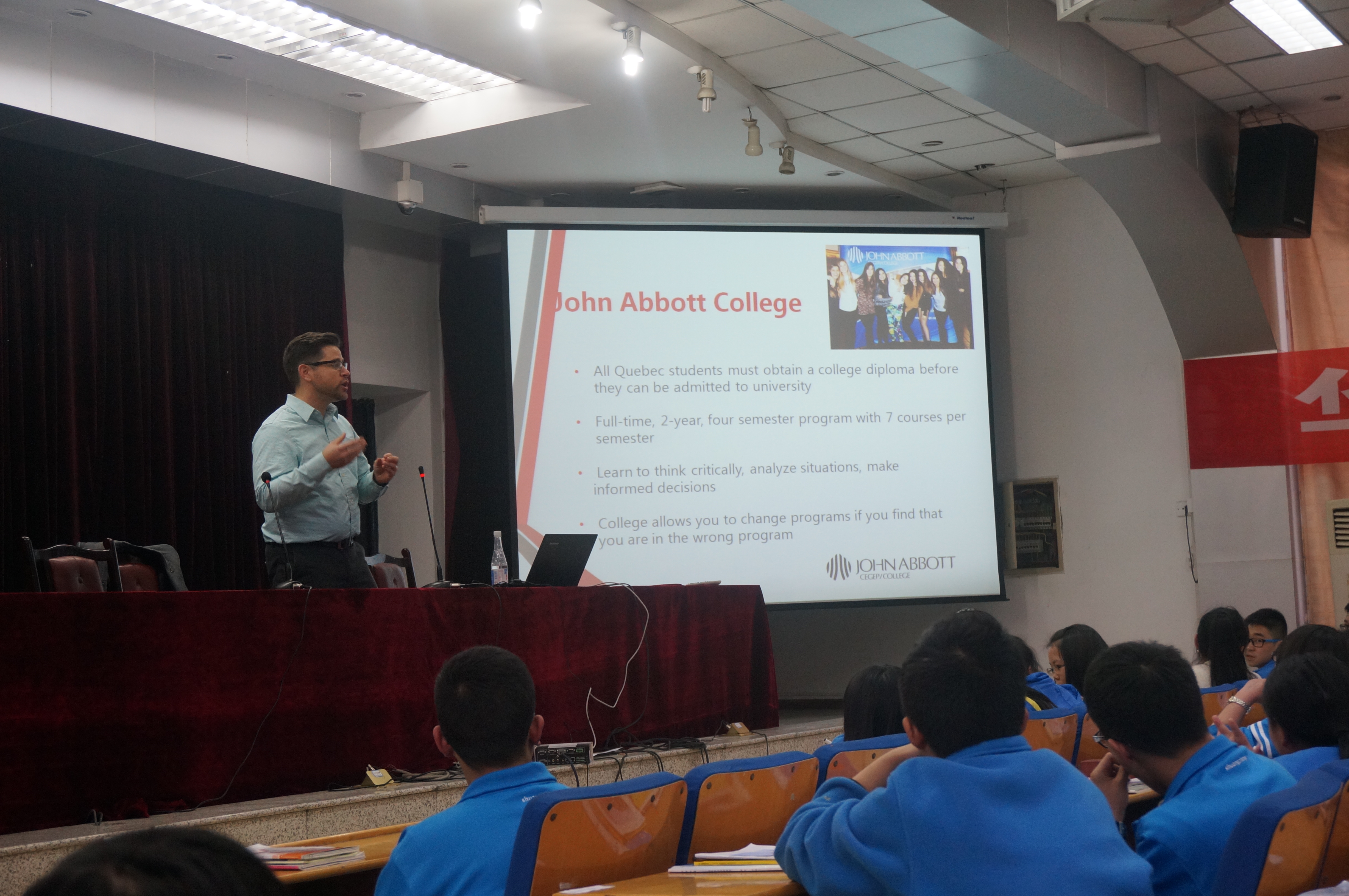 隨后,Darryl Climan主任來到學(xué)術(shù)演講廳,與等候在此的雙中學(xué)子們親切交流。Darryl Climan主任詳細(xì)介紹了加拿大的國情和文化,并且介紹了艾伯特學(xué)院的環(huán)境和學(xué)術(shù)優(yōu)勢,邀請我校學(xué)生今年暑假去加拿大體驗浸入式英語學(xué)習(xí)。在交流過程中,雙中學(xué)子展示出了良好的外交禮節(jié)和純正的英語口語, Darryl主任對我校英語教師的教學(xué)工作贊不絕口。