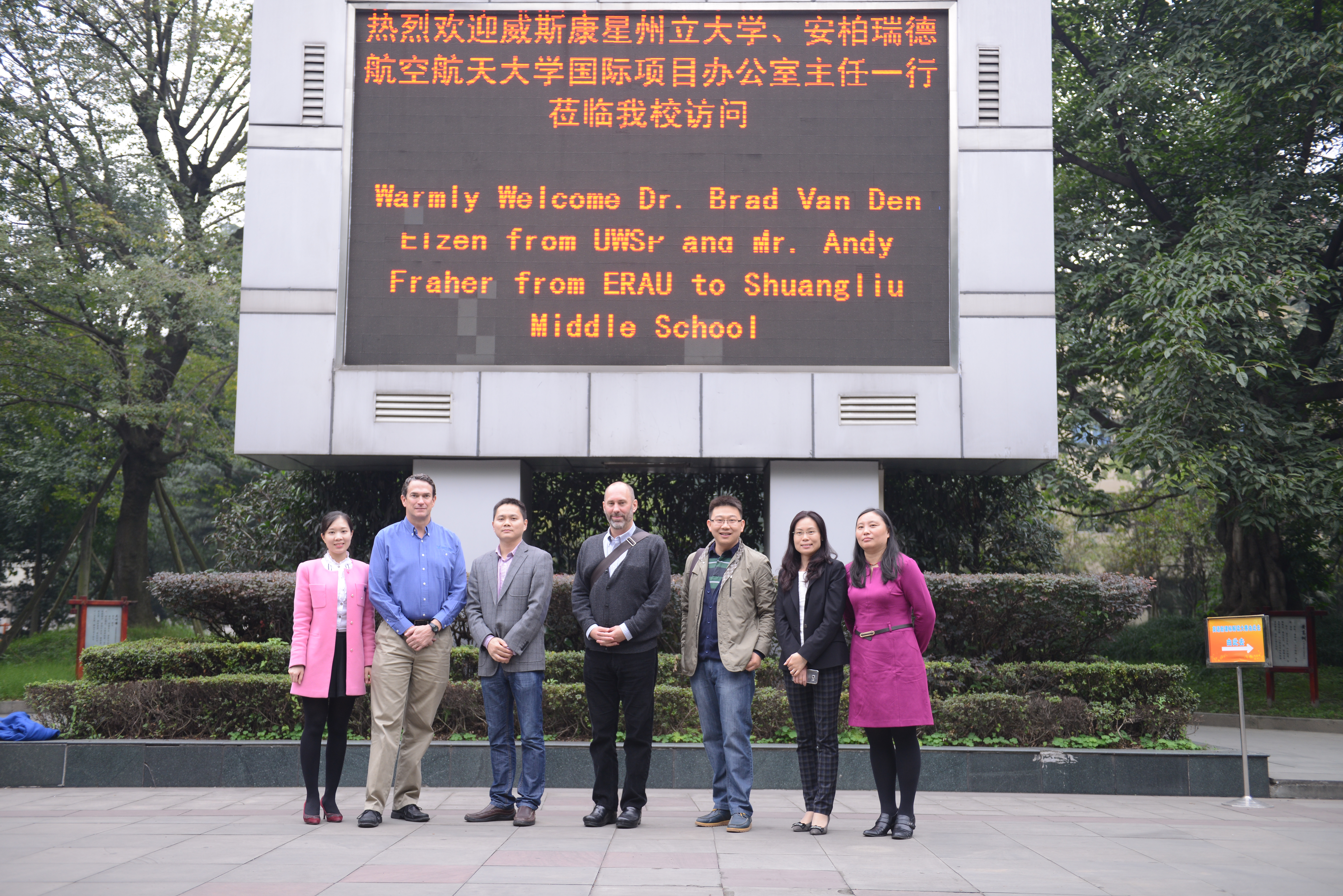 2015年11月3日,美國威斯康星州立大學(xué)國際項目辦公室主任Dr. Brad Van Den Elzen、安柏瑞德航空航天大學(xué)國際項目辦公室主任Mr. Andy Fraher一行蒞臨雙流中學(xué)交流訪問。雙流中學(xué)副校長徐天福,英語教師陳斌、覃梅熱情迎接并參加交流。