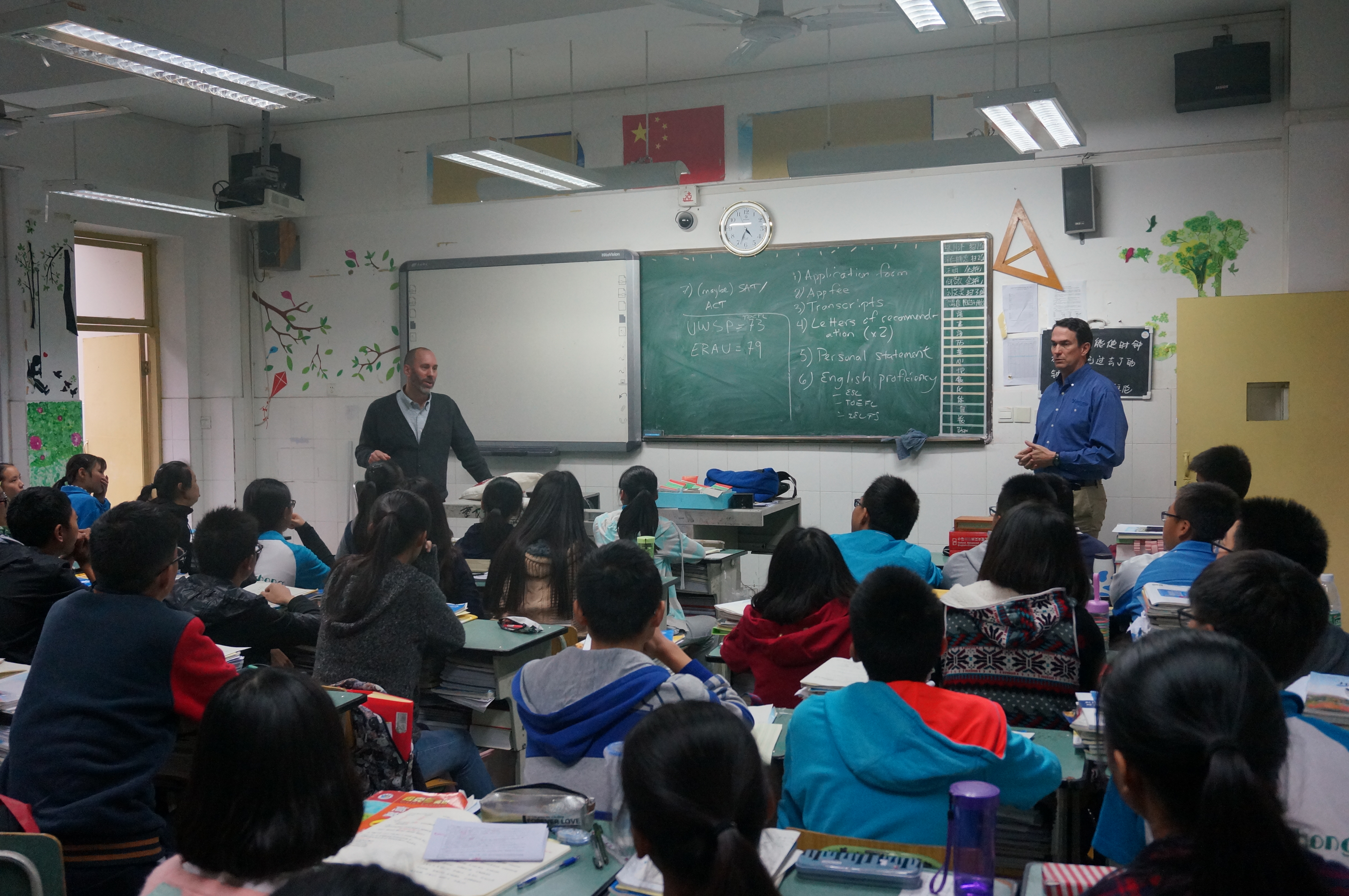 領(lǐng)導(dǎo)交流結(jié)束后,Dr. Brad Van Den Elzen和Mr. Andy Fraher主任來到高一年級國際英才班8班,為同學(xué)們講解了美國大學(xué)體系及美國大學(xué)的申請流程。兩位主任詼諧幽默的語言,不時引來陣陣笑聲。在接下來的互動環(huán)節(jié)中,同學(xué)們就留學(xué)考試、學(xué)費、住宿等一系列問題進行了詳細咨詢,現(xiàn)場氣氛十分活躍。交流過程中,雙中學(xué)子展現(xiàn)出來的良好外交禮節(jié)和英語口語, 得到了兩位主任的高度認可和贊揚。