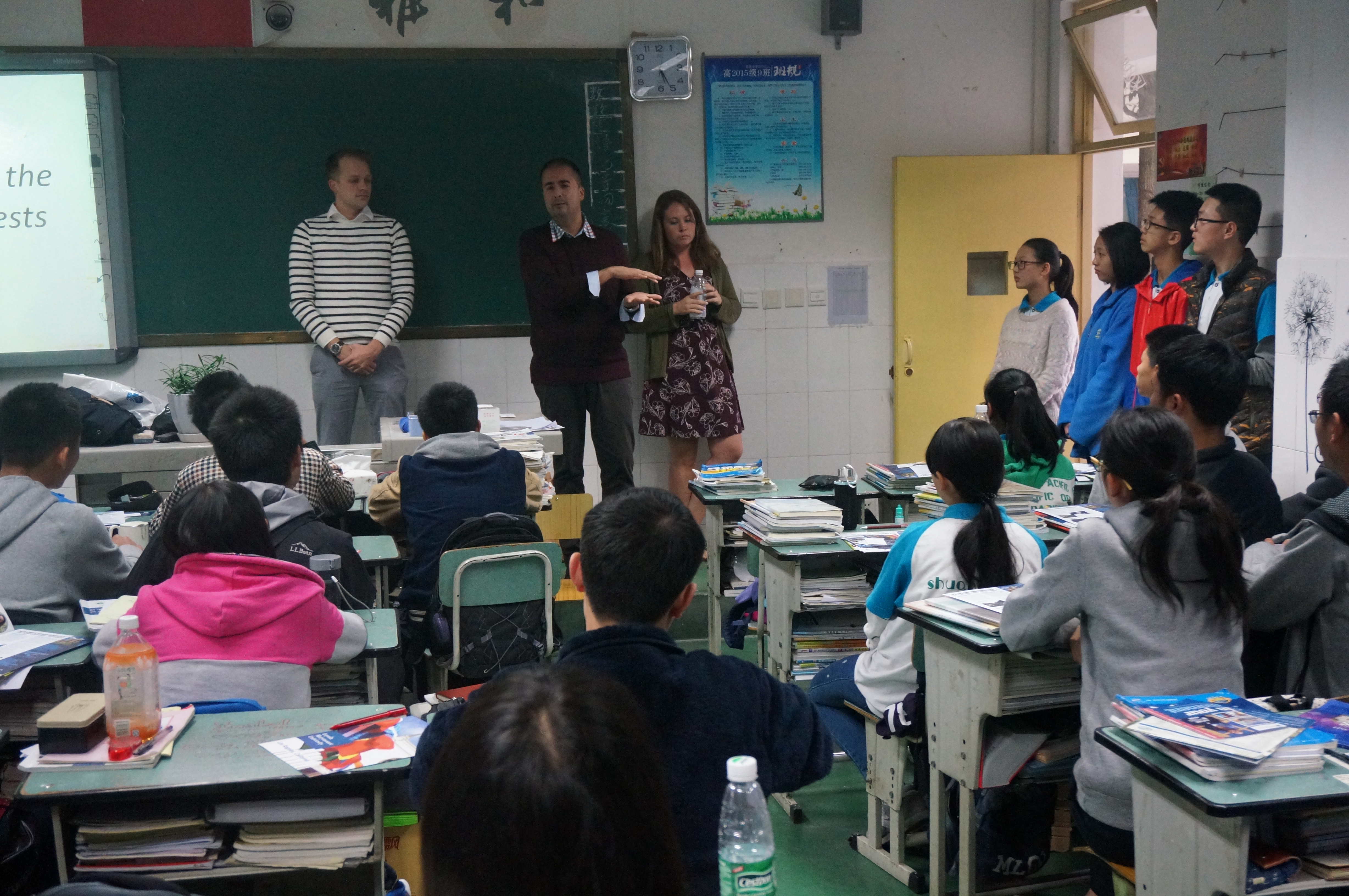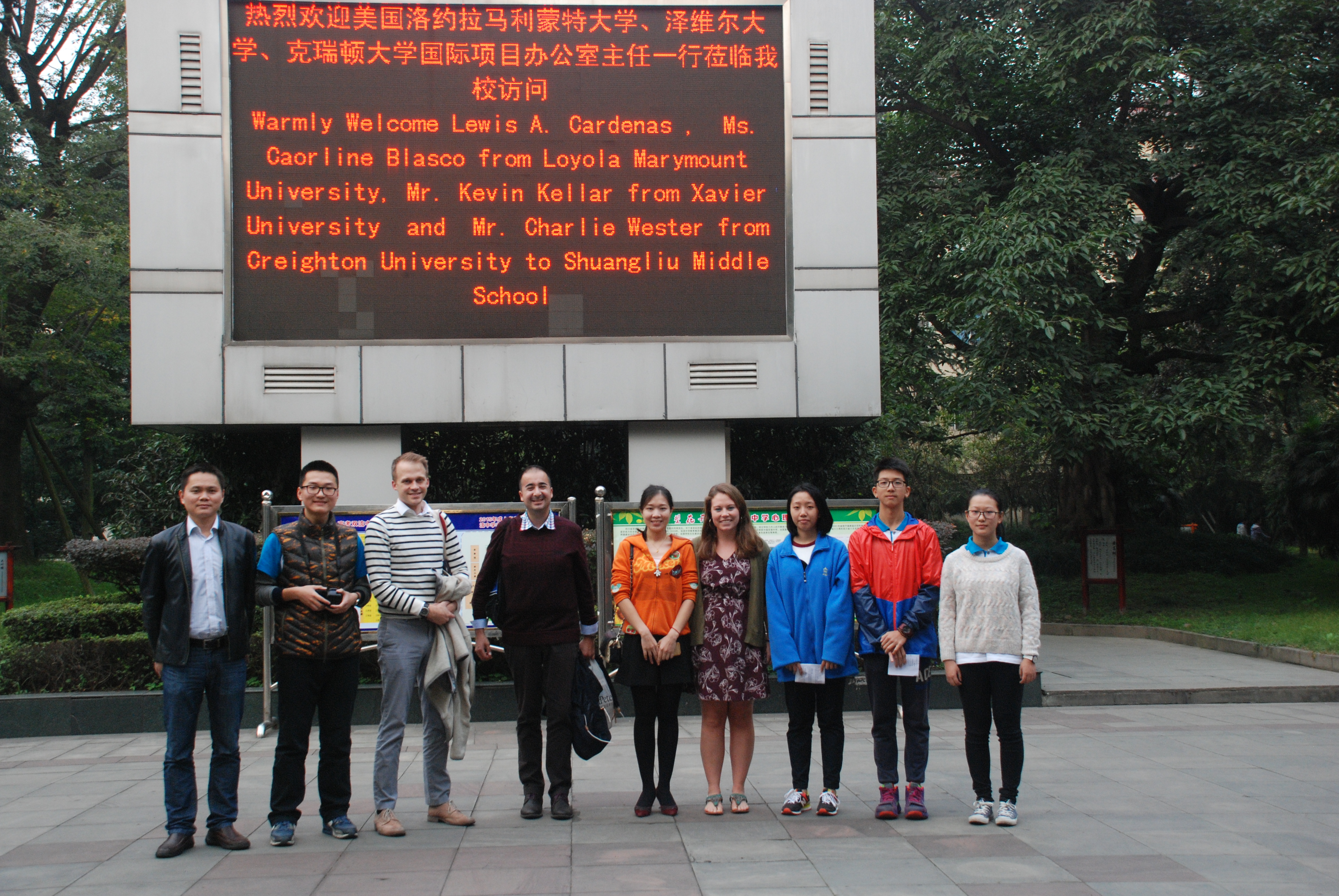 11月6日下午,美國三所耶穌天主教大學(xué)貴賓訪問了雙流中學(xué)。 他們分別是來自圣彼得大學(xué)的Lewis A. Cardenas,洛約拉馬利蒙特大學(xué)的Ms. Caorline Blasco ,以及澤維爾大學(xué)的Mr. Kevin Kellar。 學(xué)校徐天福副校長,英語教師陳斌、覃梅,以及來自高一國際英才班(9)班的4位志愿者同學(xué)熱情迎接并參加交流。