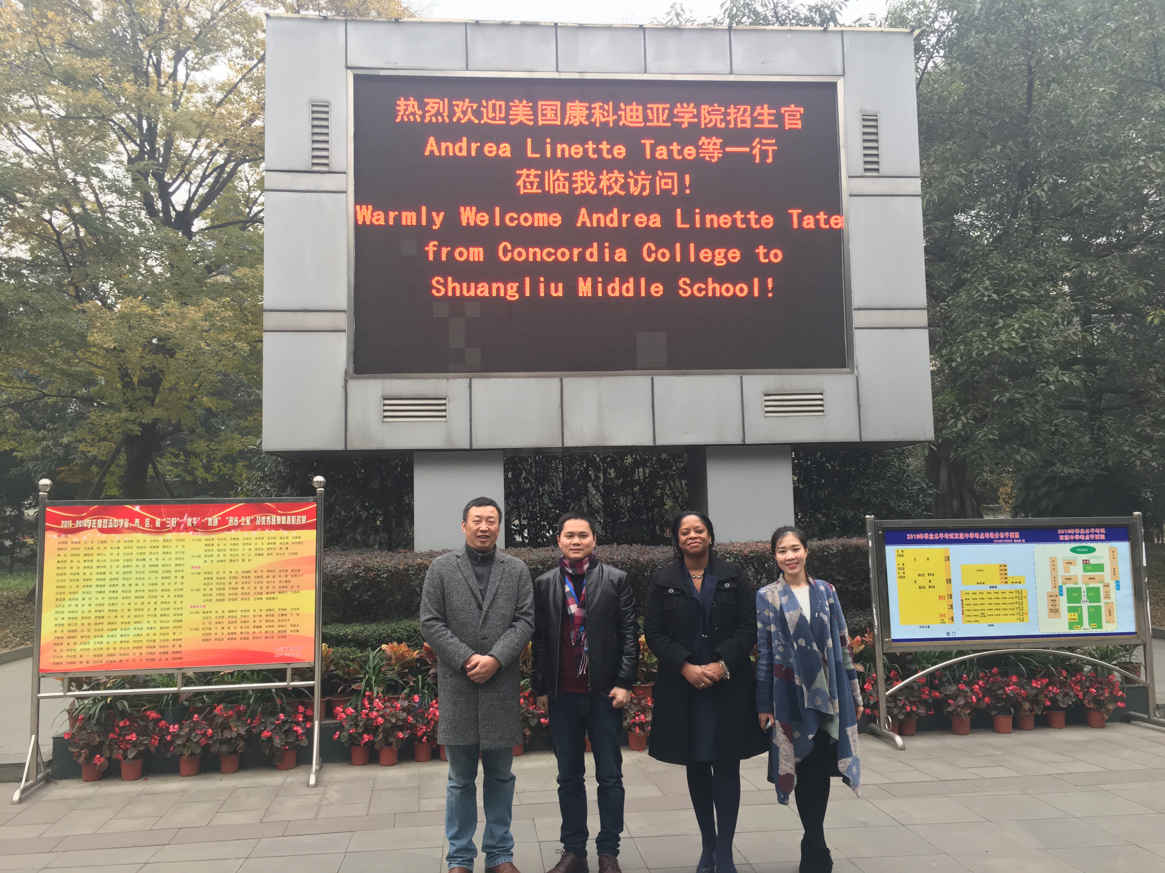 2016年12月20日下午,美國(guó)康科迪亞學(xué)院招生官Andrea Linette Tate等一行蒞臨雙流中學(xué)交流訪(fǎng)問(wèn),學(xué)校徐天福副校長(zhǎng)與英語(yǔ)老師覃老師熱情迎接并帶領(lǐng)其參觀(guān)校園。
