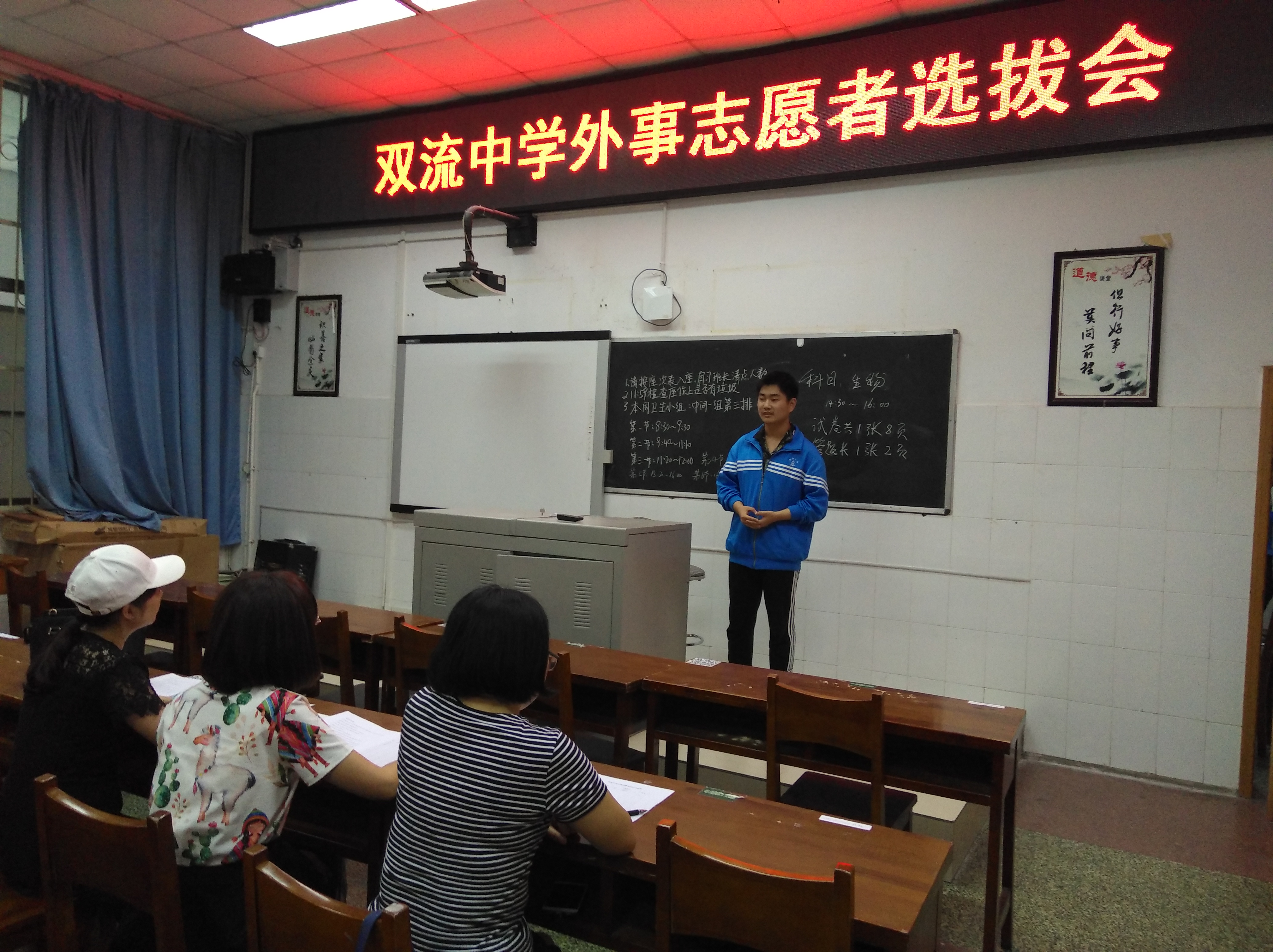 培訓(xùn)會伊始,陳斌老師給同學(xué)們進行了國際禮儀知識的培訓(xùn)并介紹了選拔面試流程及規(guī)則。面試通過英文自我介紹和問答交流考察了同學(xué)們的語言能力、思維能力和溝通能力,并調(diào)查了他們的特長和服務(wù)意向,以此作為選拔的重要依據(jù)。面試中同學(xué)們展現(xiàn)出來的良好綜合素質(zhì)和志愿者服務(wù)精神得到了面試官的高度贊揚和認(rèn)可。最終面試將選拔15名志愿者參與7月16 AFS組織的“美國青年學(xué)生來華學(xué)習(xí)漢語暑期項目”中華文化體驗課程。屆時將有29名美國中學(xué)生到雙流中學(xué)參觀學(xué)習(xí),將有力推動雙流中學(xué)教育國際化進程。