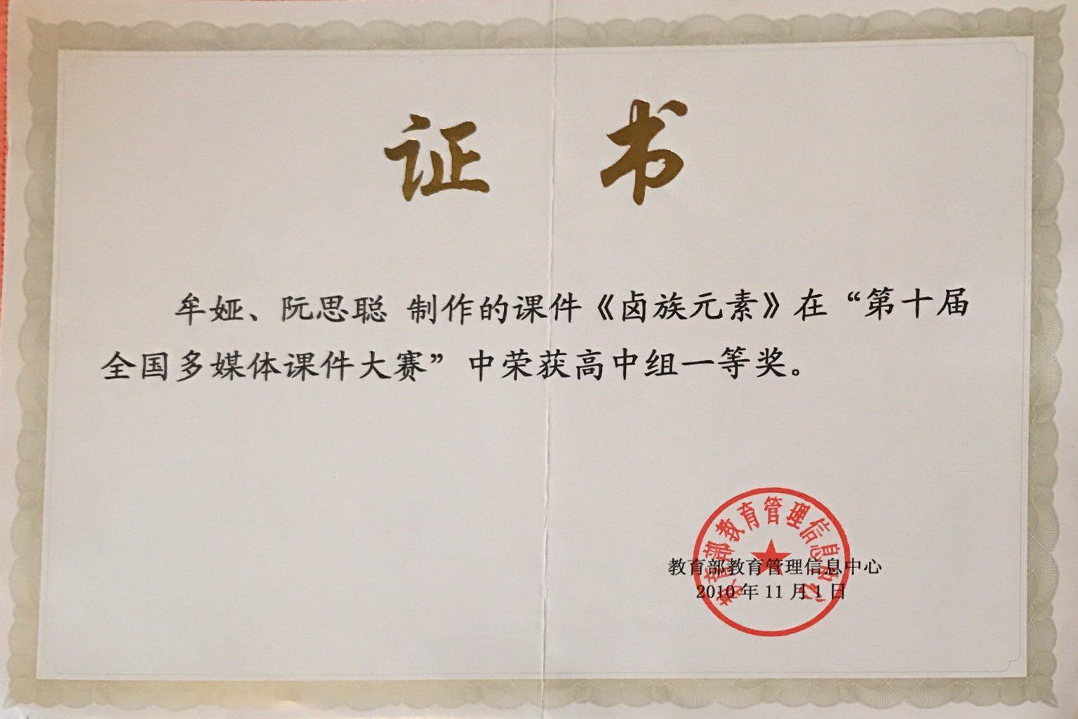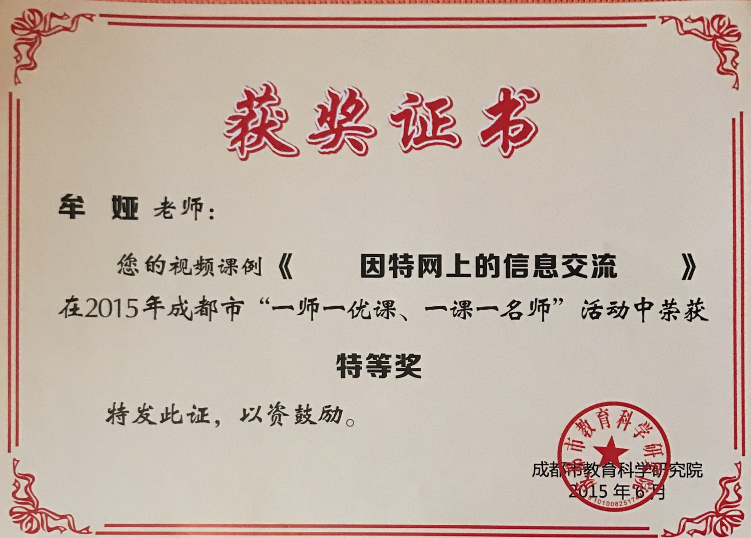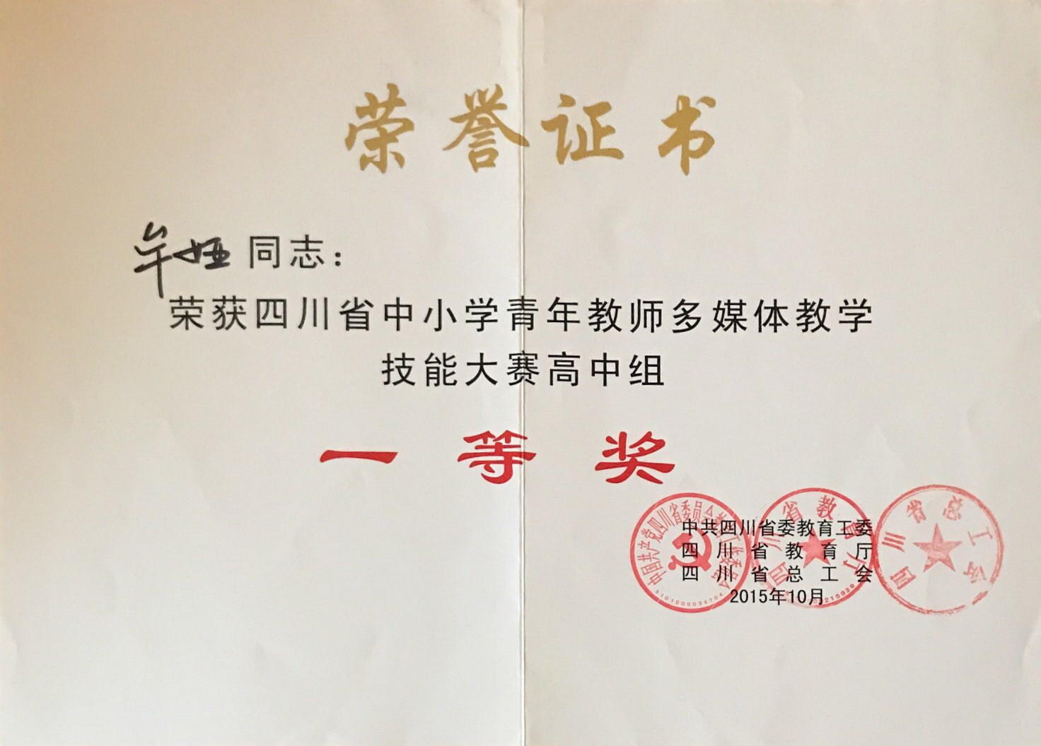 2014年在雙流縣中小學青年教師多媒體課件教學技能大賽中榮獲高中組特等獎,被推送參加2014年參加成都市百萬職工多媒體課件教學技能大賽榮獲高中組一等獎,被選入成都代表隊2015年10月參加四川省中小學青年教師多媒體課件教學技能大賽,取得課堂實錄和現(xiàn)場操作總分高中組第一名,由四川省總工會授予四川省五一勞動獎章。