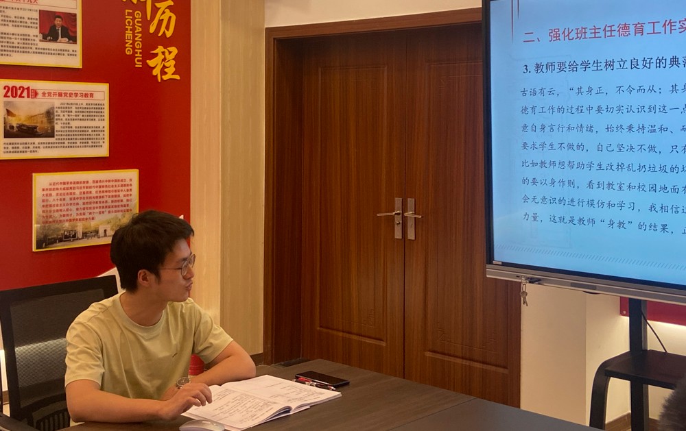 第二次活動(dòng)中工作室嚴(yán)曉港老師以“班主任德育工作實(shí)效性的強(qiáng)化策略”為主題進(jìn)行分享,嚴(yán)老師以“中學(xué)班主任德育工作開(kāi)展的現(xiàn)狀”“強(qiáng)化班主任德育工作實(shí)效性的策略”兩個(gè)部分進(jìn)行交流,最后提出問(wèn)題“學(xué)生把“擺爛”當(dāng)光榮,還嘲笑其他受表?yè)P(yáng)的同學(xué),該怎么引導(dǎo)?”,工作室老師們進(jìn)行討論。談?wù)摻Y(jié)束后老師們感悟道中學(xué)班主任要加強(qiáng)對(duì)學(xué)生的德育教育并非一蹴而就的,需要教師切實(shí)秉持尊重、愛(ài)護(hù)的態(tài)度對(duì)待每一個(gè)學(xué)生,加強(qiáng)對(duì)實(shí)踐的探索和分析,同時(shí)注意借鑒和學(xué)習(xí)前人好的方式、方法,切實(shí)為學(xué)生良好道德行為的塑造貢獻(xiàn)自己的一份力量。