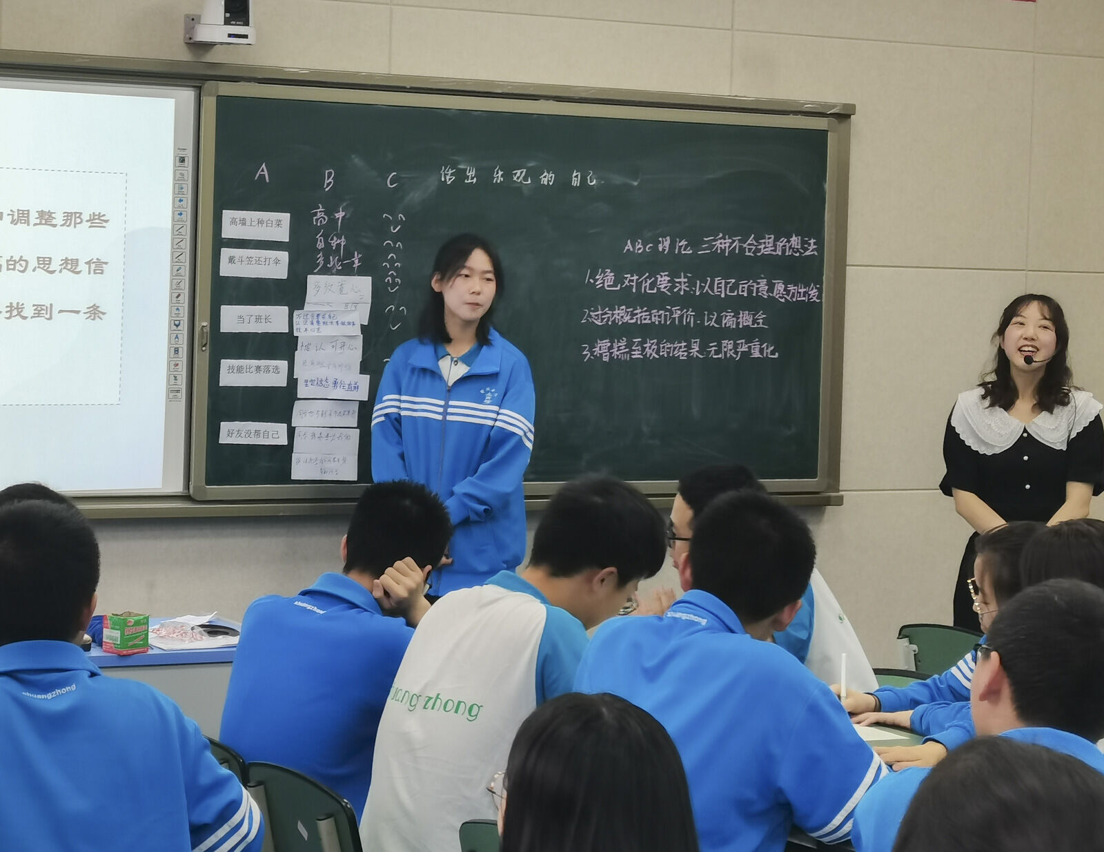 首先,工作室學(xué)員張琪敏帶來(lái)了以“活出樂(lè)觀的自己——我的ABC心法”為主題的班會(huì)課展示。整堂課共有五個(gè)環(huán)節(jié),分別是“情緒調(diào)查”、“視頻引入——秀才的夢(mèng)”、“情緒ABC理論”、“三種常見不合理想法”和“活出樂(lè)觀的自己”。學(xué)生通過(guò)參照“情緒ABC理論”,檢查和審視自己的想法,及時(shí)改變和調(diào)整那些不合理的、消極低迷的、讓人不幸福的思想信念。從鏈條中間打破,另辟蹊徑,尋找到一條通往積極情緒體驗(yàn)的康莊大道。