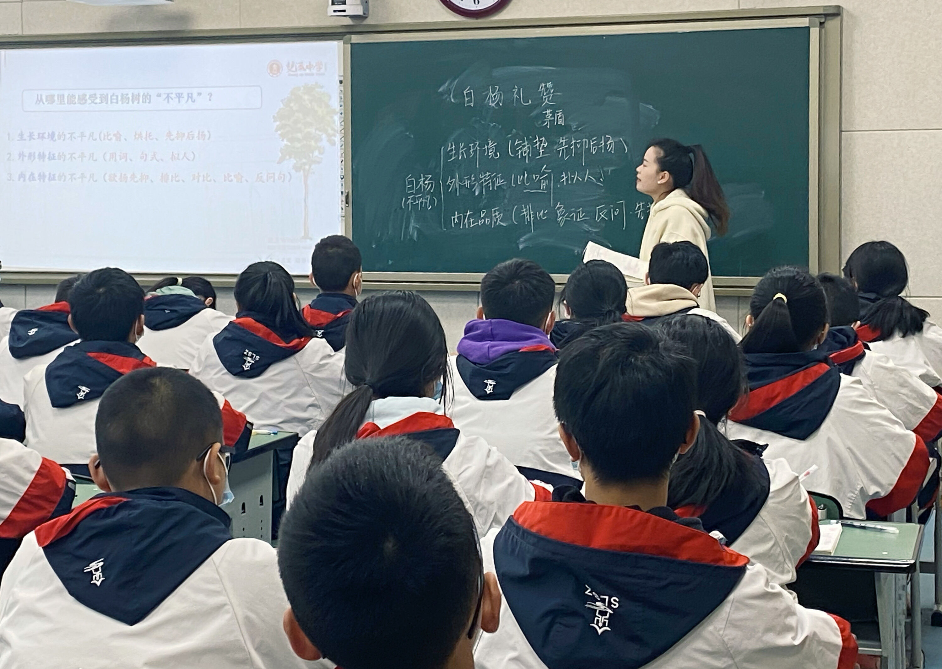 陳老師引領(lǐng)學(xué)生重讀紅色經(jīng)典,禮贊不凡白楊。課堂做到了“胸中有溝壑”“眼中有方向”。以學(xué)前測(cè)為學(xué)情起點(diǎn),以此設(shè)定學(xué)習(xí)目標(biāo),真正做到了以學(xué)生為本。抓住《白楊禮贊》這一篇象征手法的特性,引導(dǎo)學(xué)生梳理散文線索,往“這一篇”散文之語(yǔ)句章法所表達(dá)的豐富甚至細(xì)微處行走,讓師生與作者達(dá)到“心與心的碰撞、交感”。