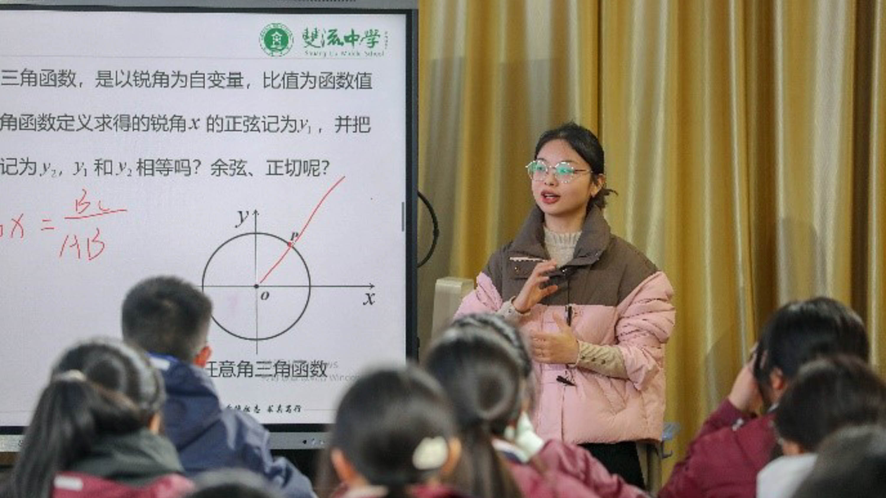 雙流中學(xué)翟芷藝?yán)蠋熞钥递x朗誦《春江花月夜》的視頻引入周期性變化的客觀現(xiàn)象,再以摩天輪觀光車為例建立單位圓的數(shù)學(xué)模型。然后以問題串的方式引導(dǎo)學(xué)生探究動(dòng)點(diǎn)的坐標(biāo)與旋轉(zhuǎn)角度之間的函數(shù)關(guān)系,從而得到任意角三角函數(shù)的概念。