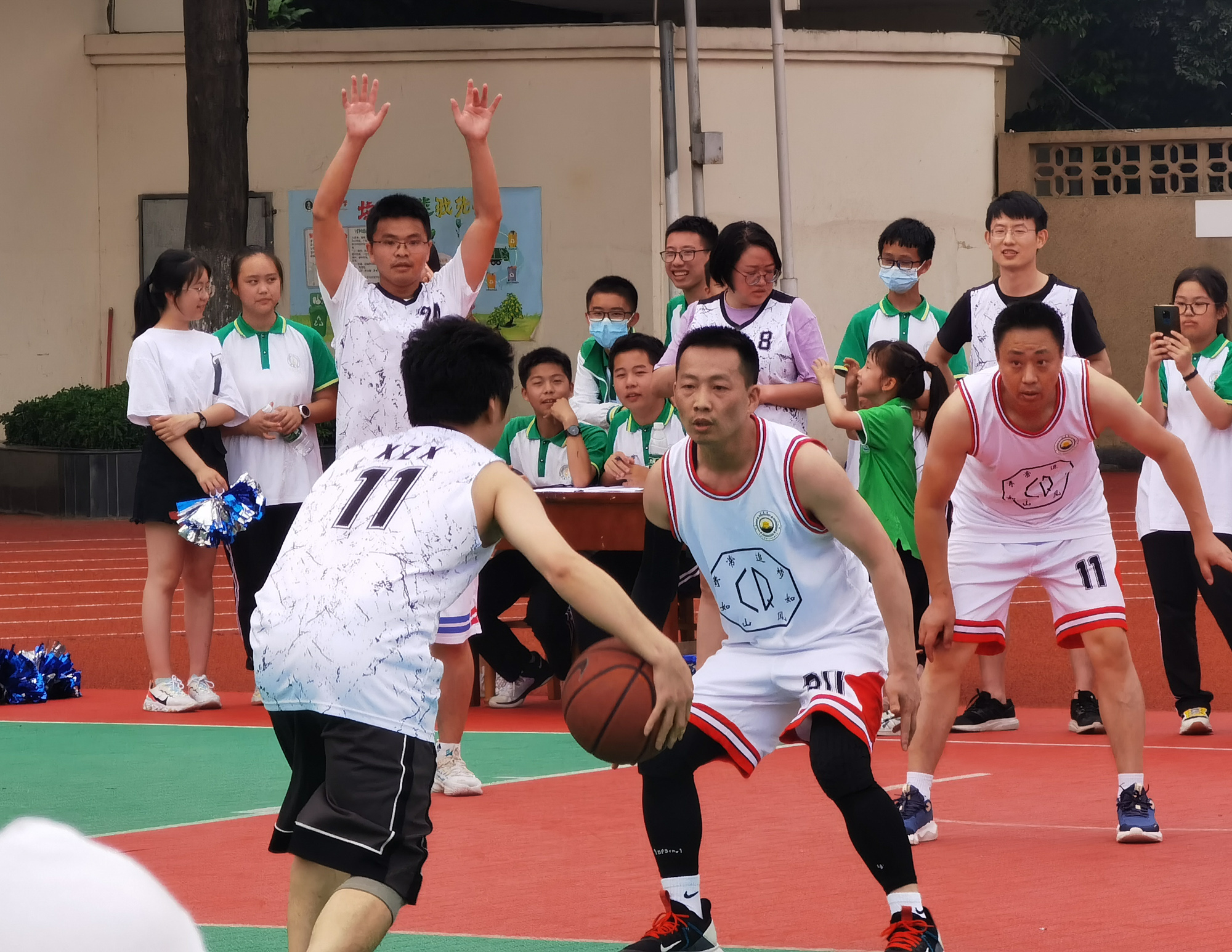 比賽繼續(xù),各隊(duì)隊(duì)員迅速投入比賽中,比賽更加激烈,場(chǎng)上的隊(duì)員們每球必爭(zhēng),逐漸進(jìn)入白熱化階段,每一個(gè)進(jìn)球都顯得彌足珍貴;場(chǎng)下隊(duì)員的心也懸在了嗓子眼上,每每到關(guān)鍵球,場(chǎng)下的觀眾們都不敢出聲,當(dāng)球落入籃網(wǎng)的那一剎,山呼海嘯般的掌聲歡呼聲迸發(fā)出來(lái)。懸念停留到了最后一刻。最終,教師代表隊(duì)以微弱的獲得勝利。
