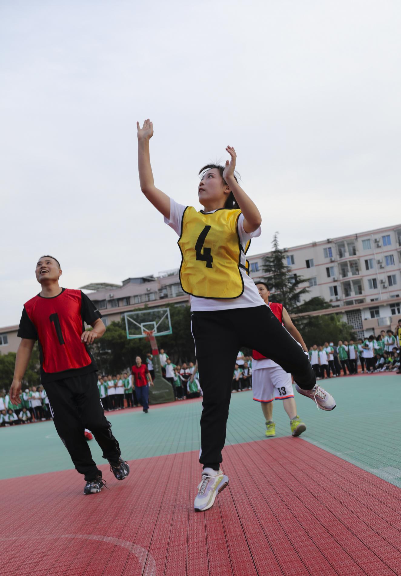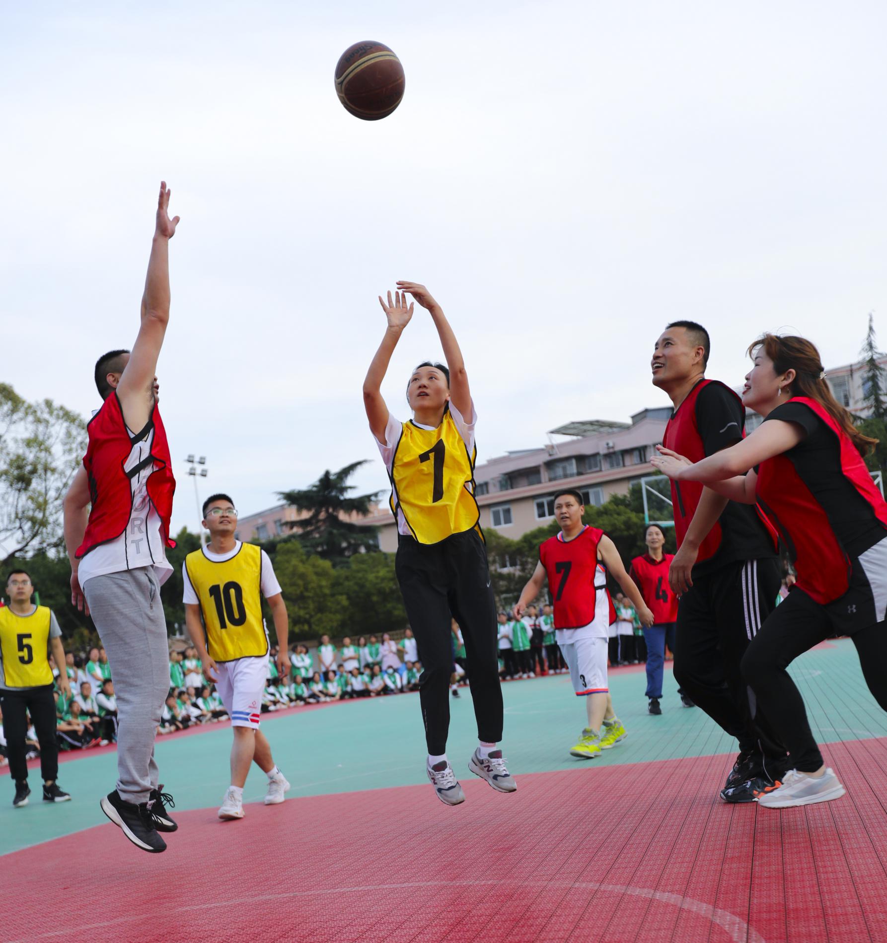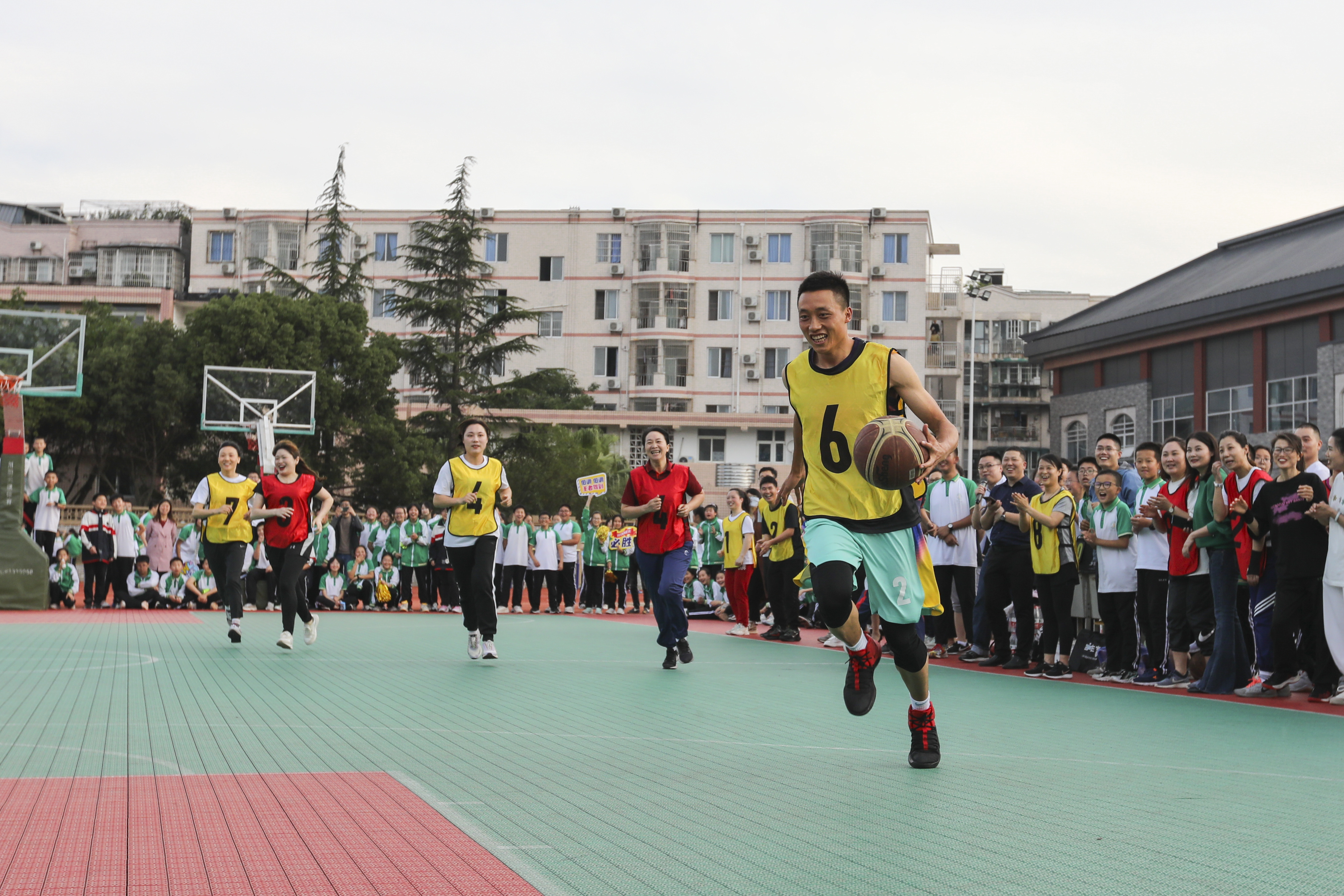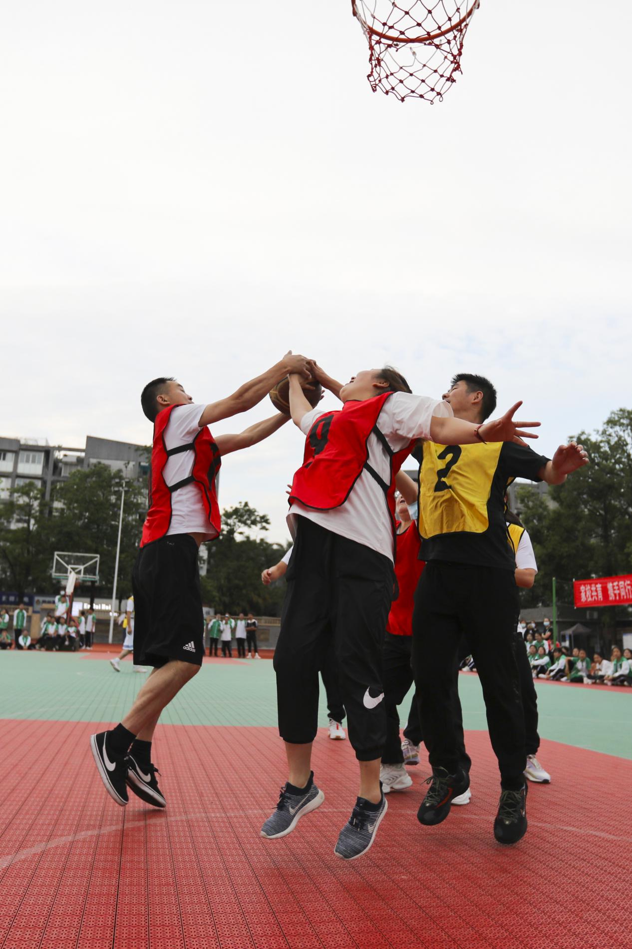 2022年5月19日下午,雙流中學(xué)舉行初中第二屆家校籃球友誼賽,由身著紅色球衣的家長代表隊(duì)迎戰(zhàn)身著黃色球衣的教師代表隊(duì)。身著紅色球衣的家長代表隊(duì)迎戰(zhàn)身著黃色球衣的教師代表隊(duì)
