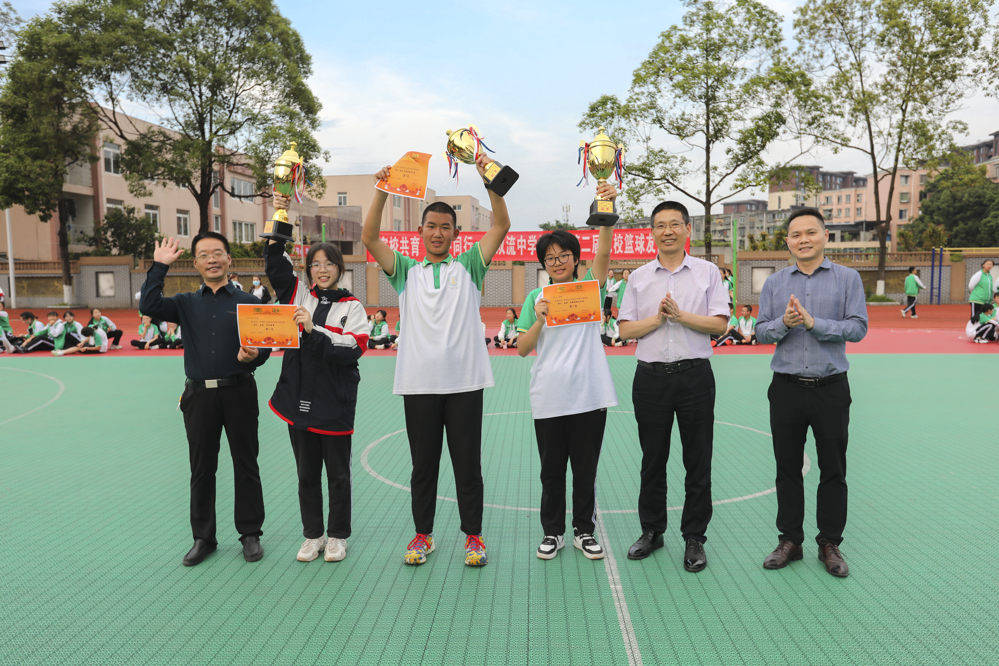 中場(chǎng)休息,令人激動(dòng)的“攜力·蓉光”系列籃球足球賽頒獎(jiǎng)儀式開始舉行。經(jīng)過近一個(gè)月的角逐,誕生出了男子、女子籃球賽冠軍和足球賽冠軍。在全體家長和同學(xué)們的見證下,學(xué)校黨委副書記向發(fā)友、副校長徐天福和藝體處主任張仕貴為孩子們頒發(fā)了獎(jiǎng)狀和冠軍獎(jiǎng)杯。
