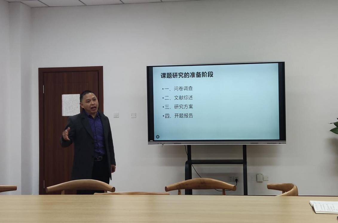 緊接著,陳老師著重介紹了課題研究的流程。陳老師指出,課題研究分為準備、實施、結(jié)題、推廣和申獎四個階段。作為一名資深的科研工作者,陳老師詳細地向工作室成員介紹了課題研究各個階段需要展開的工作流程:從調(diào)查問卷的設(shè)置到文獻綜述的撰寫;從研究方案的確定到開題報告的撰寫;從理論假設(shè)到邏輯推演;從實踐檢驗再到成果提煉;從工作報告、檢測報告、研究報告的撰寫到支撐材料的呈現(xiàn);從校內(nèi)外的推廣到課題申獎……每一個階段的具體流程,陳老師都進行了具體入微的指導(dǎo)。名師引領(lǐng),助力成長,陳老師的發(fā)言,不僅幫助工作室成員厘清了對課題研究重要性及課題流程的認識,更讓大家有效地克服了畏難情緒,堅定了從事教育科研、攻堅克難的信心和決心。