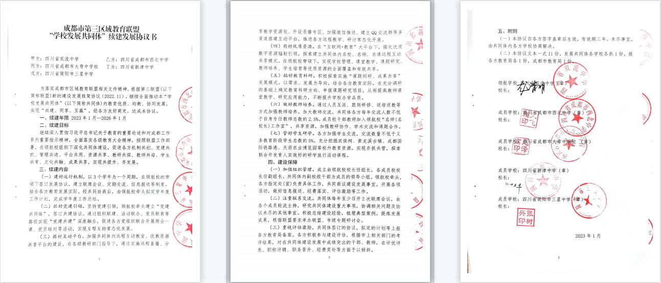 根據(jù)《成都市區(qū)域教育聯(lián)盟第三聯(lián)盟建設(shè)發(fā)展框架協(xié)議書(shū)》(2022.11)對(duì)第二輪協(xié)議的要求,四川省雙流中學(xué)共同體迎來(lái)了第二輪發(fā)展機(jī)遇。