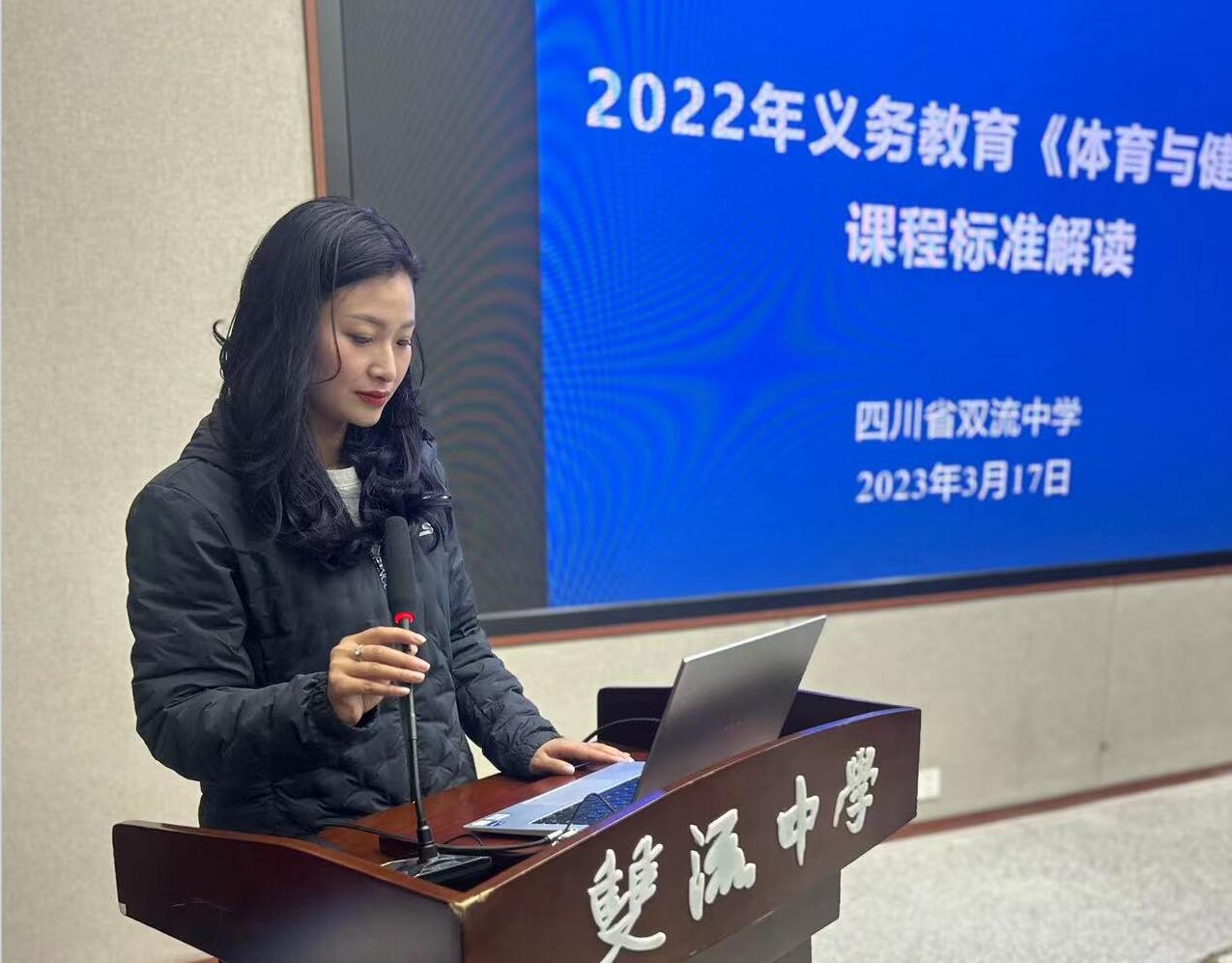 實(shí)踐的背后必定是強(qiáng)有力的理論支持,活動的第二個環(huán)節(jié)便是雙流中學(xué)老師對《義務(wù)教育體育與健康課程標(biāo)準(zhǔn)(2022年版)》的解讀。此次解讀以課程標(biāo)準(zhǔn)中體操類相關(guān)內(nèi)容為切入點(diǎn),由鄧漢波、盧丹、馮若倩、龍文華四位老師詳細(xì)闡述。