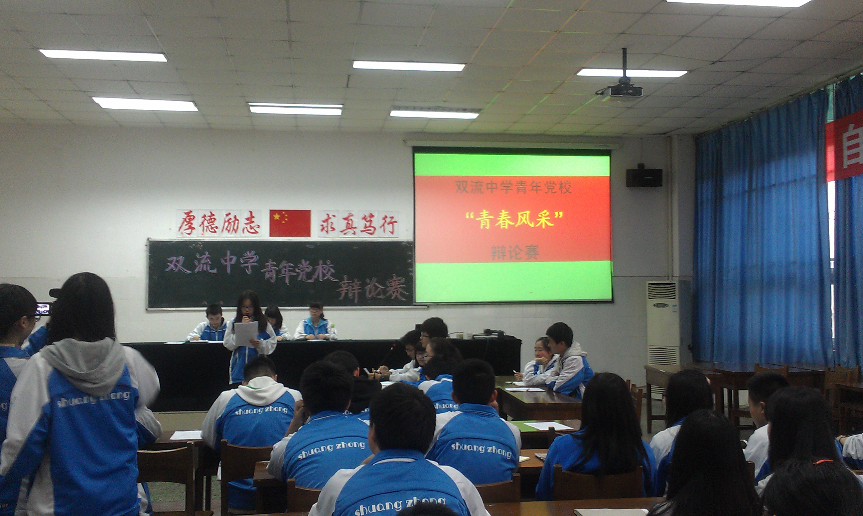 201442下午,雙流中學(xué)青年黨校的學(xué)員在多功能二廳開(kāi)展了一場(chǎng)激烈的辯論賽。本次辯論賽的辯題為:“知難行易,還是知易行難”。正方辯手為郭潔、陳東、黃韻璐和鄭民望同學(xué),反方辯手為王坡、周小蝶、葉志偉和張潔媛同學(xué)。比賽一開(kāi)始,正方一辯就開(kāi)始發(fā)難,她的精彩陳詞贏得了在場(chǎng)觀眾的熱烈掌聲。在攻辯階段,反方辯手葉志偉慷慨激昂、邏輯清晰、語(yǔ)言犀利,與正方辯手陳東激烈交鋒。雙方你來(lái)我往,火藥味十足,充分展現(xiàn)了雙中學(xué)子優(yōu)秀的語(yǔ)言功底,和思辨能力。特別是能以社會(huì)熱點(diǎn)問(wèn)題、現(xiàn)實(shí)生活中的事例來(lái)作為自己的論點(diǎn),很有生活氣息,也更貼近學(xué)生的生活。最后,正方以微弱的優(yōu)勢(shì)取得勝利。