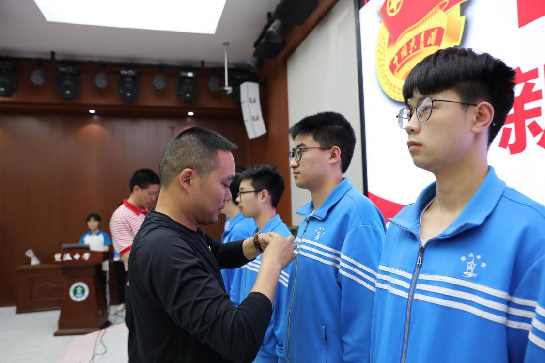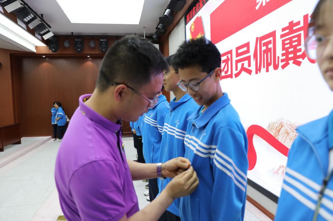 出席入團(tuán)儀式的校領(lǐng)導(dǎo)為新團(tuán)員代表佩戴團(tuán)徽