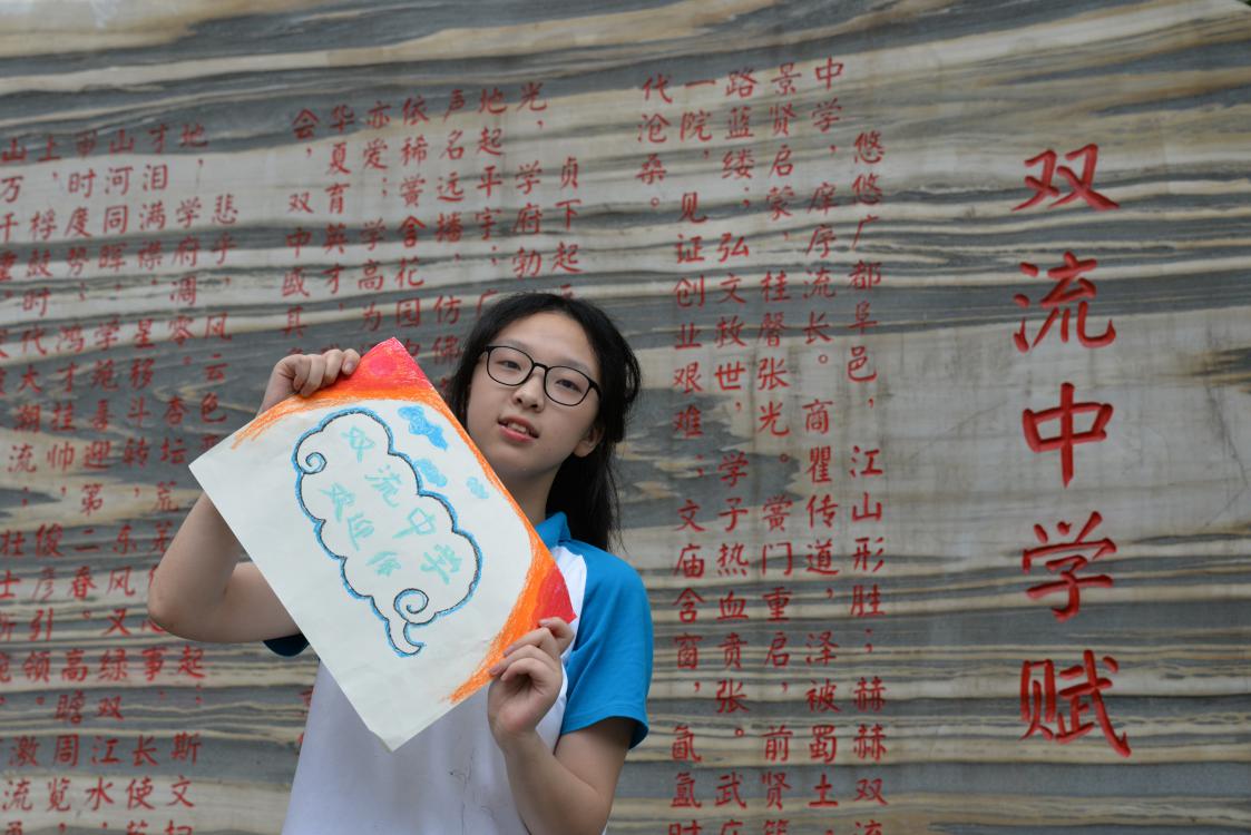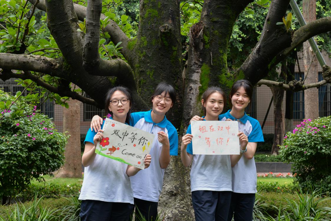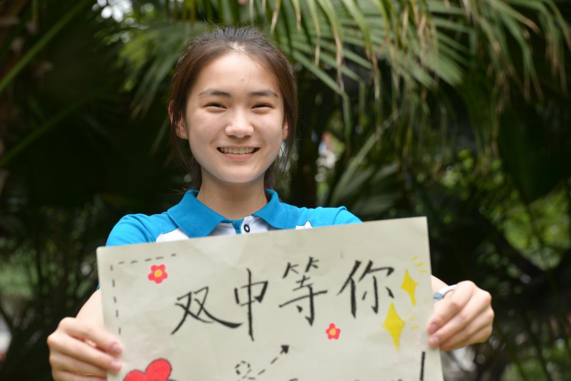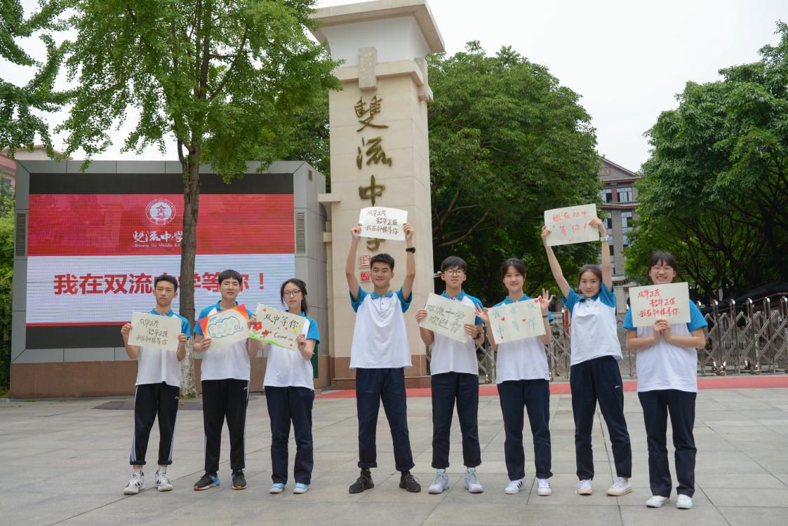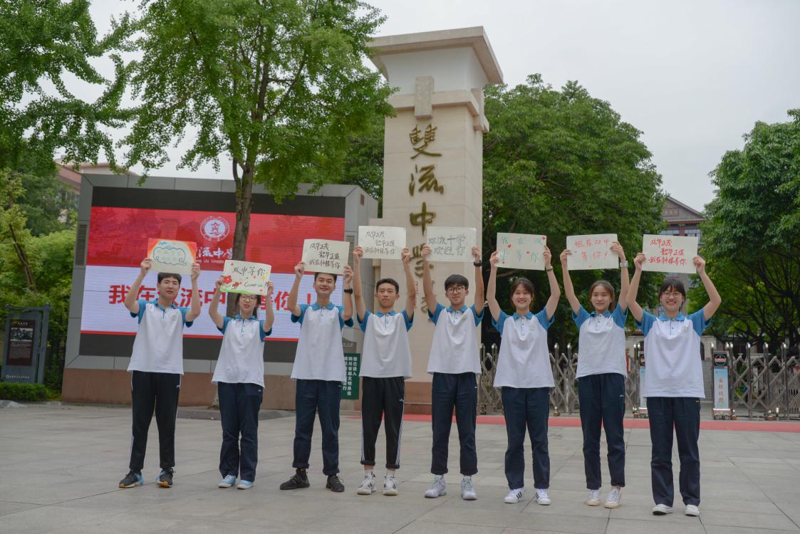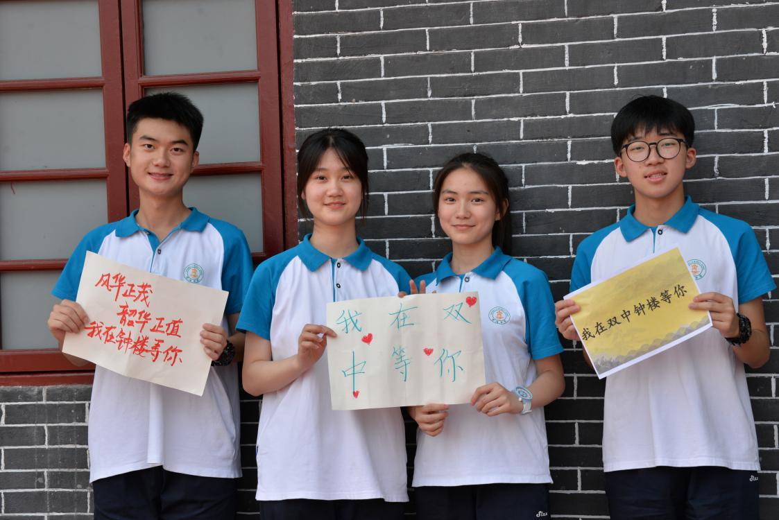 雙中學(xué)生在校門口拍攝照片鼓勵(lì)新生考入雙中