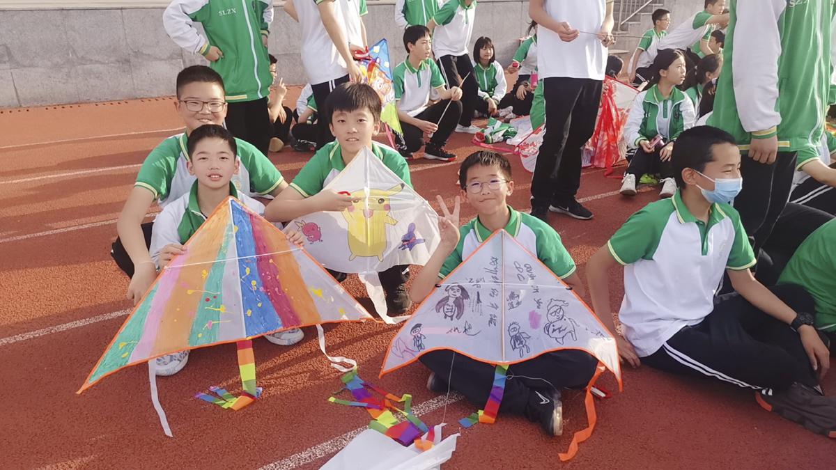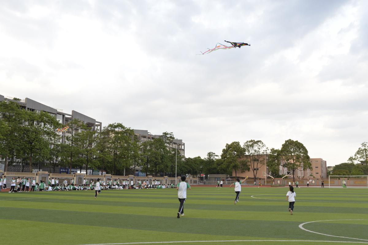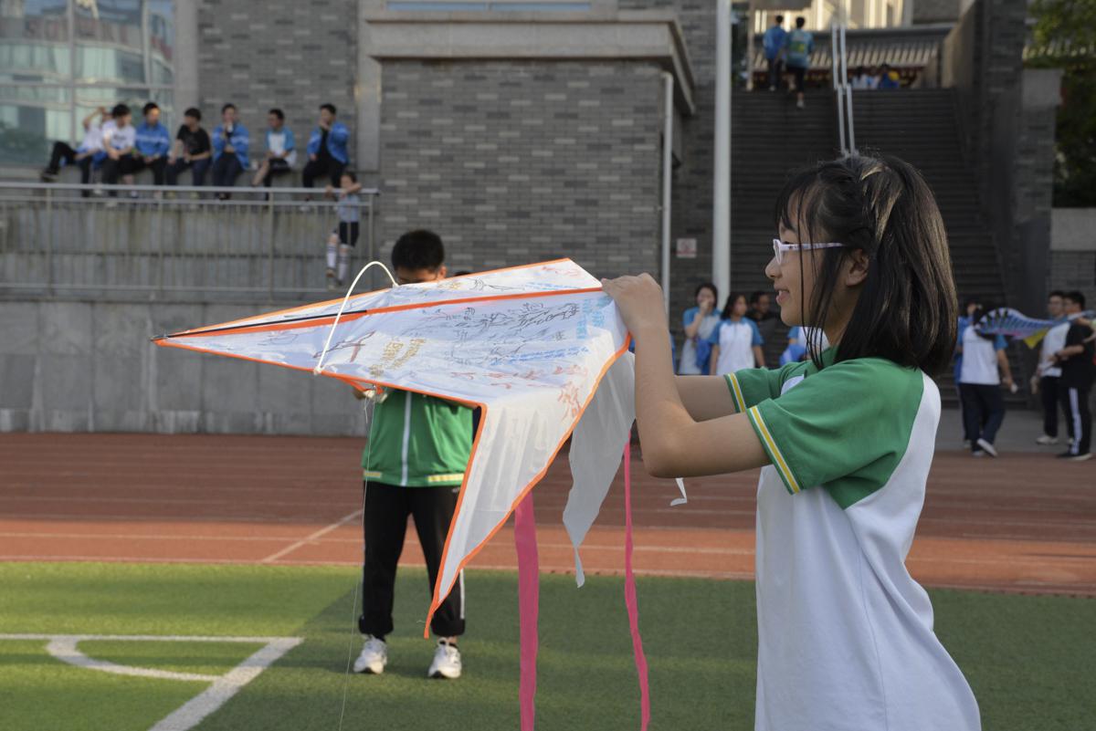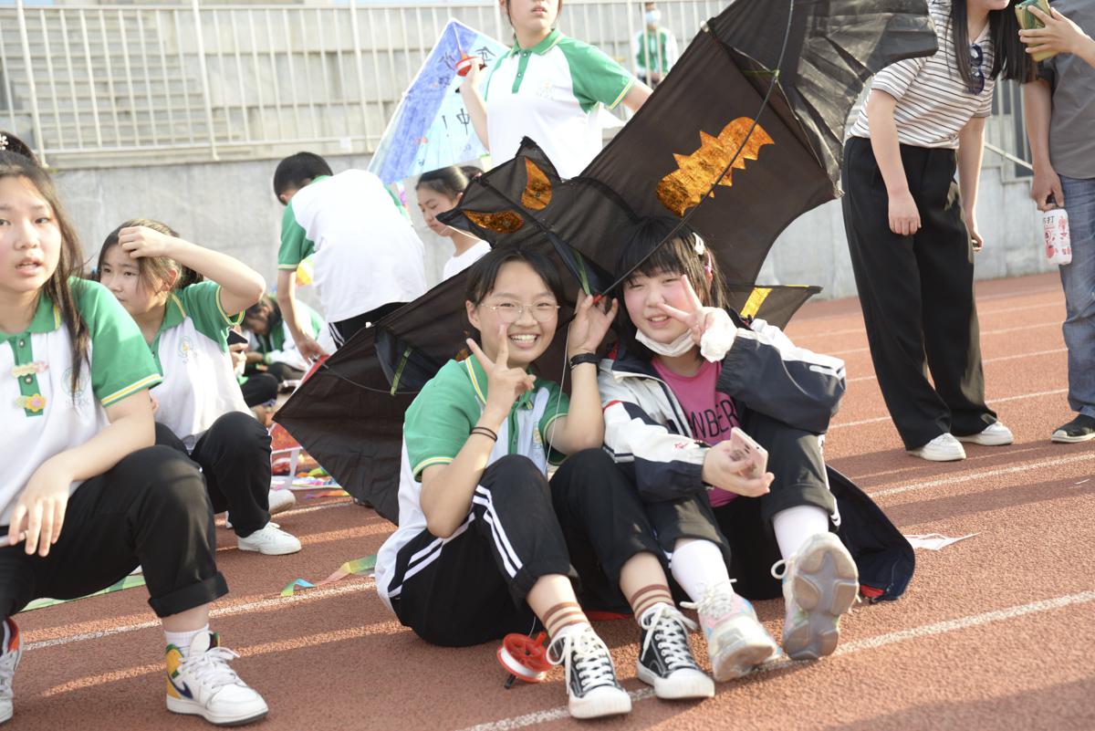 同學(xué)帶上自制風(fēng)箏到操場(chǎng)試